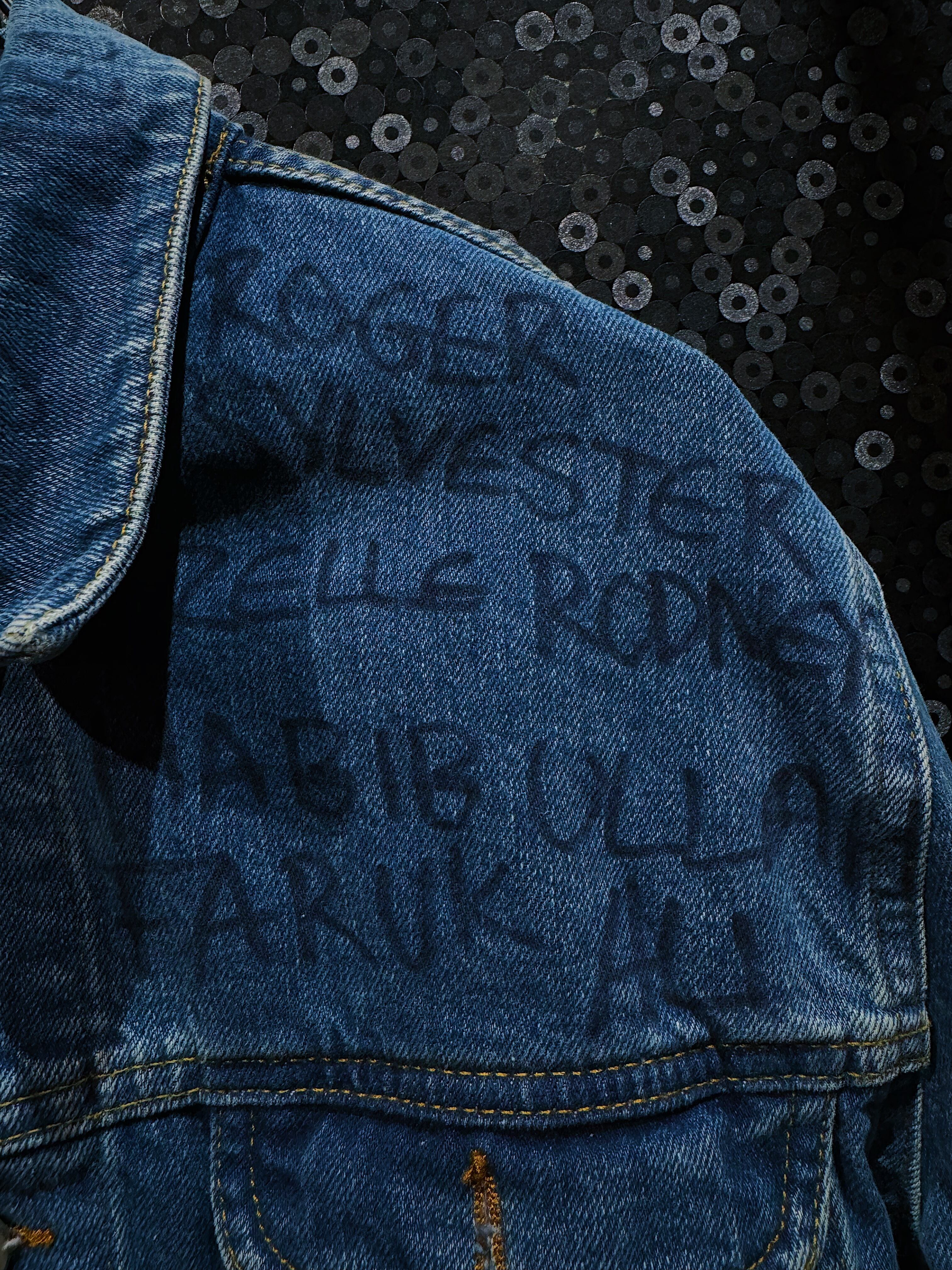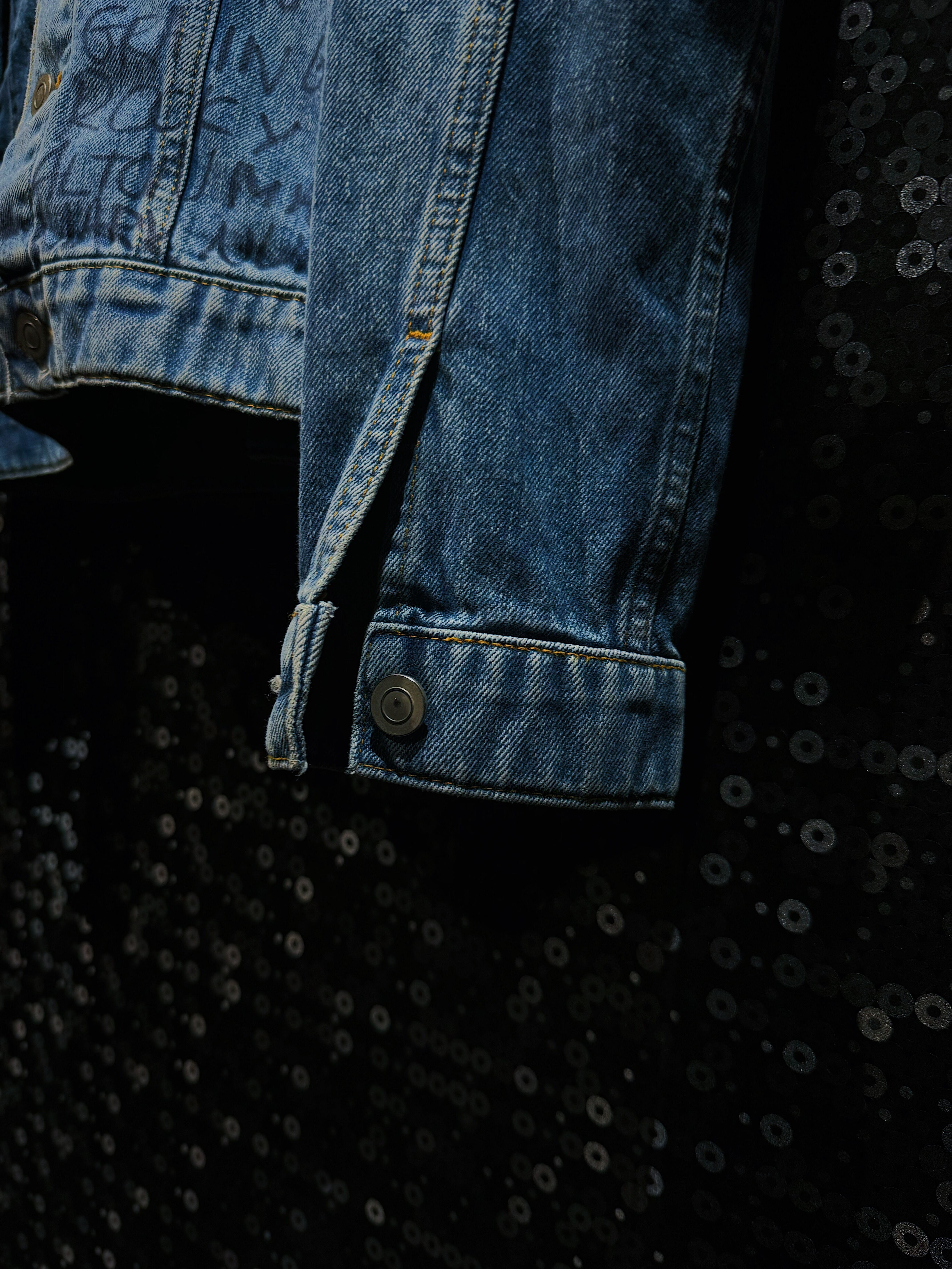 このデニムジャケットは、ASOS(エイソス)の製品であり、トルコ製のアイテムです。全体に手書き風の黒い文字が散りばめられたデザインが特徴的で、ユーズド感のあるウォッシュ加工が施されています。