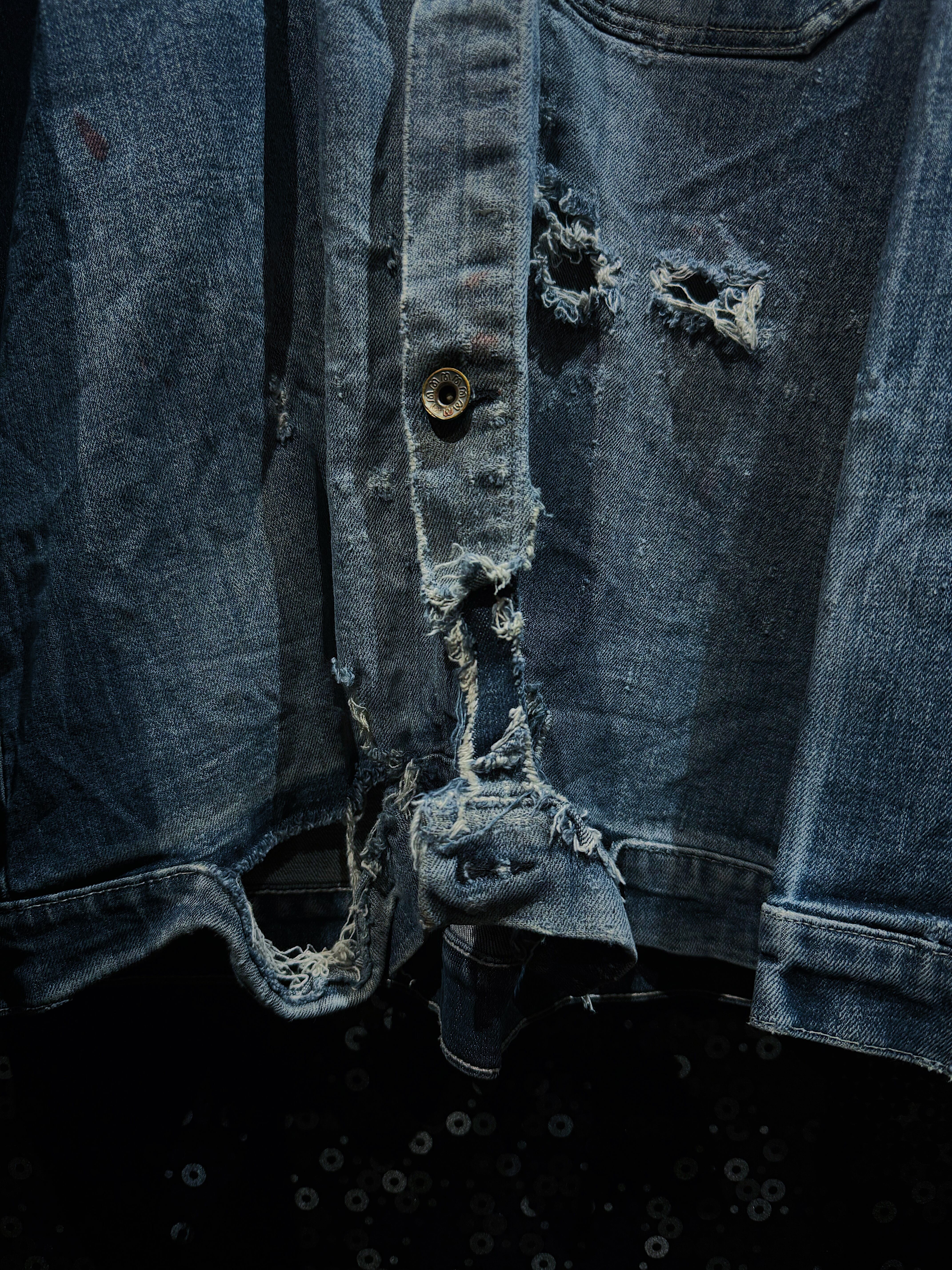 ダメージ加工が施されたデザインで、胸ポケット部分の大きな裂けやフロントのボタンホール周辺のほつれなどが、ユーズド感を強調しています。全体的にフェードがかった色合いで、ヴィンテージ感のある仕上がりとなっています。