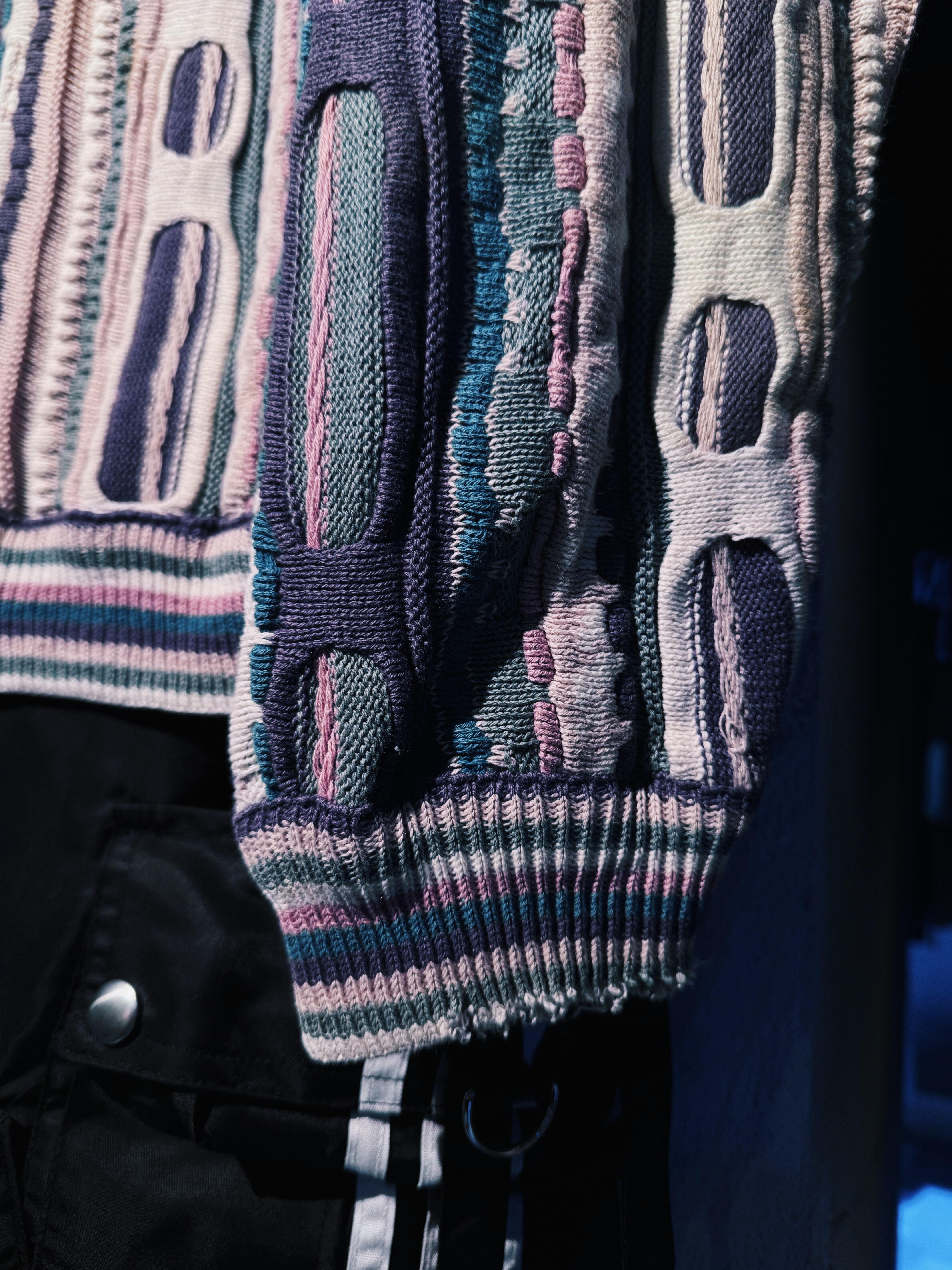 高級感溢れるカラーリングで複雑な織り柄が魅力的な3Dニット。渋すぎず派手すぎない色合いは、様々なスタイリングに馴染みやすく着方次第で綺麗目やストリートにもなる万能さがあるユーロヴィンテージ。
