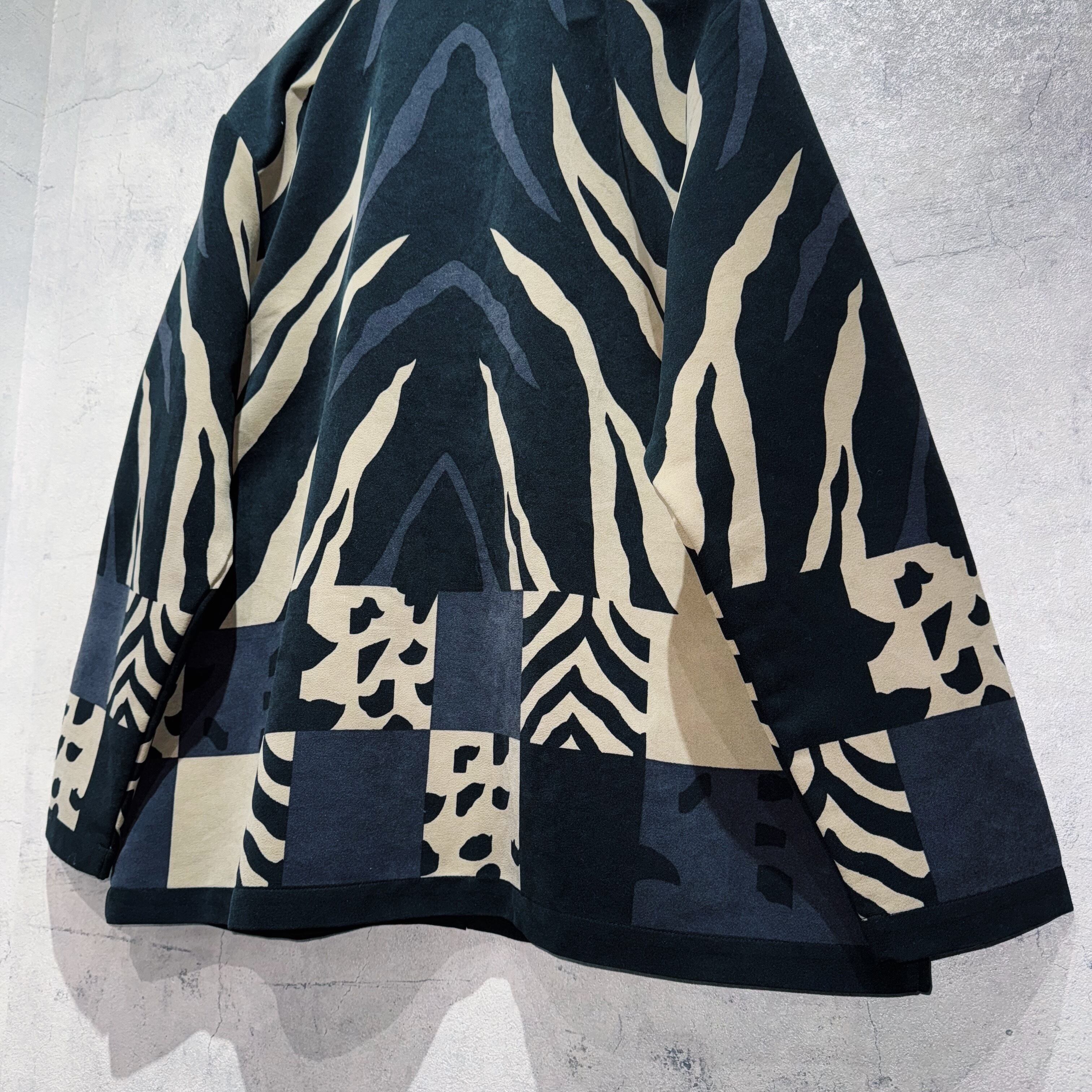 ブラックのボディにエスニック且つアートさも感じる個性的なグラフィックを載せたパターンデザインライトジャケット。