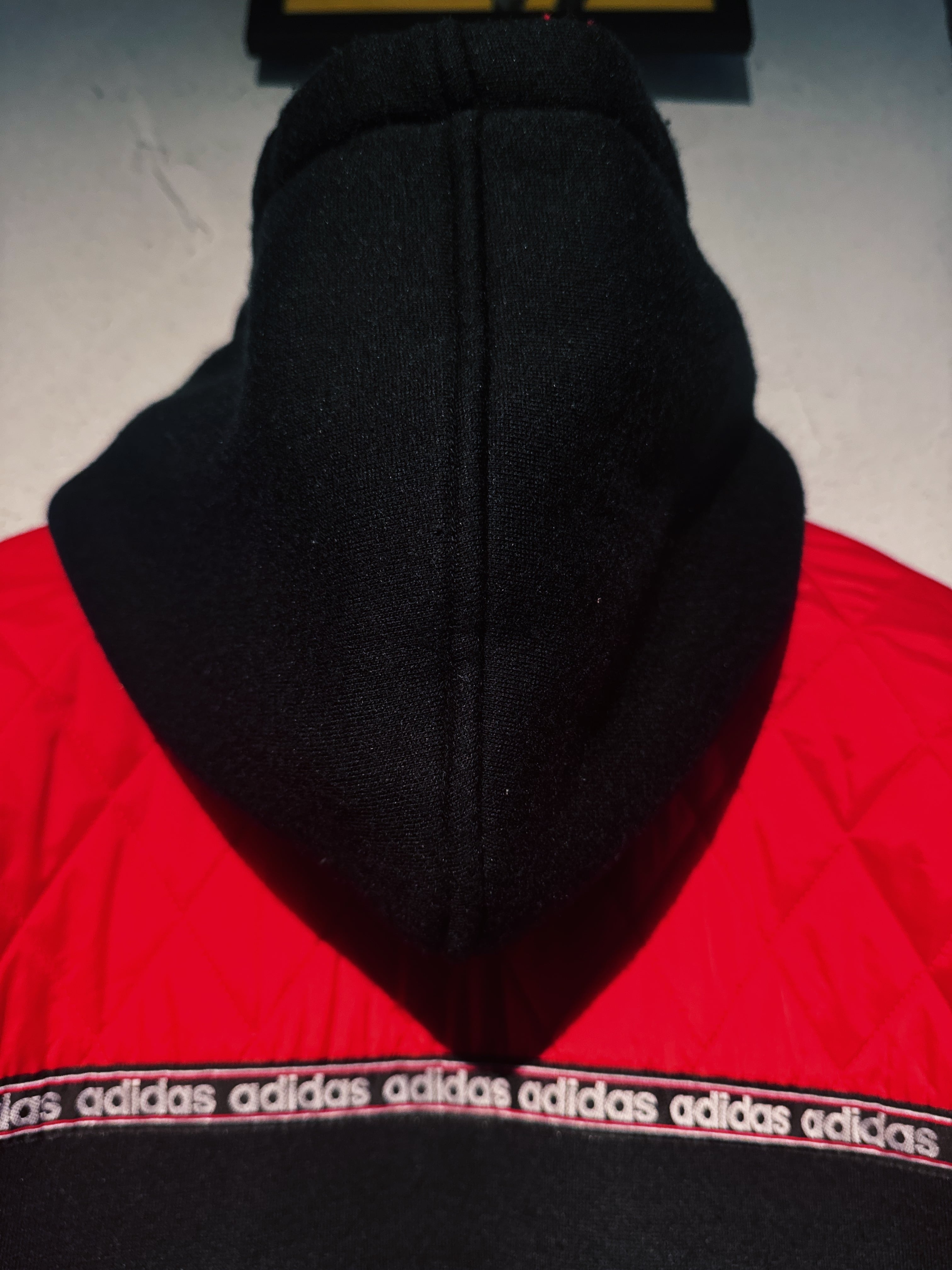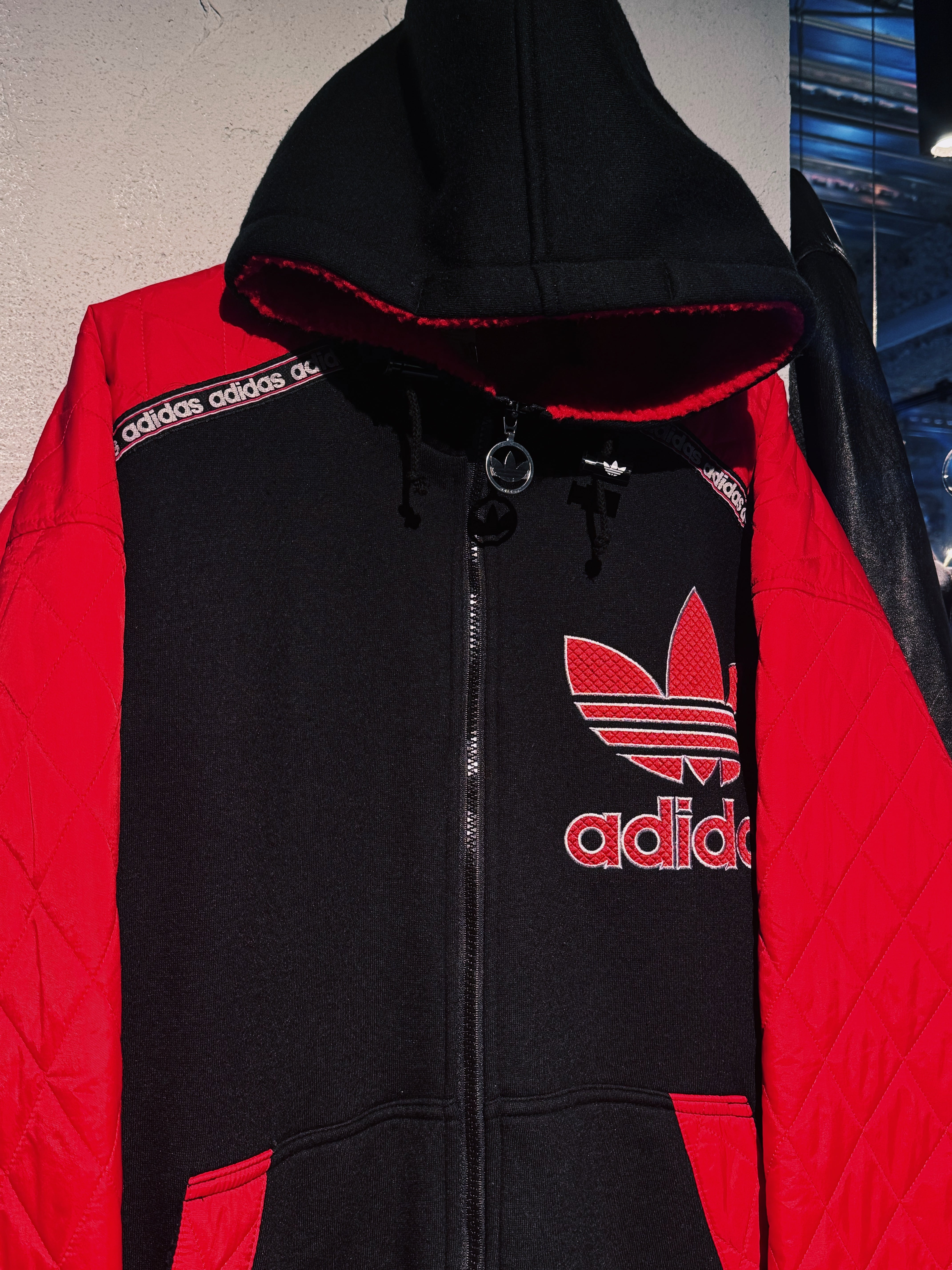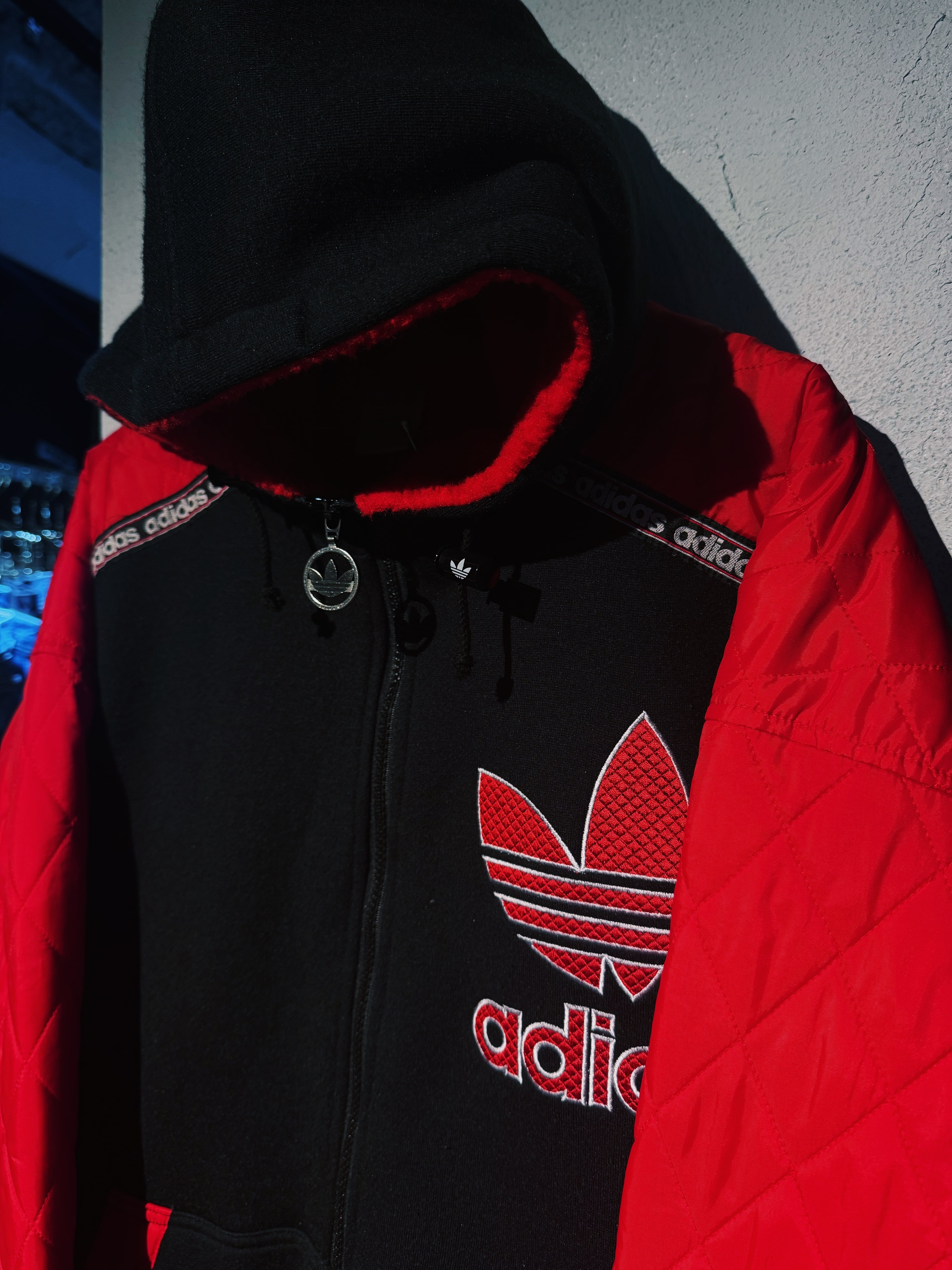 当店でも数多くのトラックジャケットが入荷してきましたが、ここまでビックサイズのフーディーがついた今までにないデザイントラックジャケット。ジップの裏はキルティング仕様になっており、フード裏から肩にかけてのキルティング生地は従来のアディダスジャケットより格別に極暖、最早スペシャルアウターをも凌ぐレベルのスペシャル中のスペシャルアディダス。