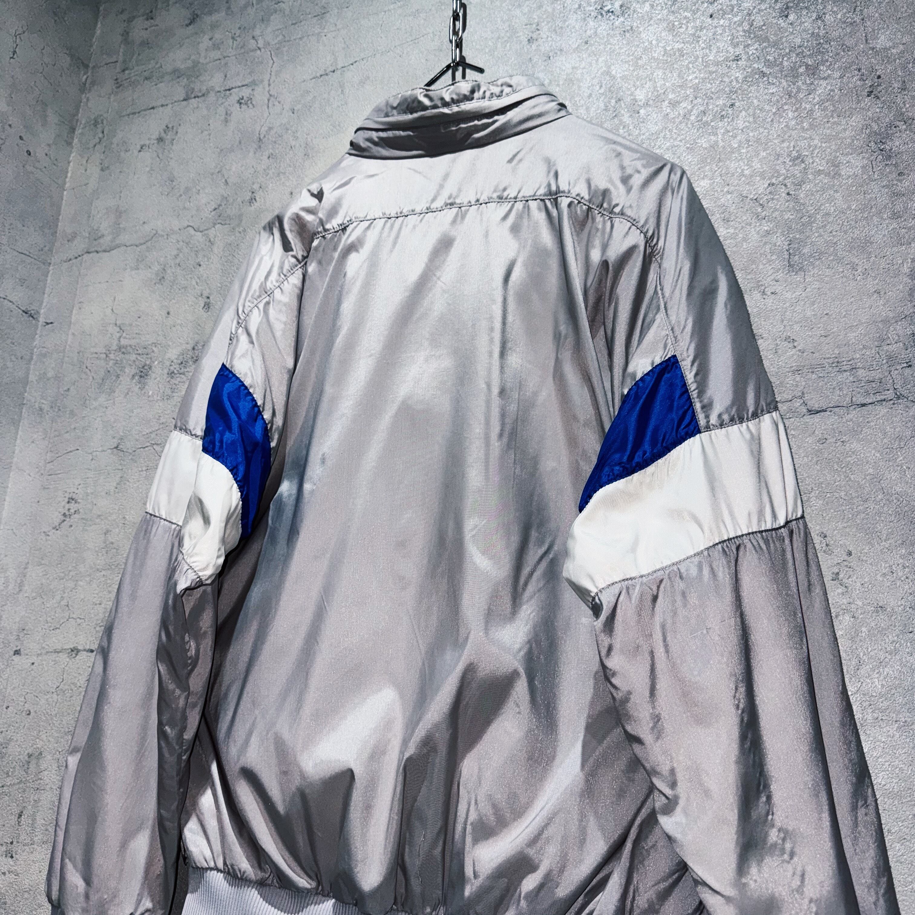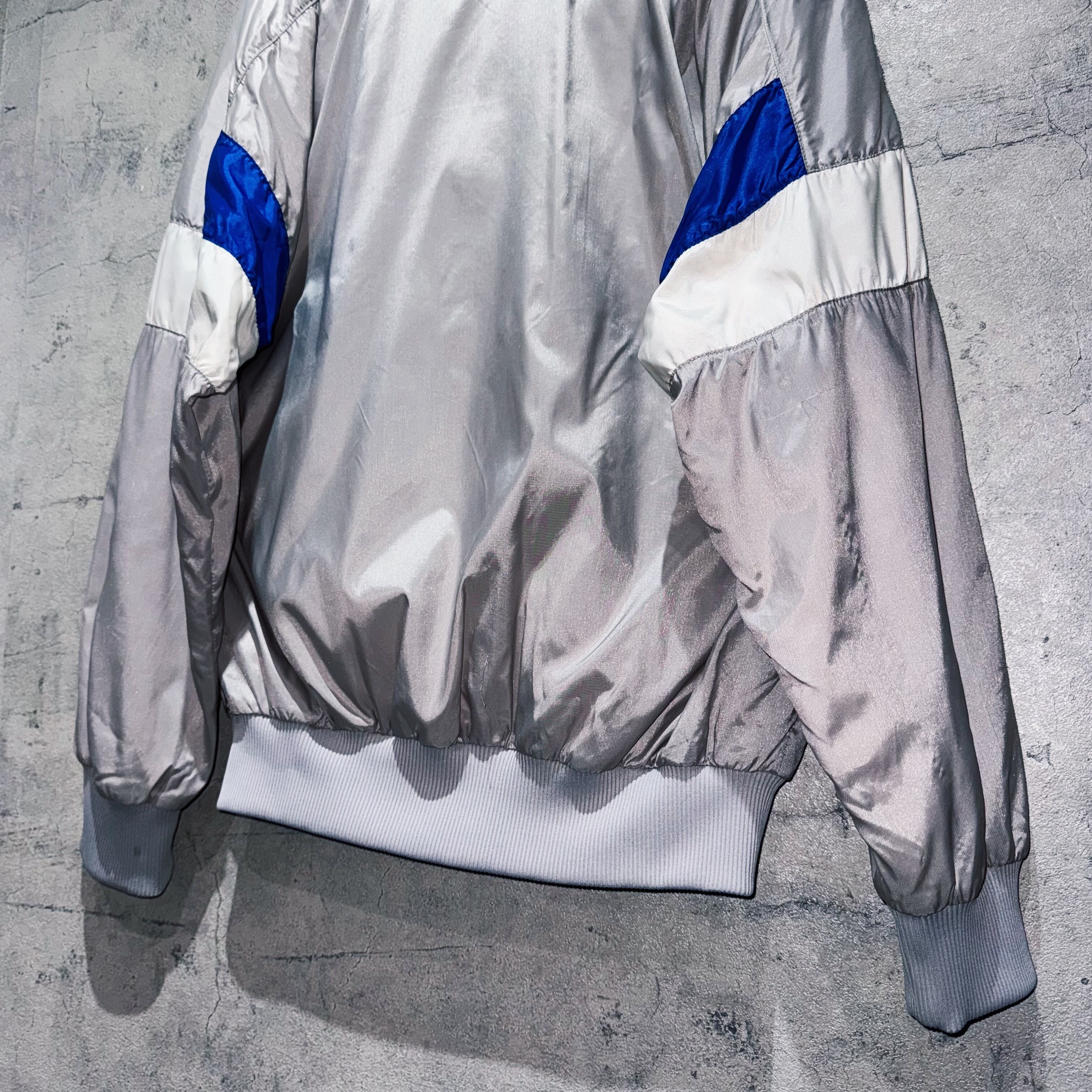 写真からでもヒシヒシと伝わってくるような光沢に身を包み、ホワイトグレーとブルーのコントラストが素晴らしいカラーリングのトラックジャケット。