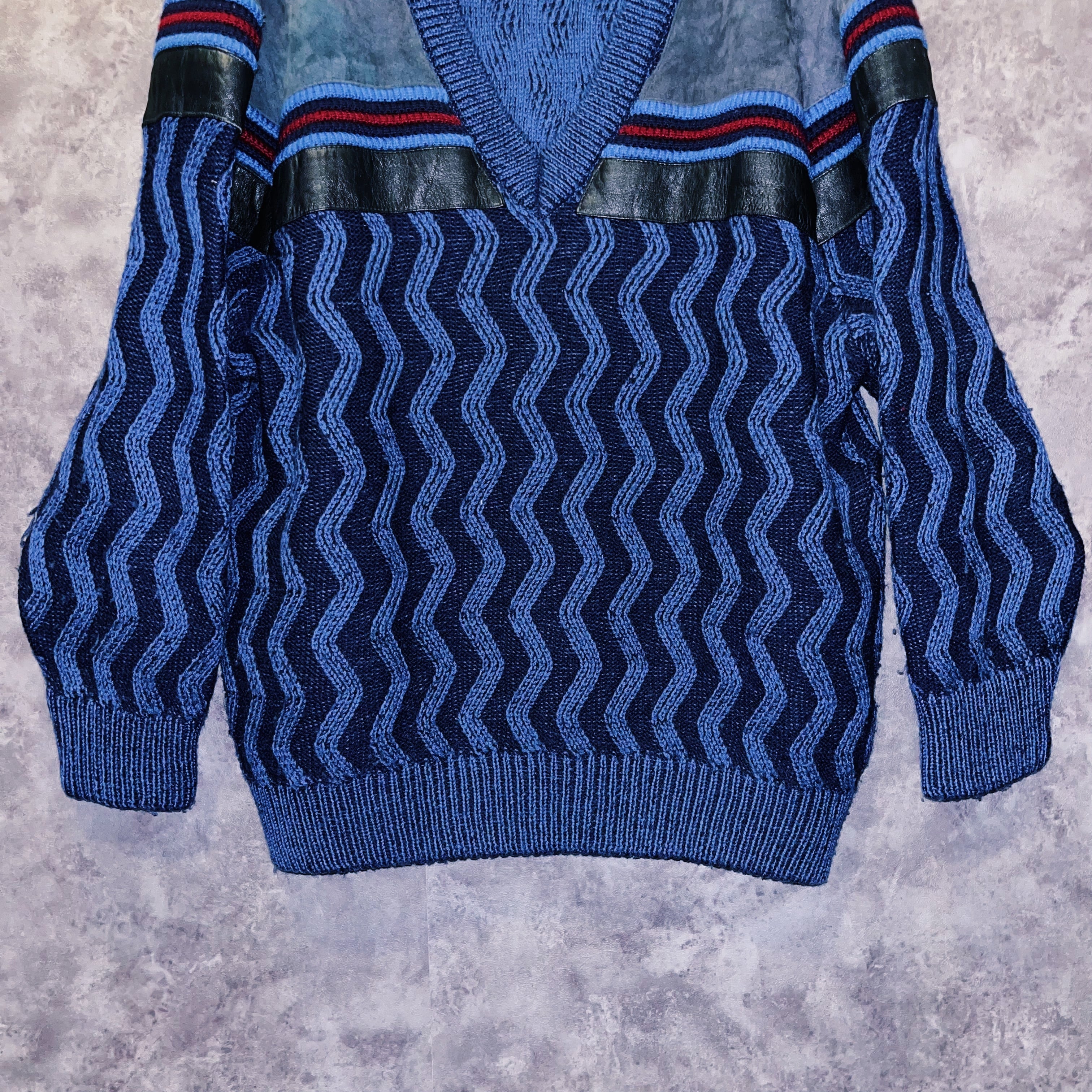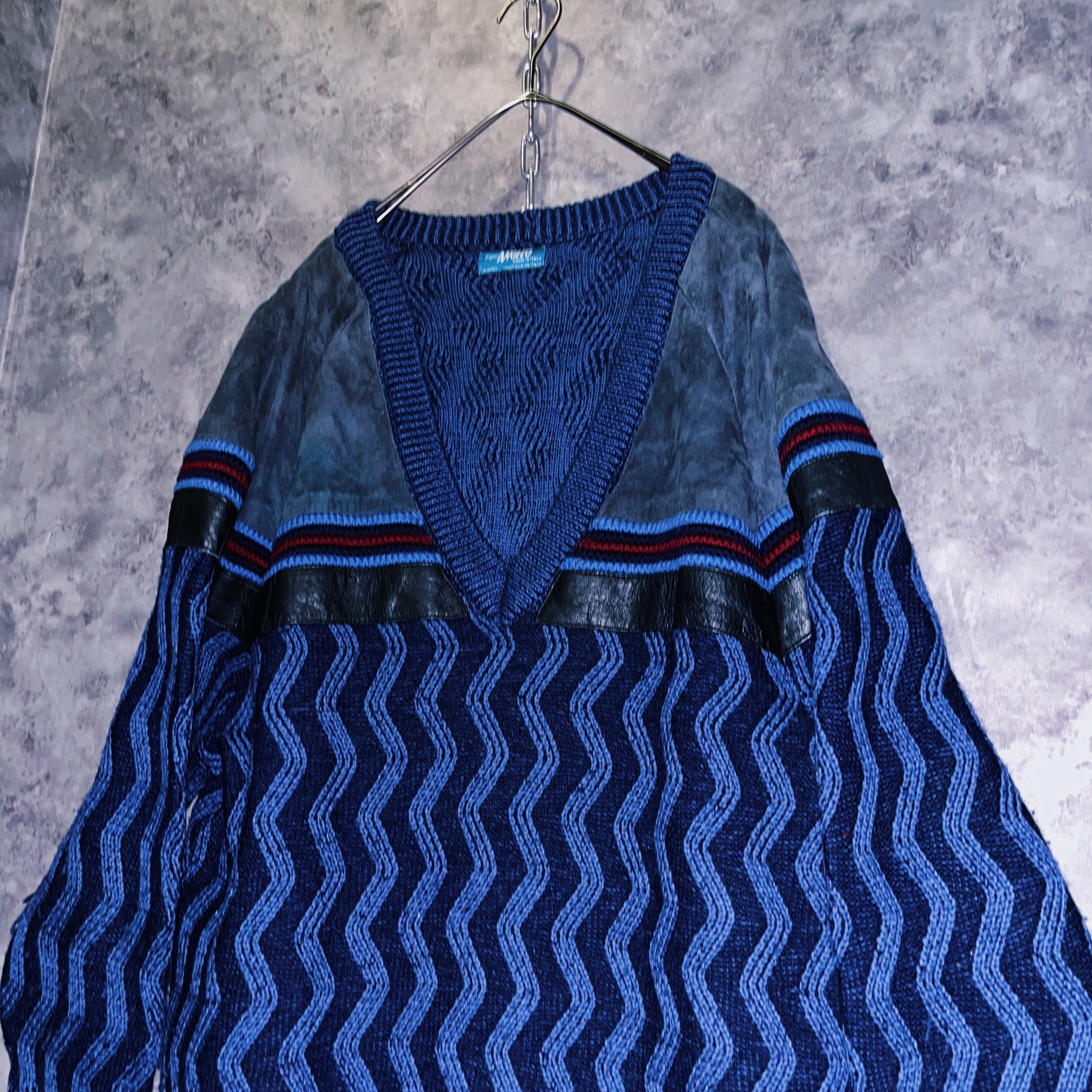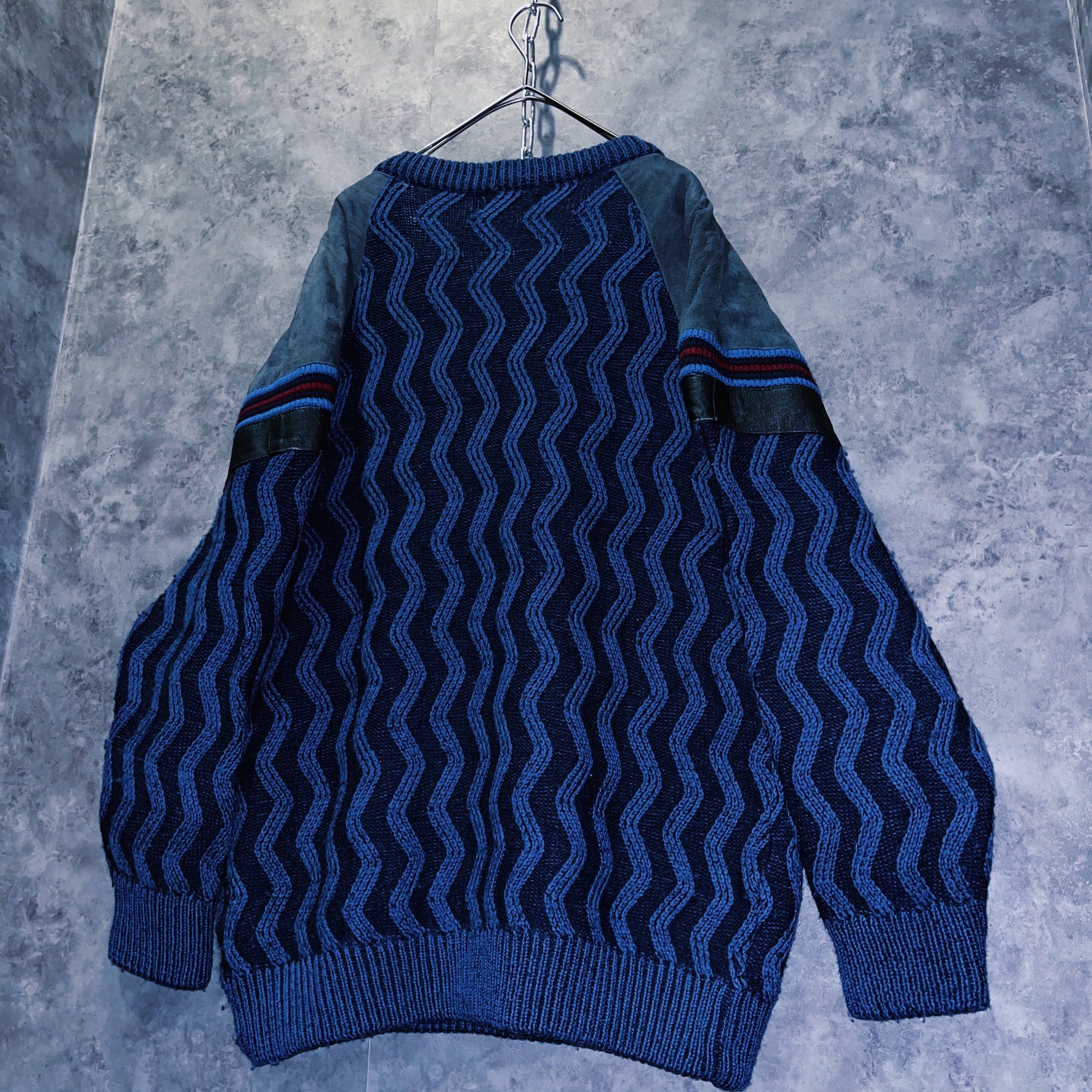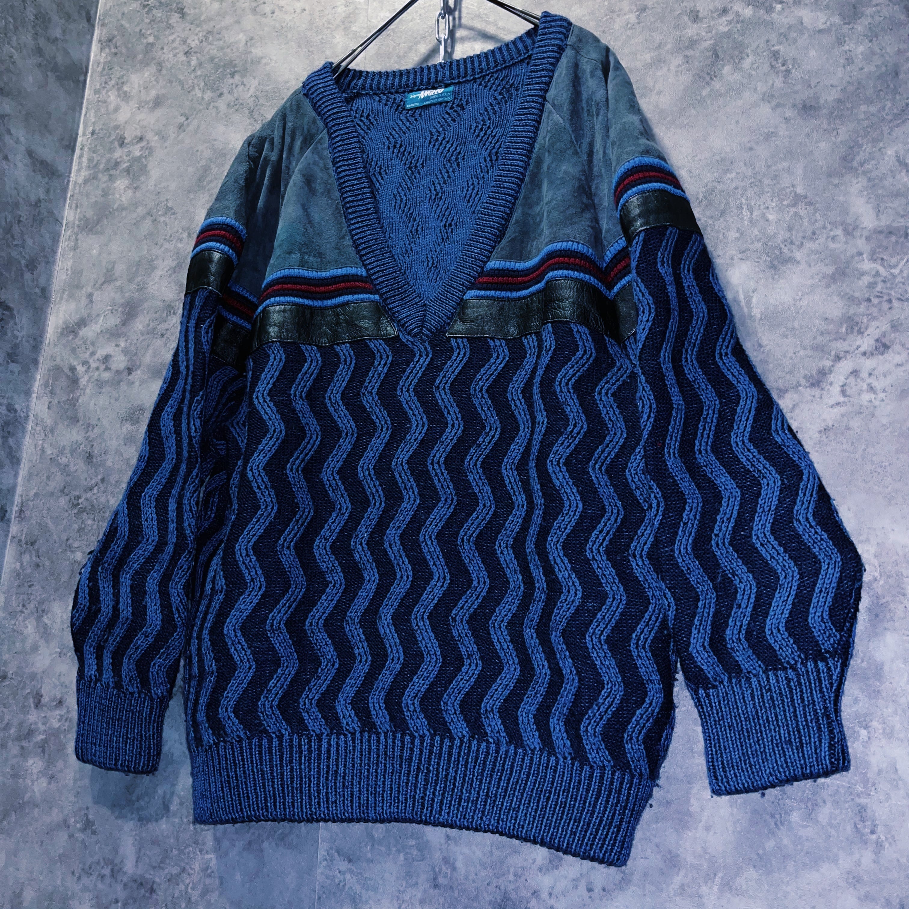 ユーロヴィンテージイタリア製スウェードスイッチングウェーブデザインVネックニット
