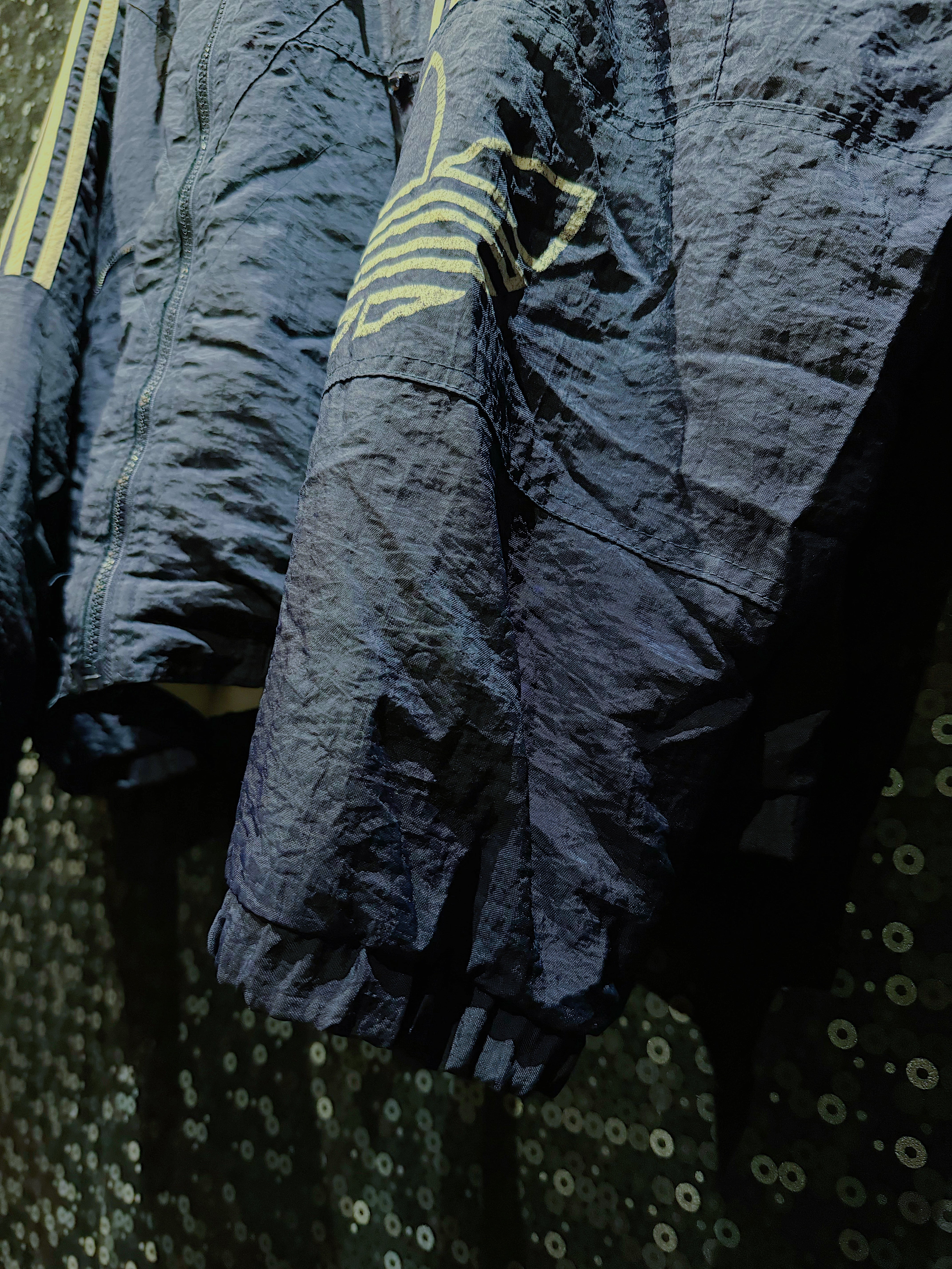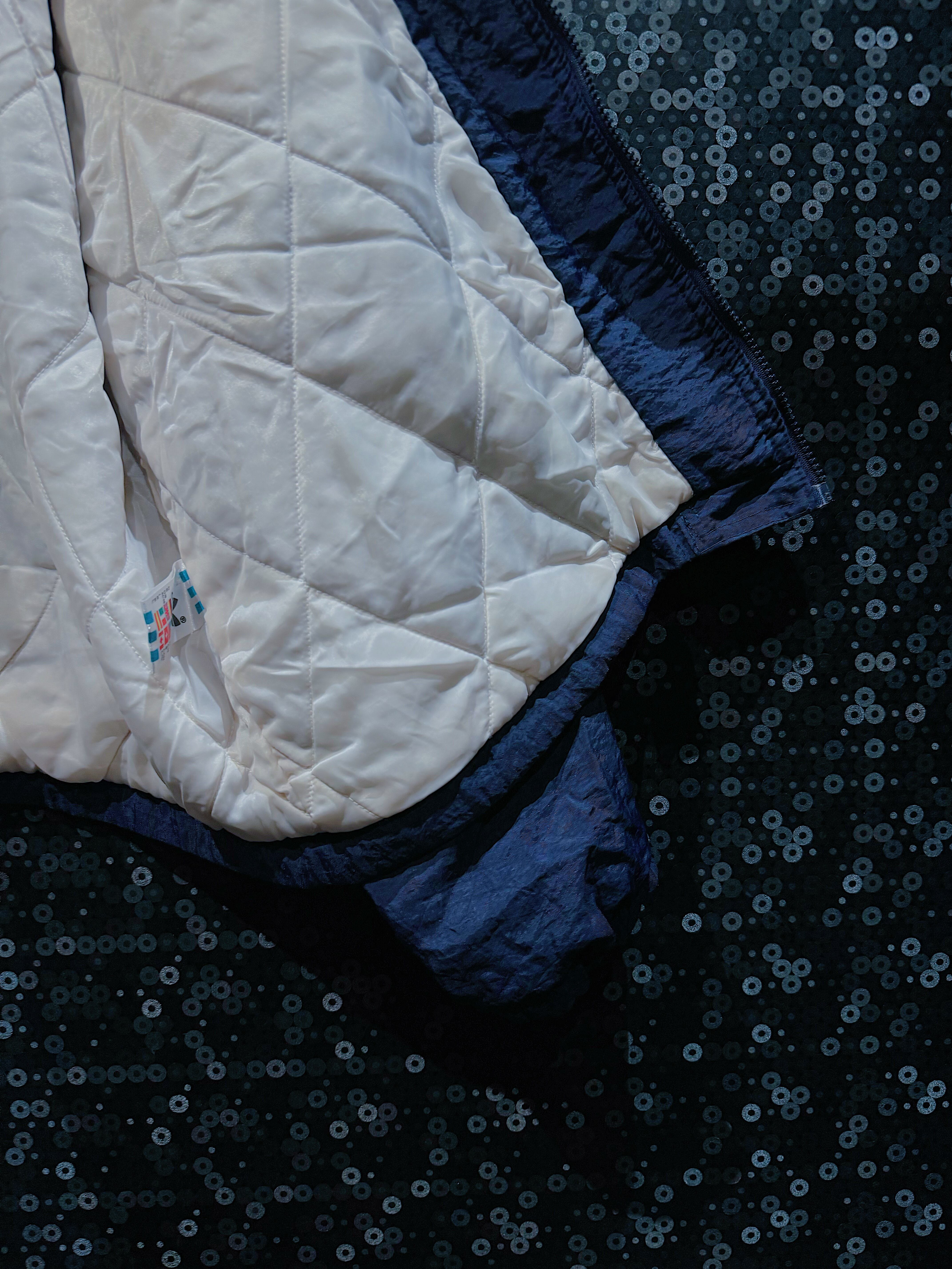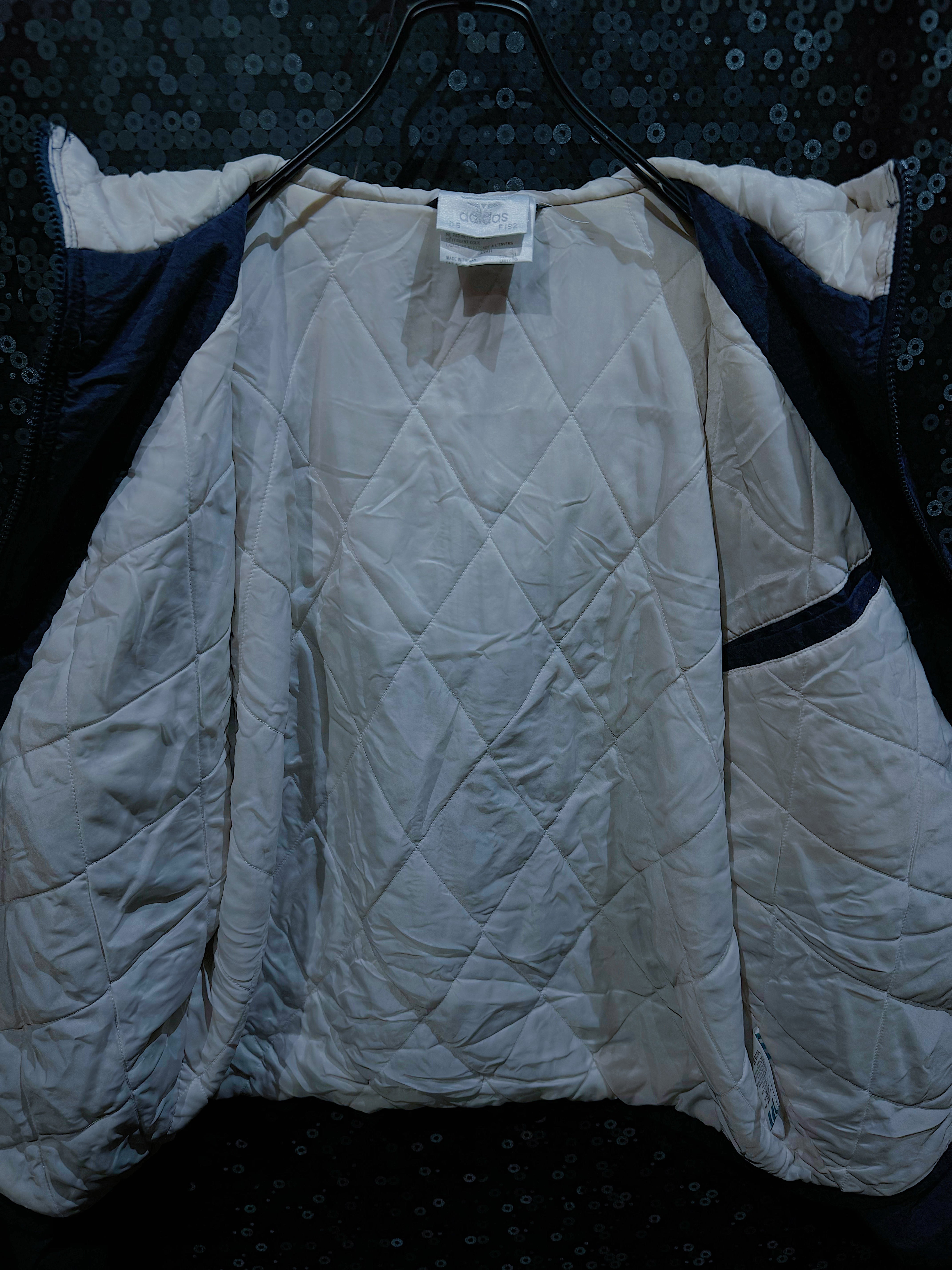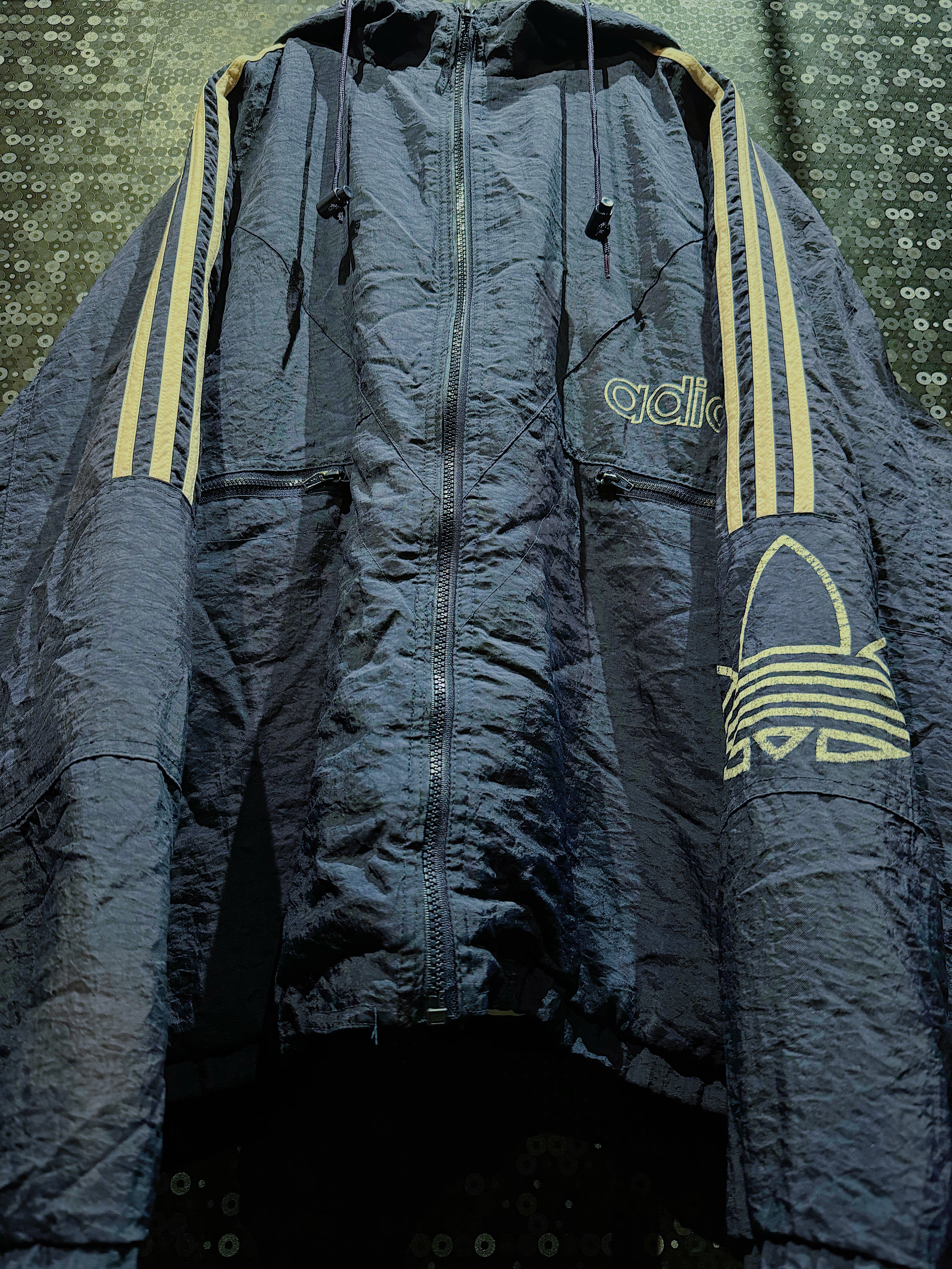 このadidasのナイロンジャケットは、90年代から2000年代初頭にかけてのスポーツウェアのデザインを象徴する一着です。