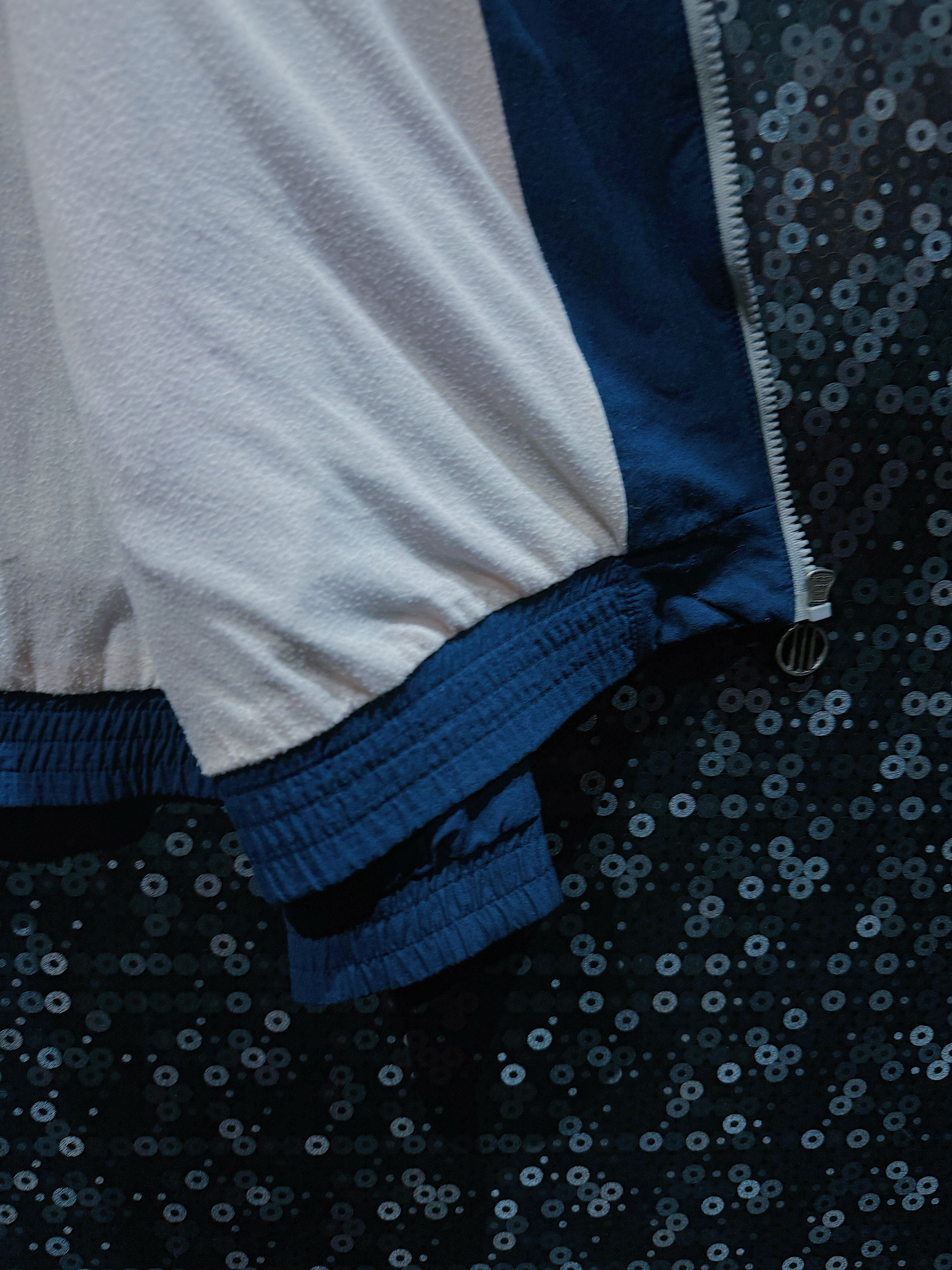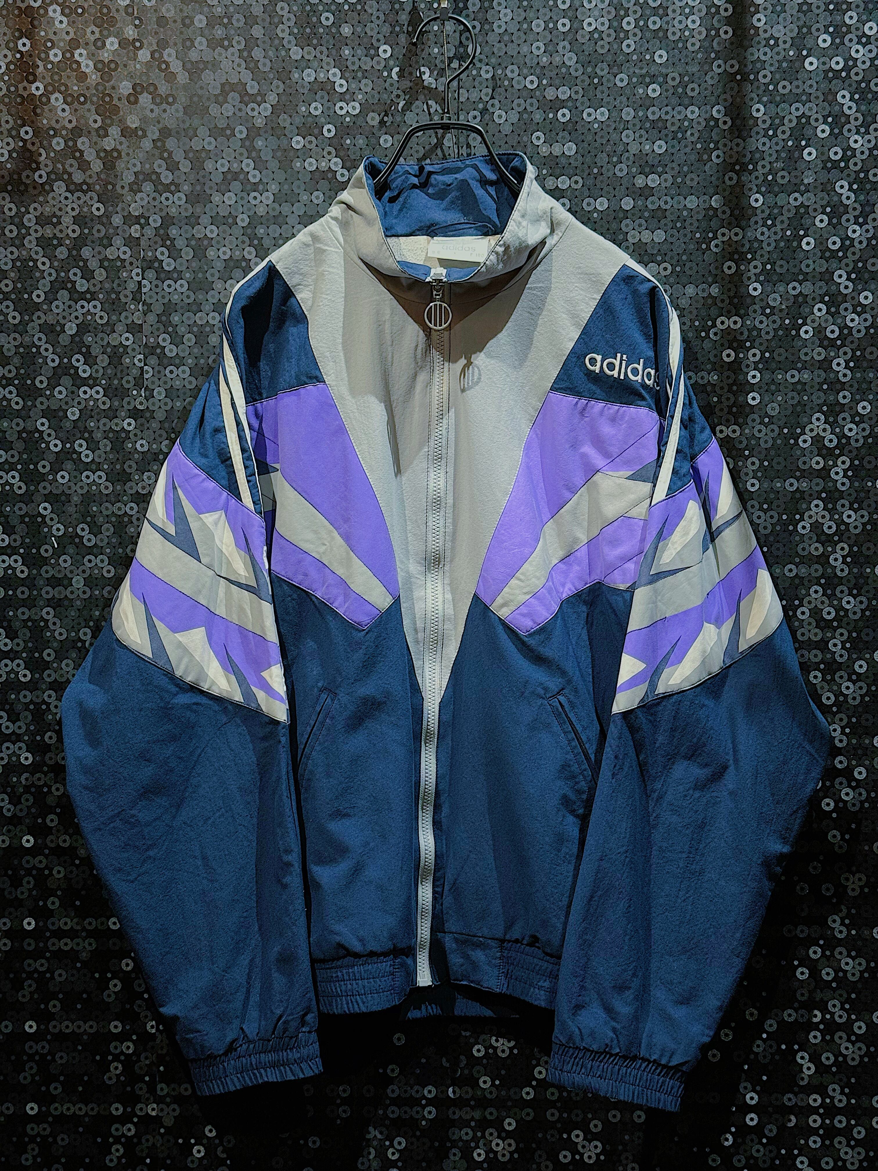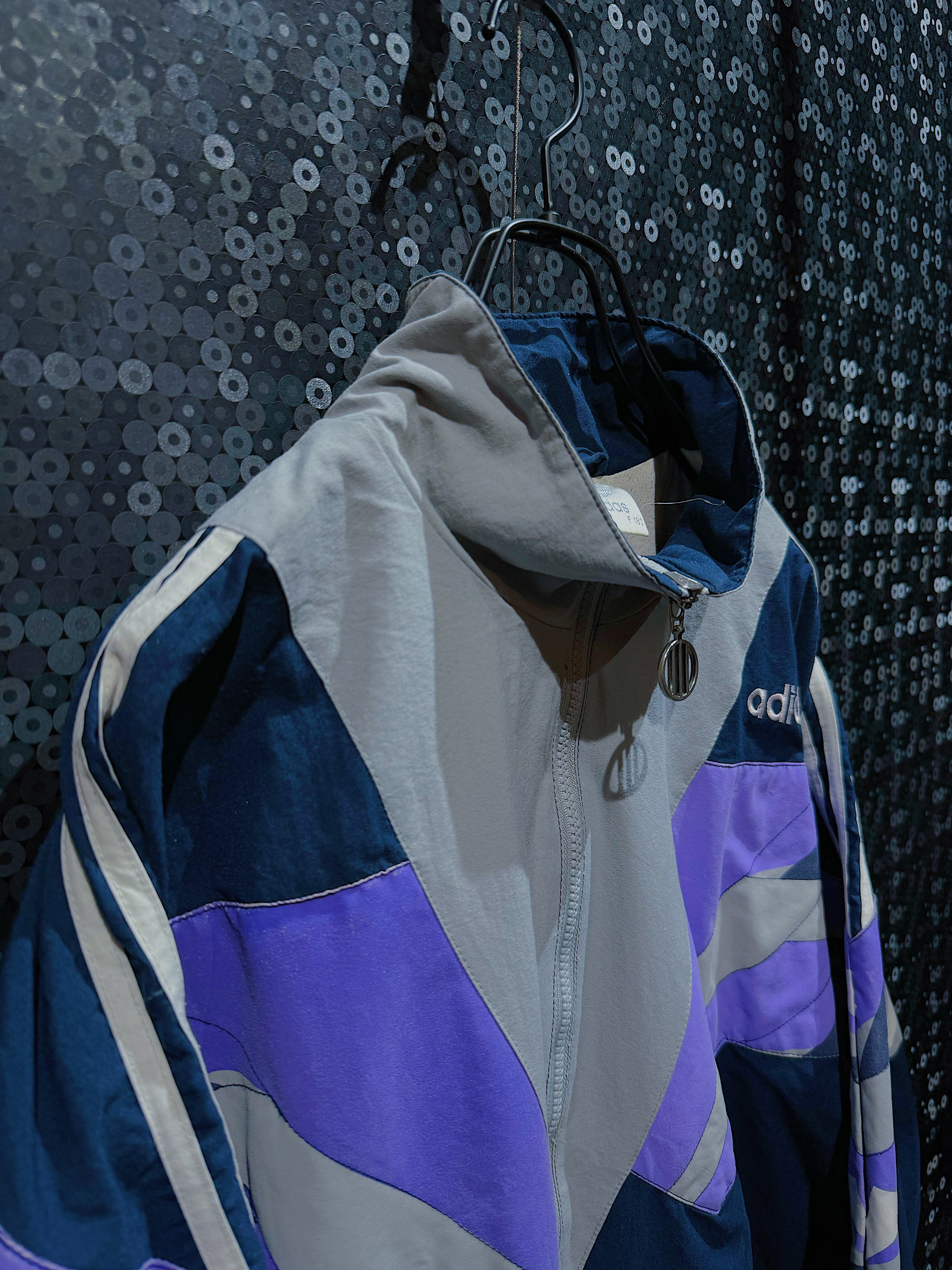 特に、幾何学的なカラーブロッキングとパープルのアクセントが、当時のヨーロッパや日本のトラックジャケットやウィンドブレーカーのトレンドを彷彿とさせます。