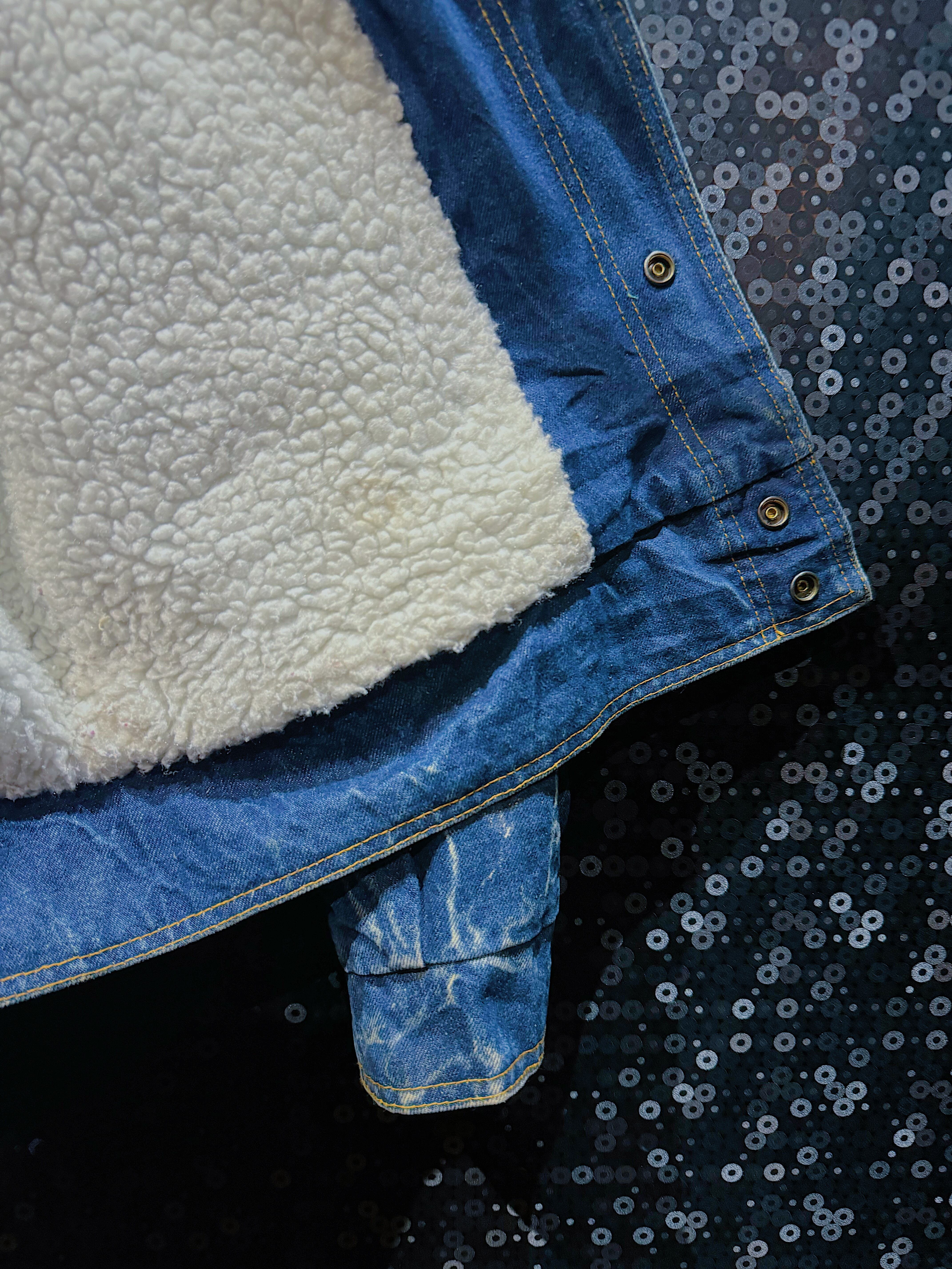 内側にはボアライナーが備わっており、防寒性も高く、ライナーの厚みがしっかりとした温かみのある仕様です。フロントにはスナップボタンとジッパーの二重構造が施され、機能性も兼ね備えたデザインとなっています。