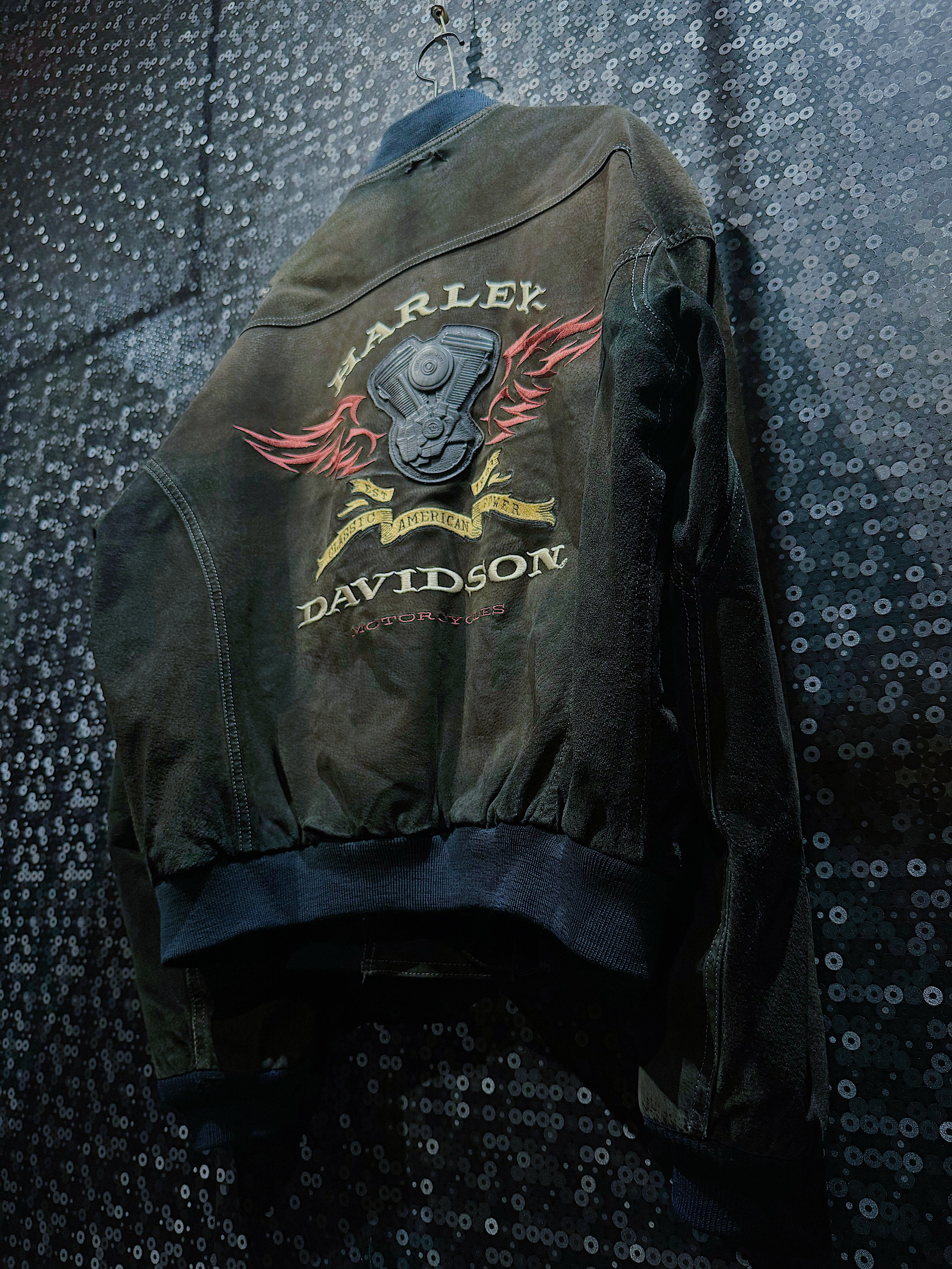 全体に経年変化が現れ、スエードのような独特の質感が生まれています。フロント左胸にはHarley-Davidsonの刺繍ロゴが施され、ブランドのアイデンティティをしっかりと主張。