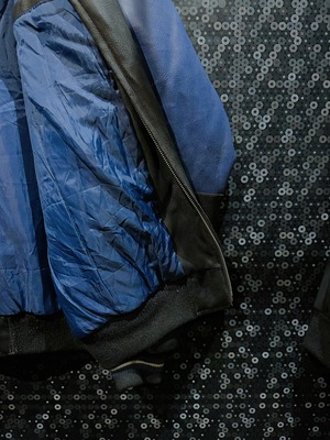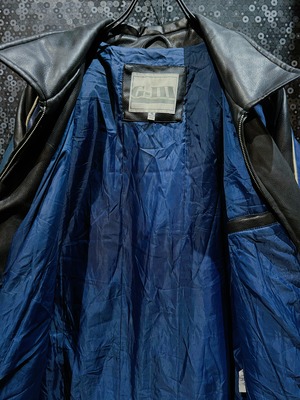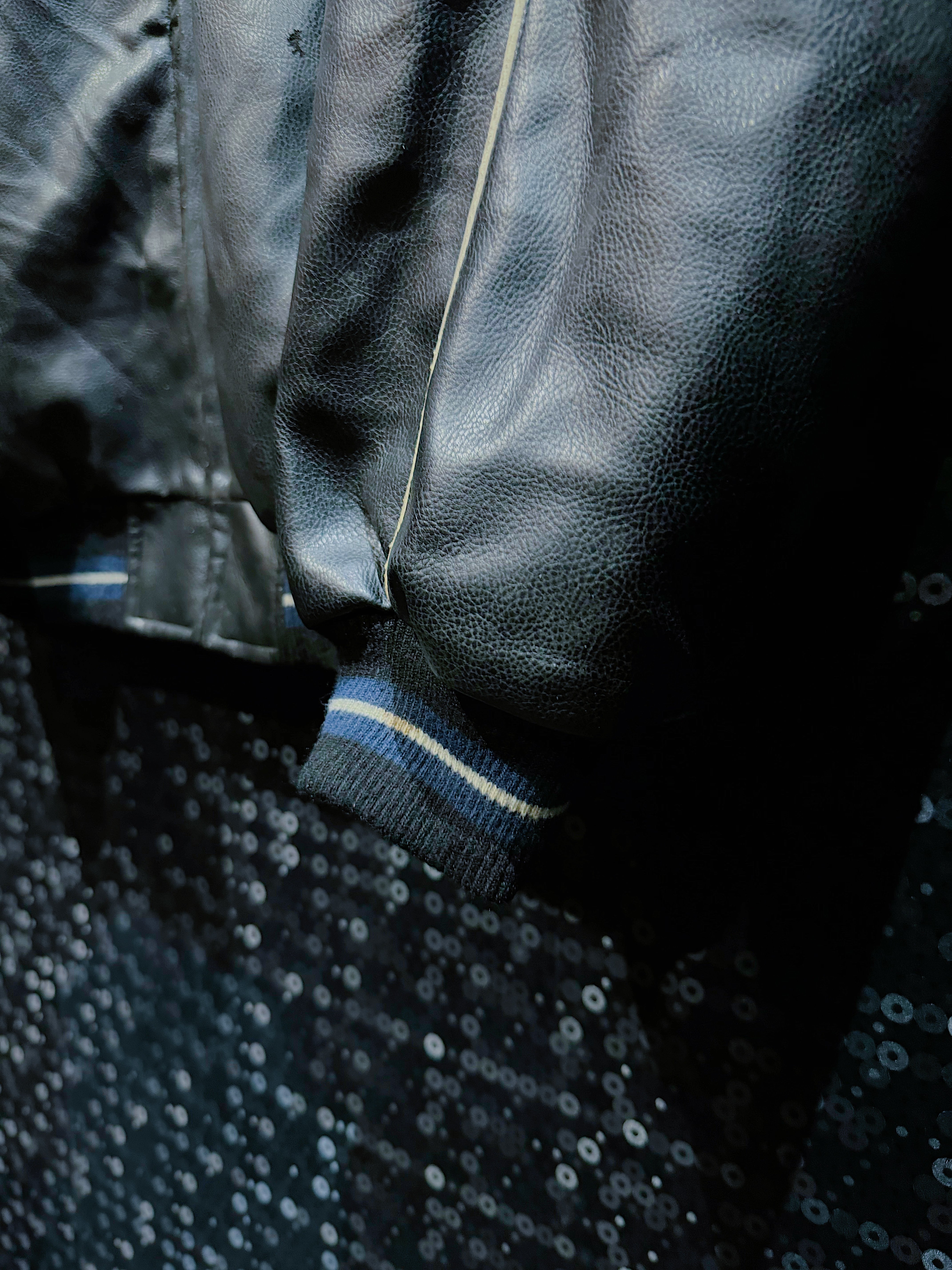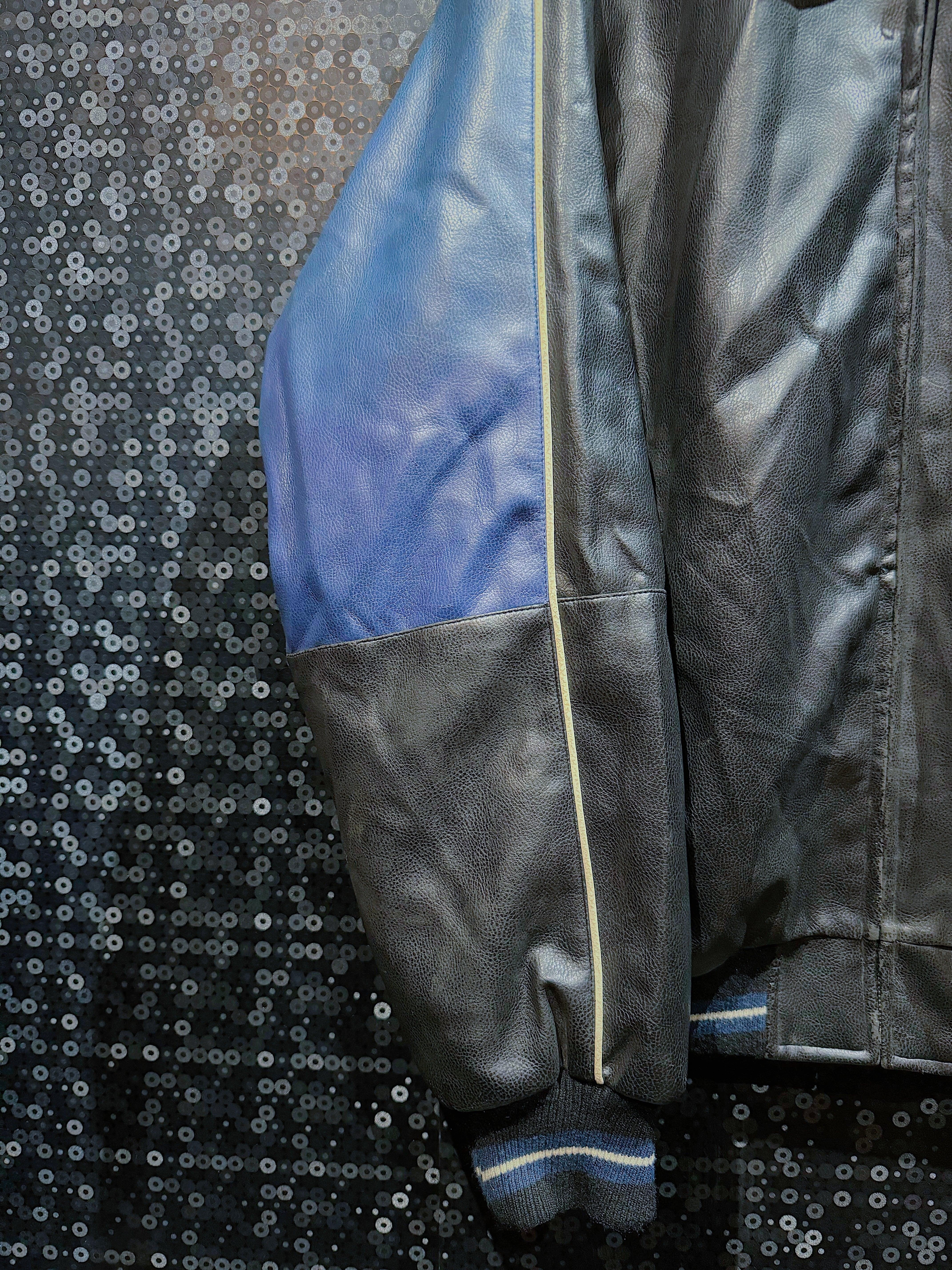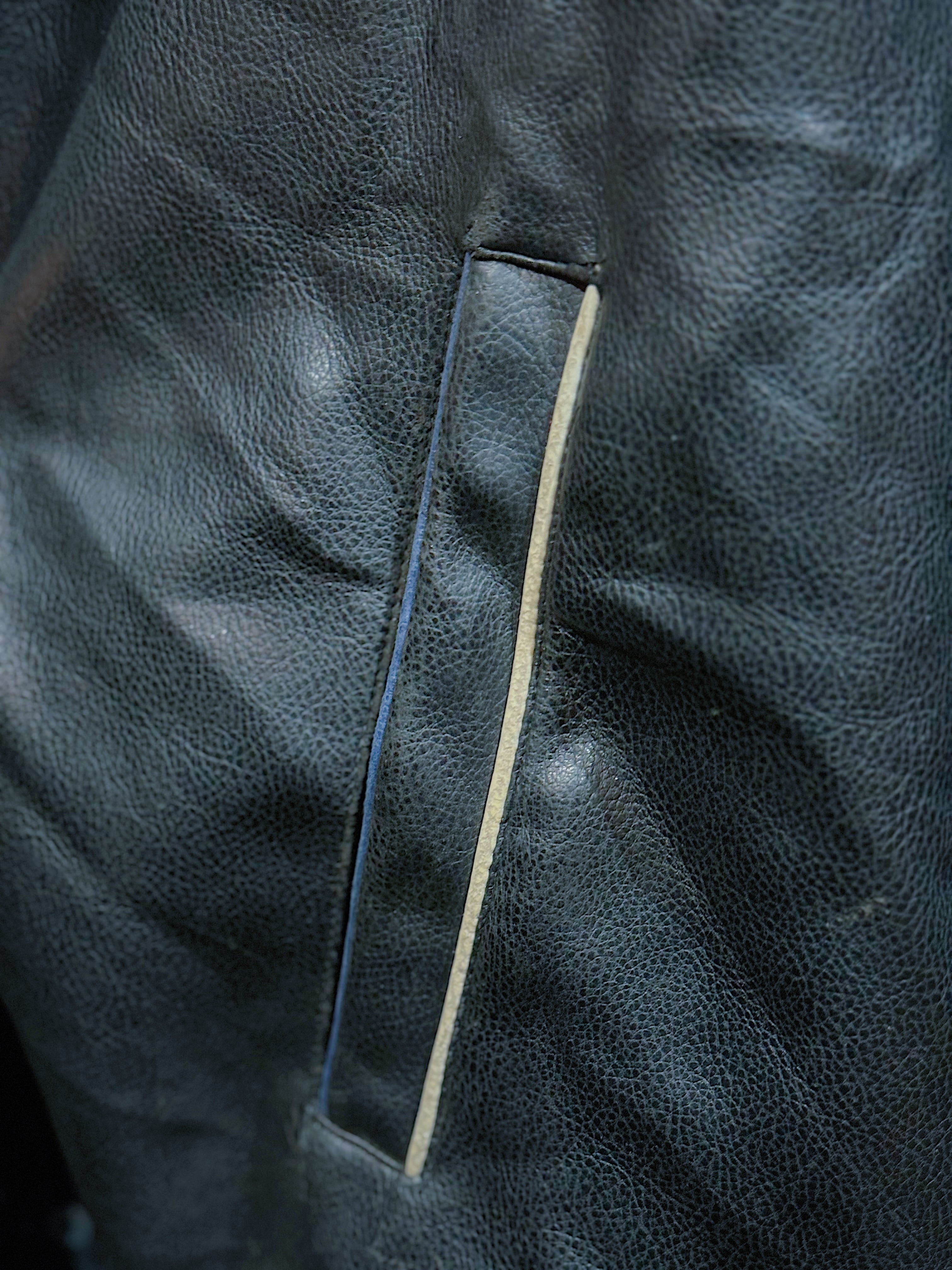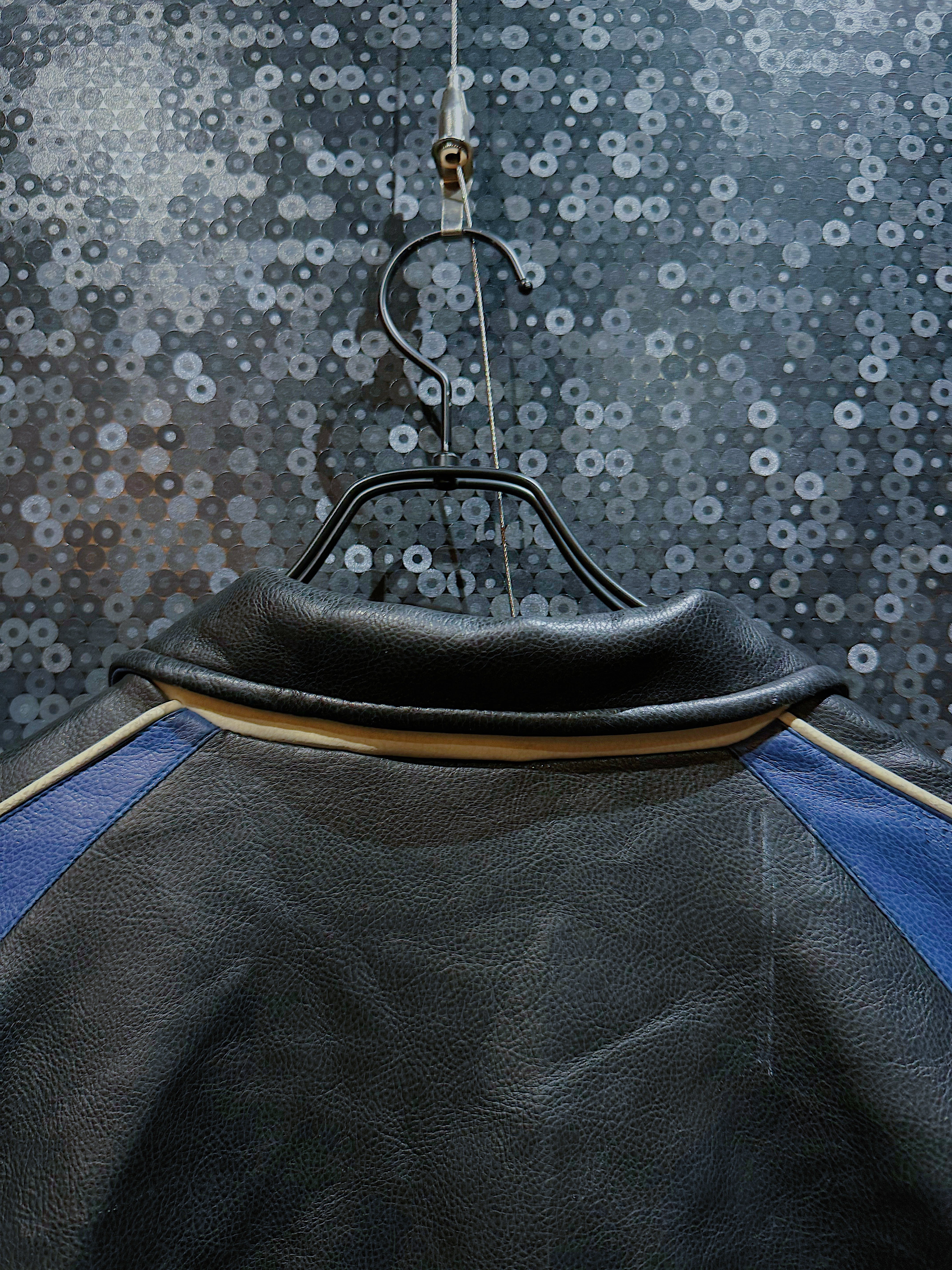 ブラックレザーをベースに、袖部分には深いブルーの切り替えが施され、アクセントとしてホワイトのパイピングが走ることで、メリハリのある印象を演出。