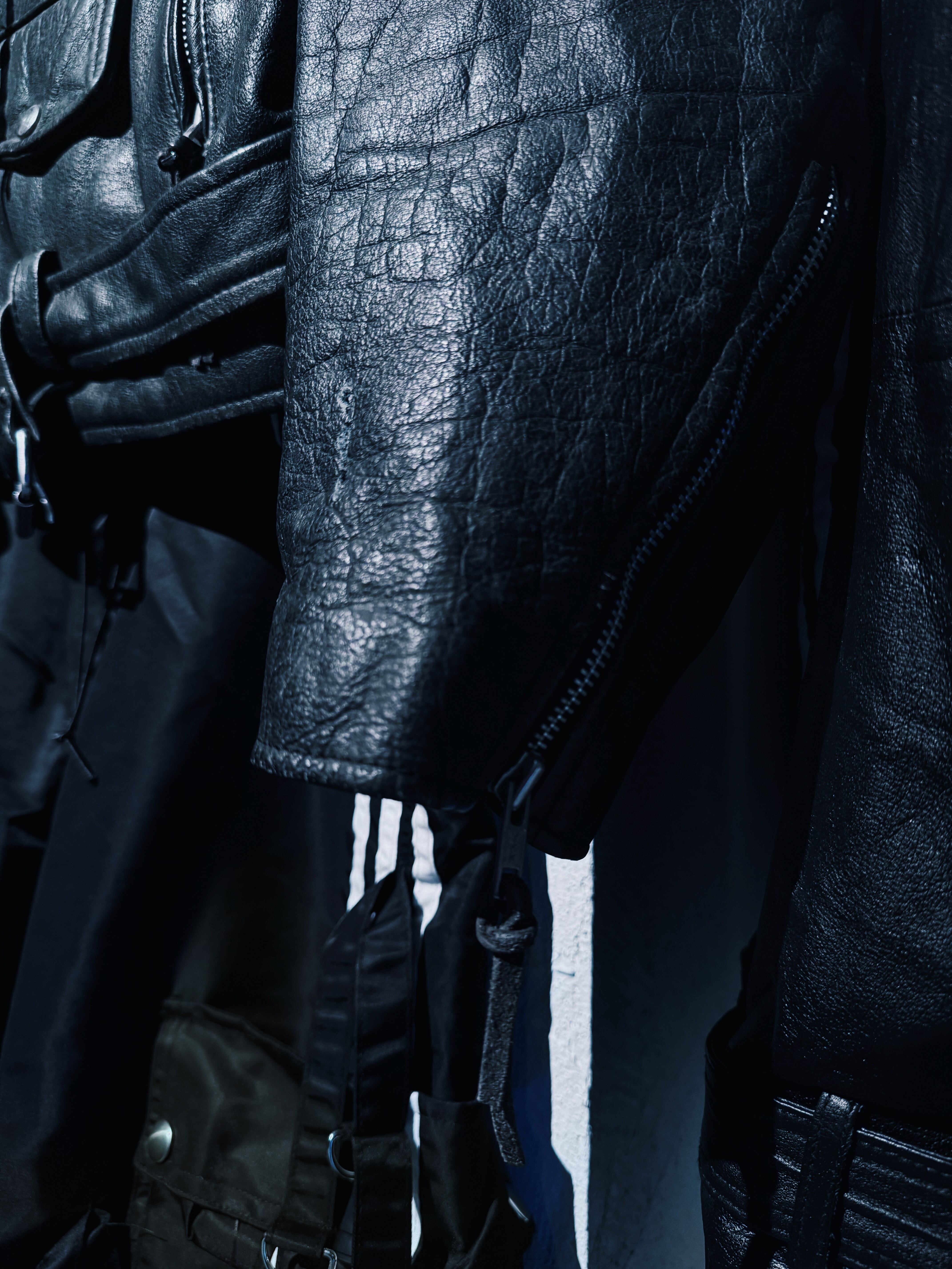 張りとコシがあり、レザー特有の光沢感を放つ上質な牛革を採用した、シルバージップのギミックが映えるライダースジャケット。状態や細かいディティールの作り込み等含めAyneが今季力を入れているレザーの中でもかなりの逸品。