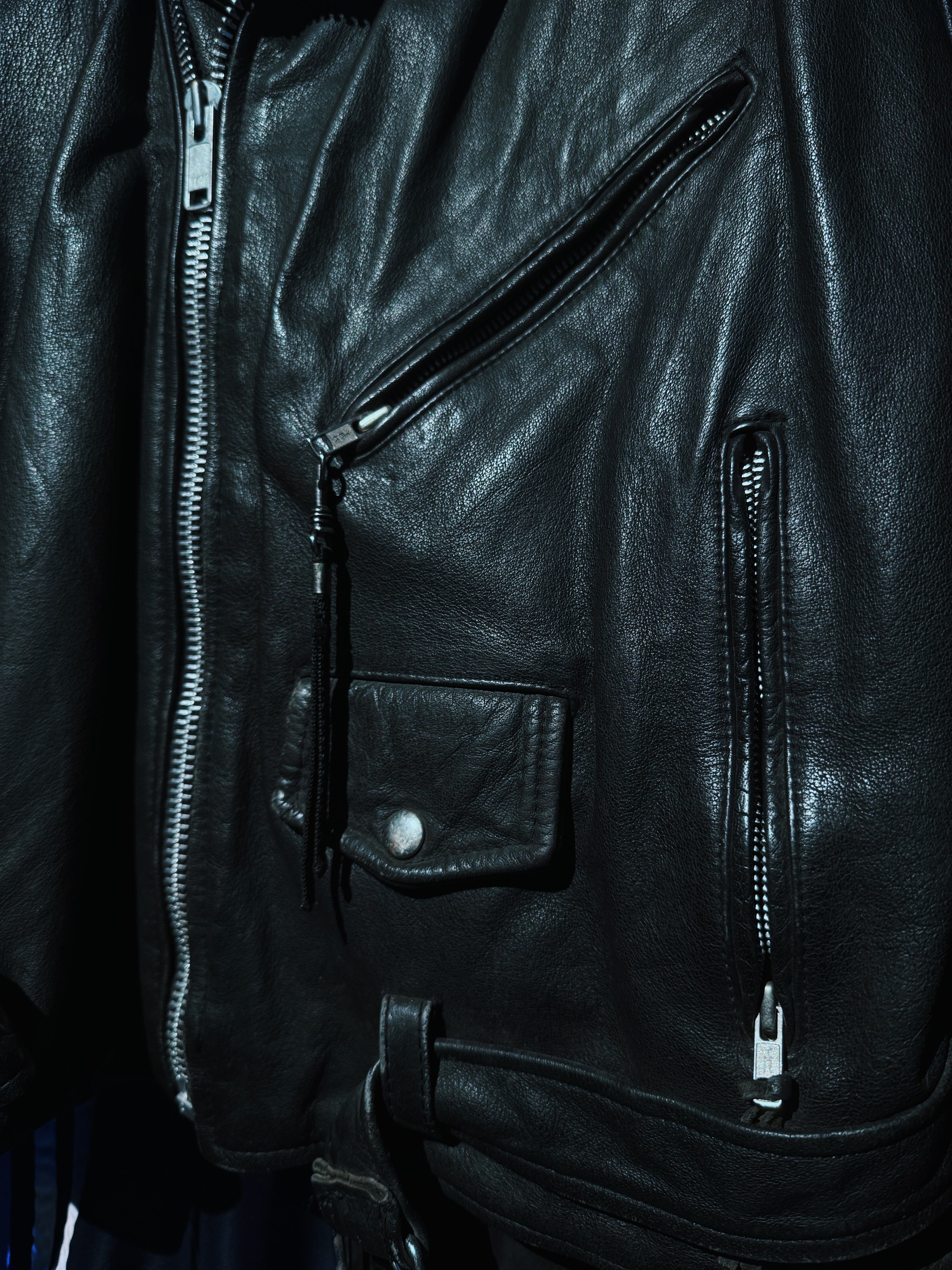 ジェニュインレザーらしい重たく硬い、どっしりと構えられた重厚感溢れる1着で渋さ満点の逸品。