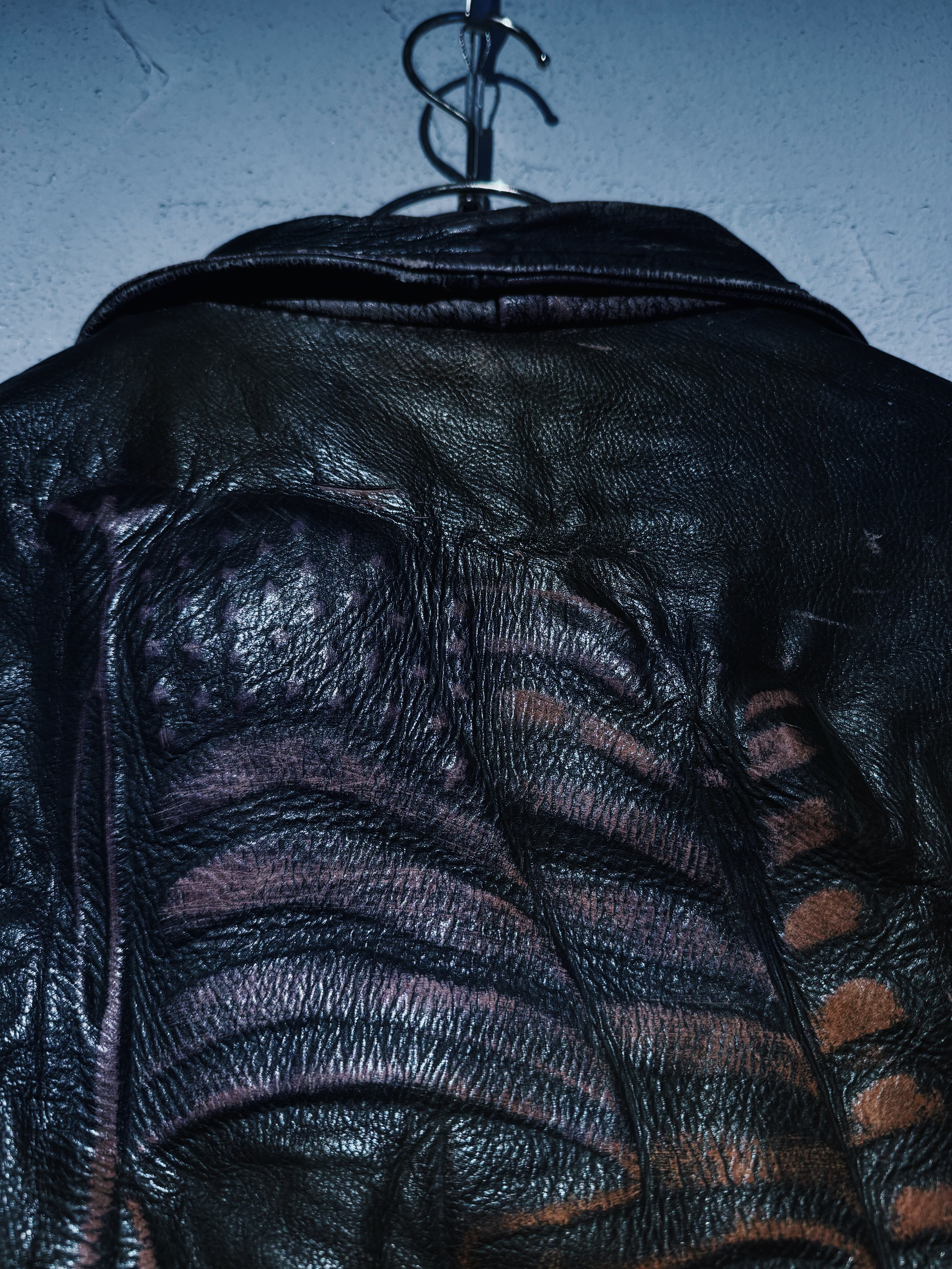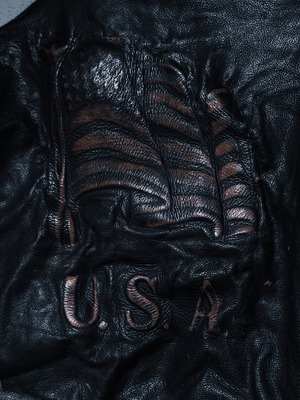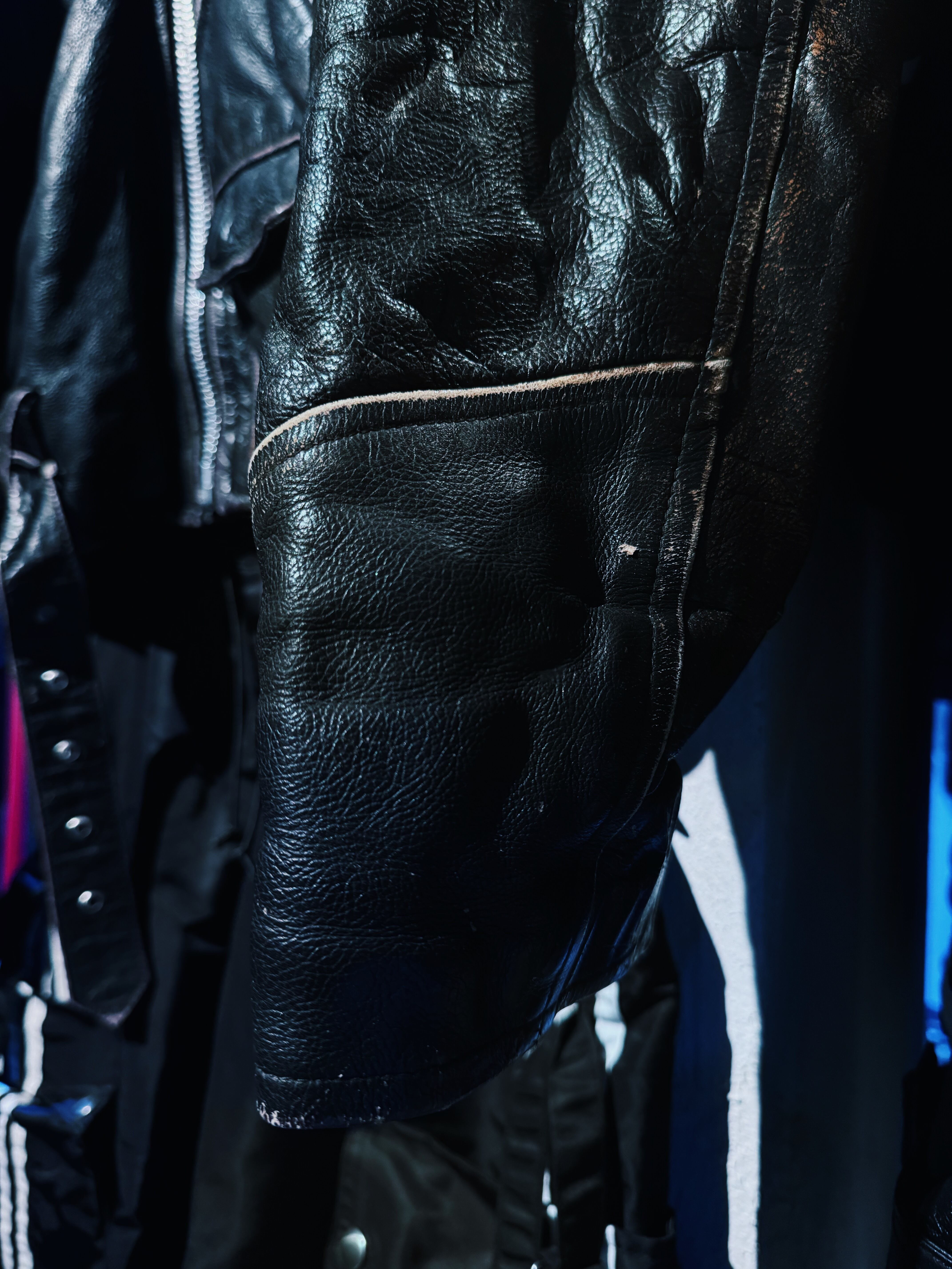 ジェニュインレザーらしい重たく硬い、どっしりと構えられた重厚感溢れる1着で渋さ満点の逸品。