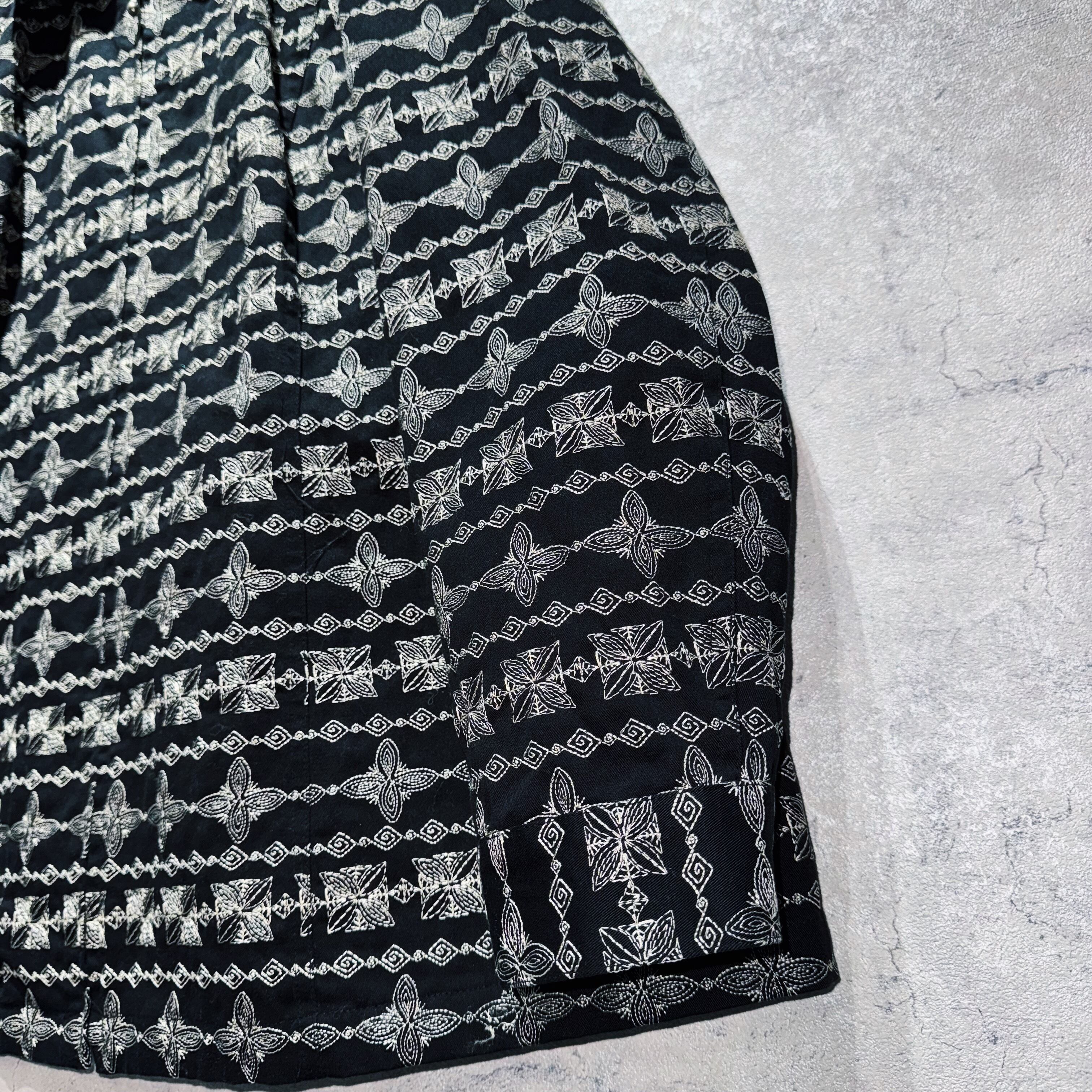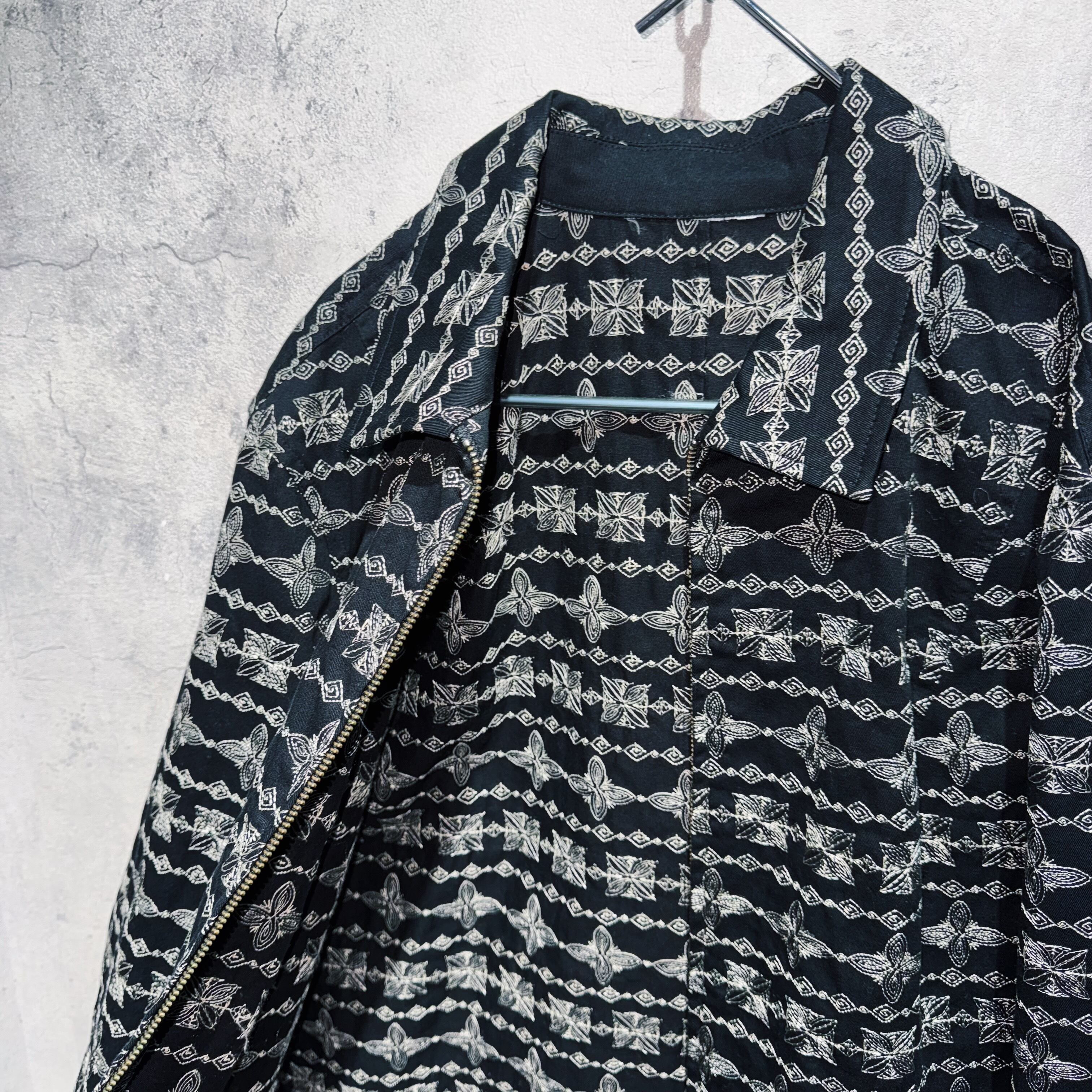 ブラックのボディにエスニックな総柄デザインをプリントではなく刺繍で刻むことで、立体感と高級感を演出したデザインジャケット。
