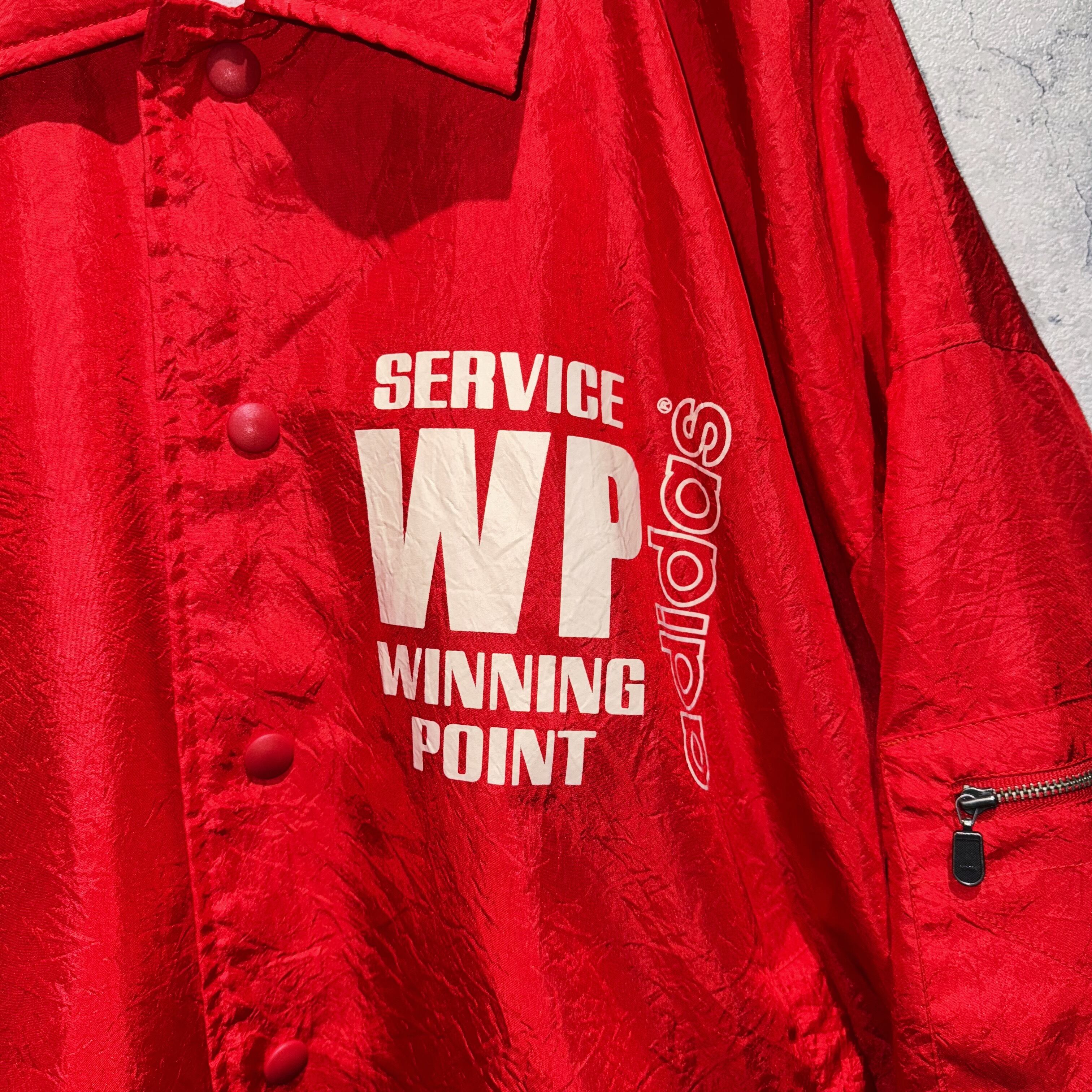 真っ赤なボディに「SERVICE WINNING POINT 」とテニスに因んだロゴデザインが胸元と背面に施されたコーチジャケット。スナップボタンなので着脱も楽々で、春先ではサッと羽織り感覚でサマになります。