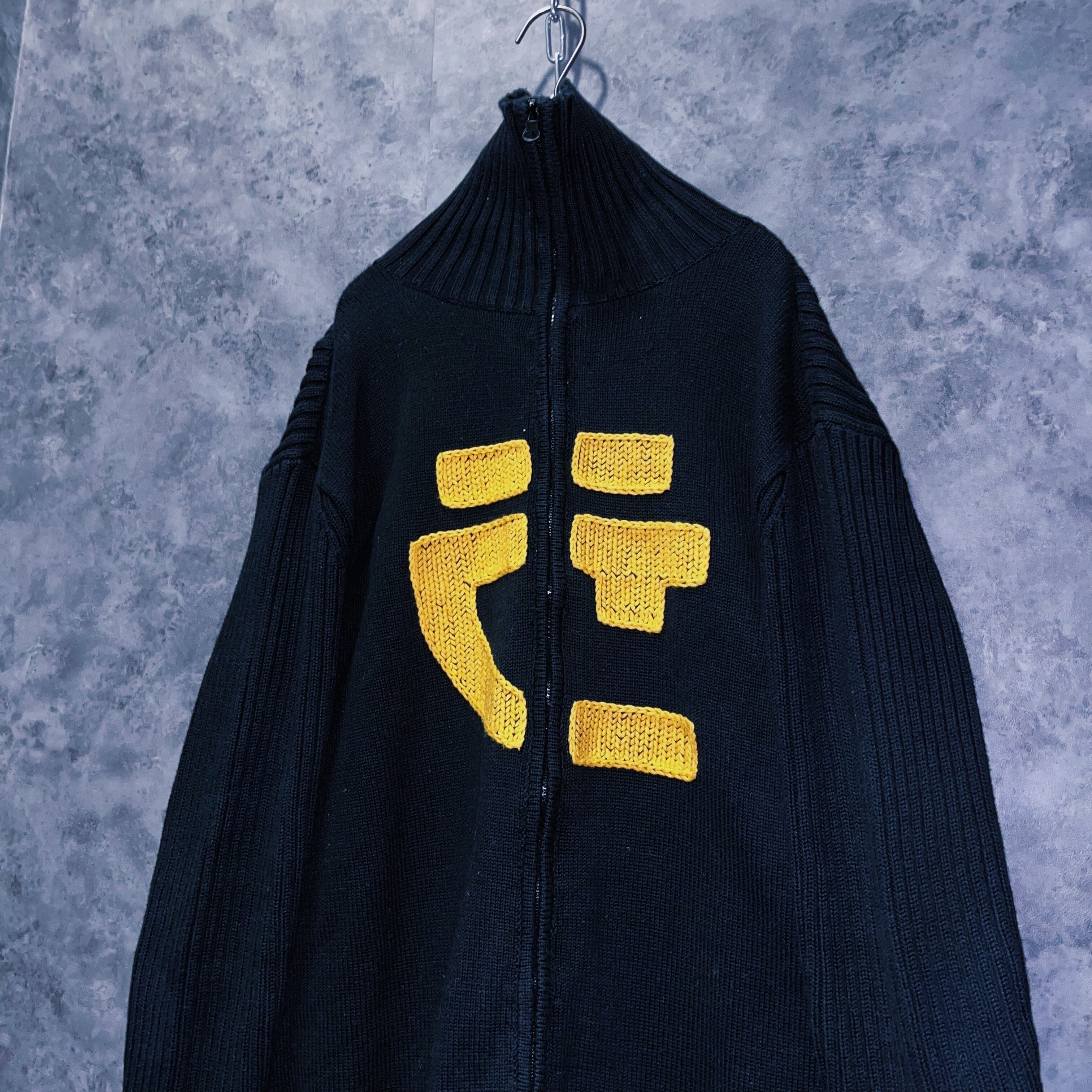 フロントデザインにはブラックニットをベースに発色良いレモンイエローで文字のようなデザインが織り込まれたインパクトある一着。