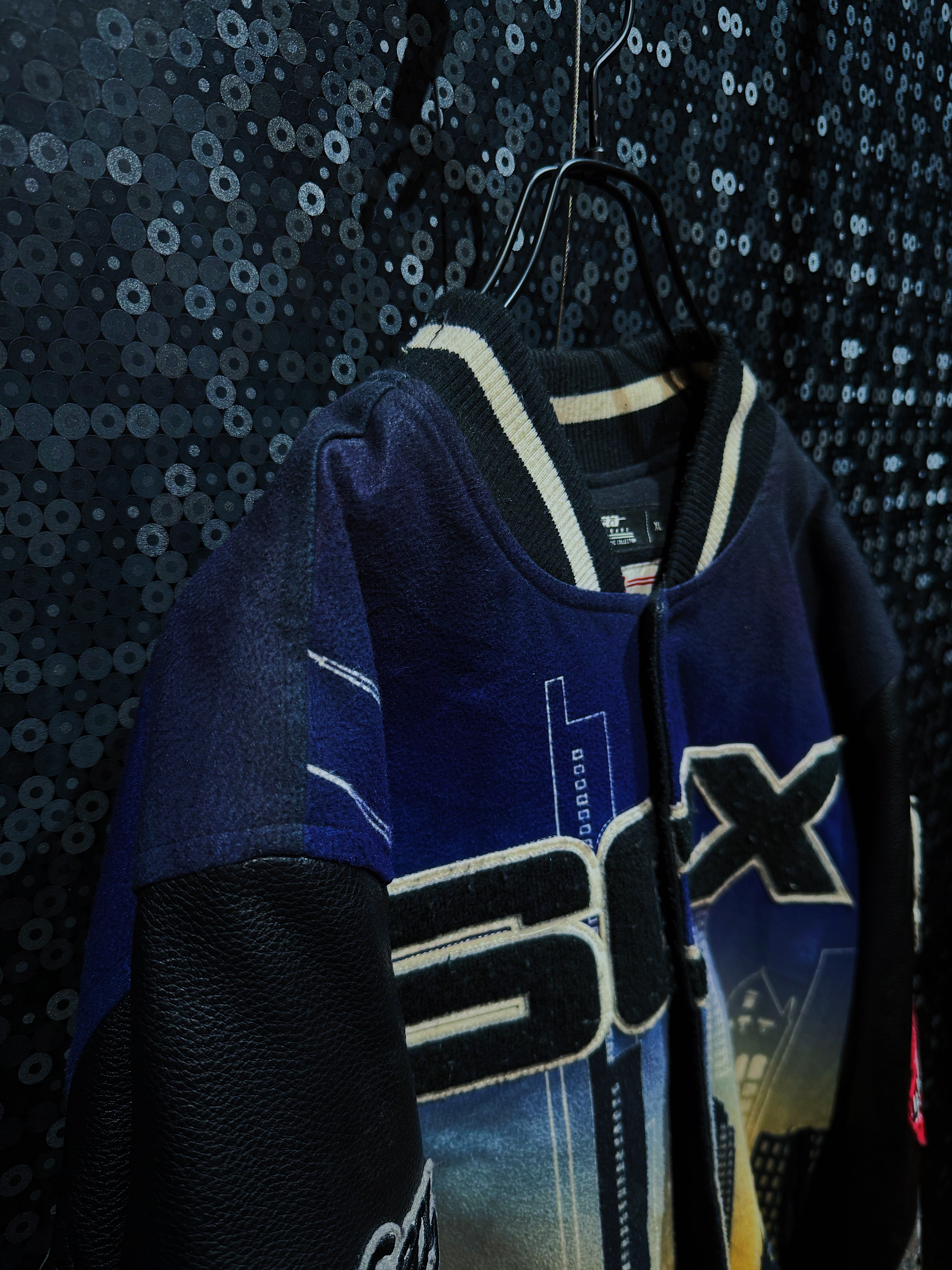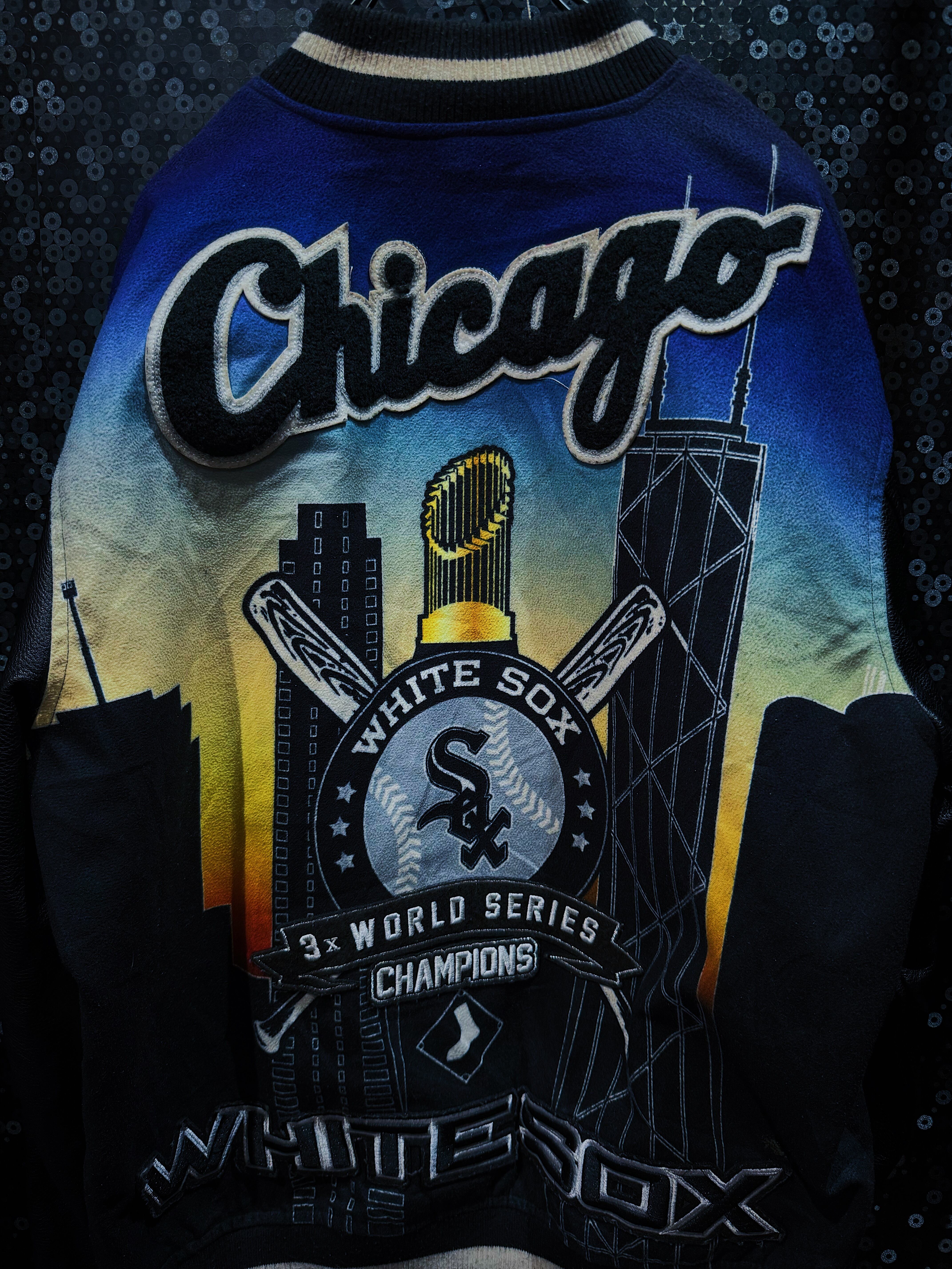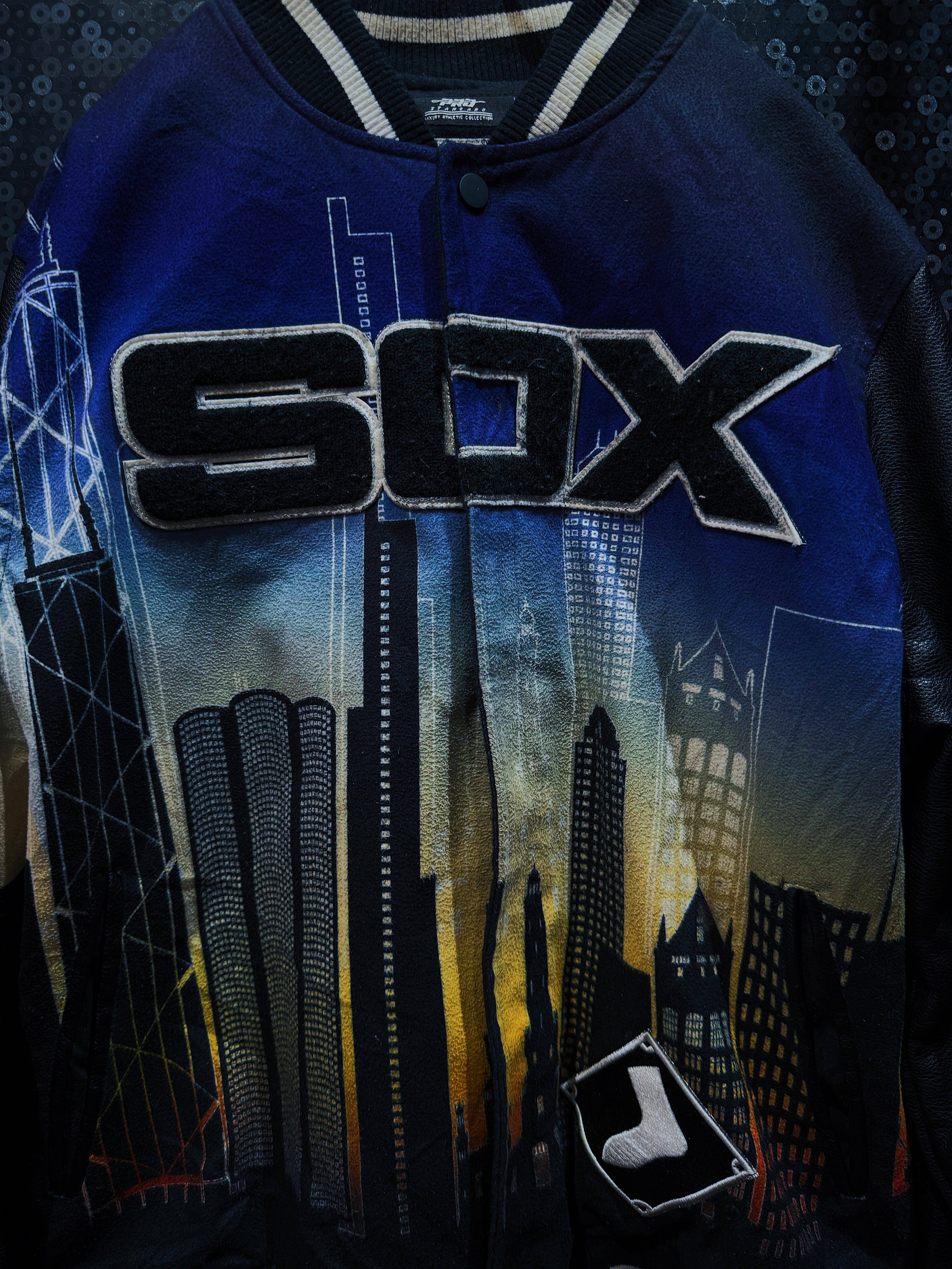 White Soxのレザージャケットは、フロントにシカゴのスカイラインを描いた大胆なデザインが特徴的です。