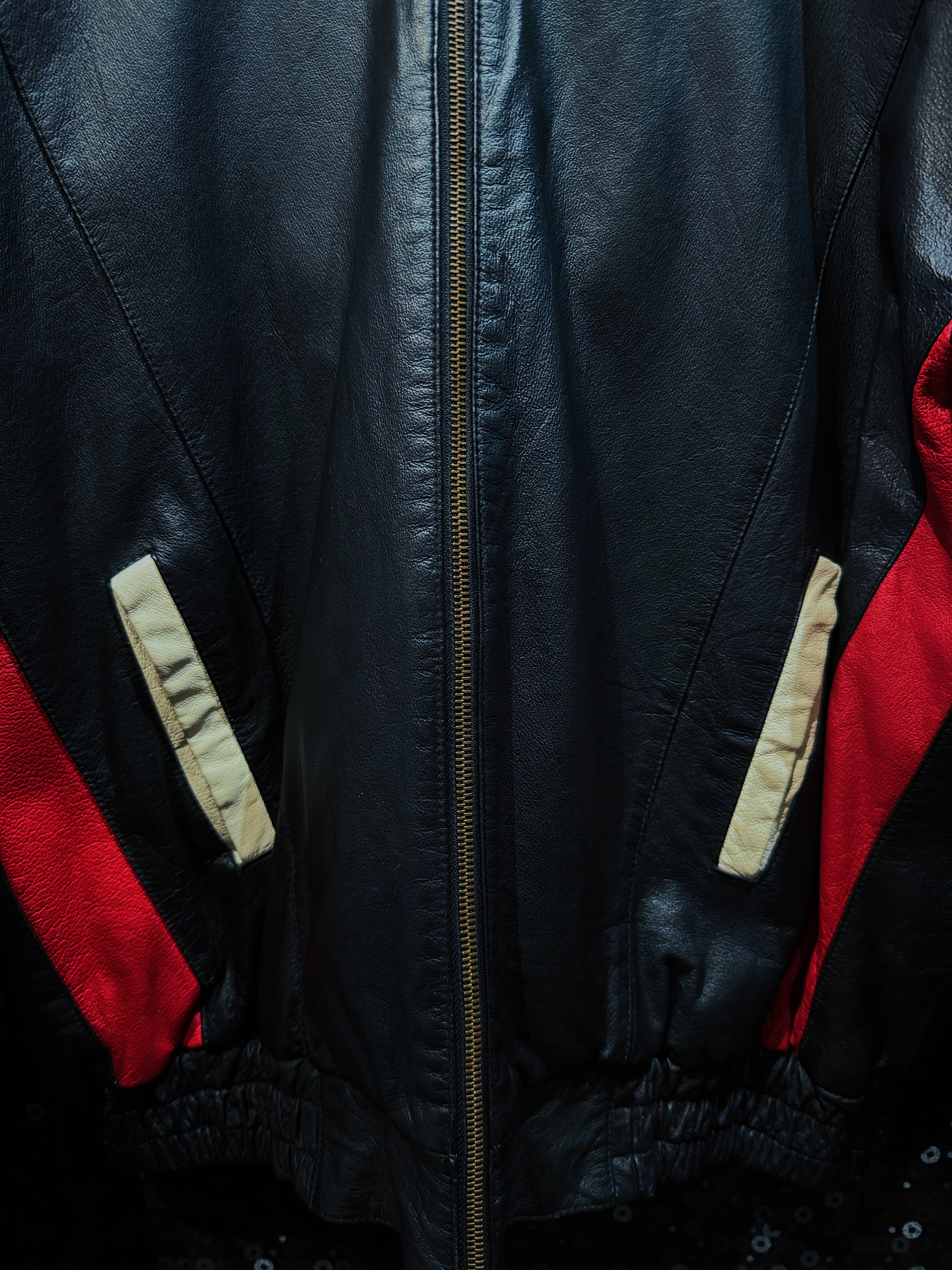 フロントにはシンプルなブラックレザーが用いられ、袖には「USA」の文字が大胆に施されています。さらに、袖の下部には赤と白のストライプが入り、星条旗の要素を取り入れたデザインになっています。