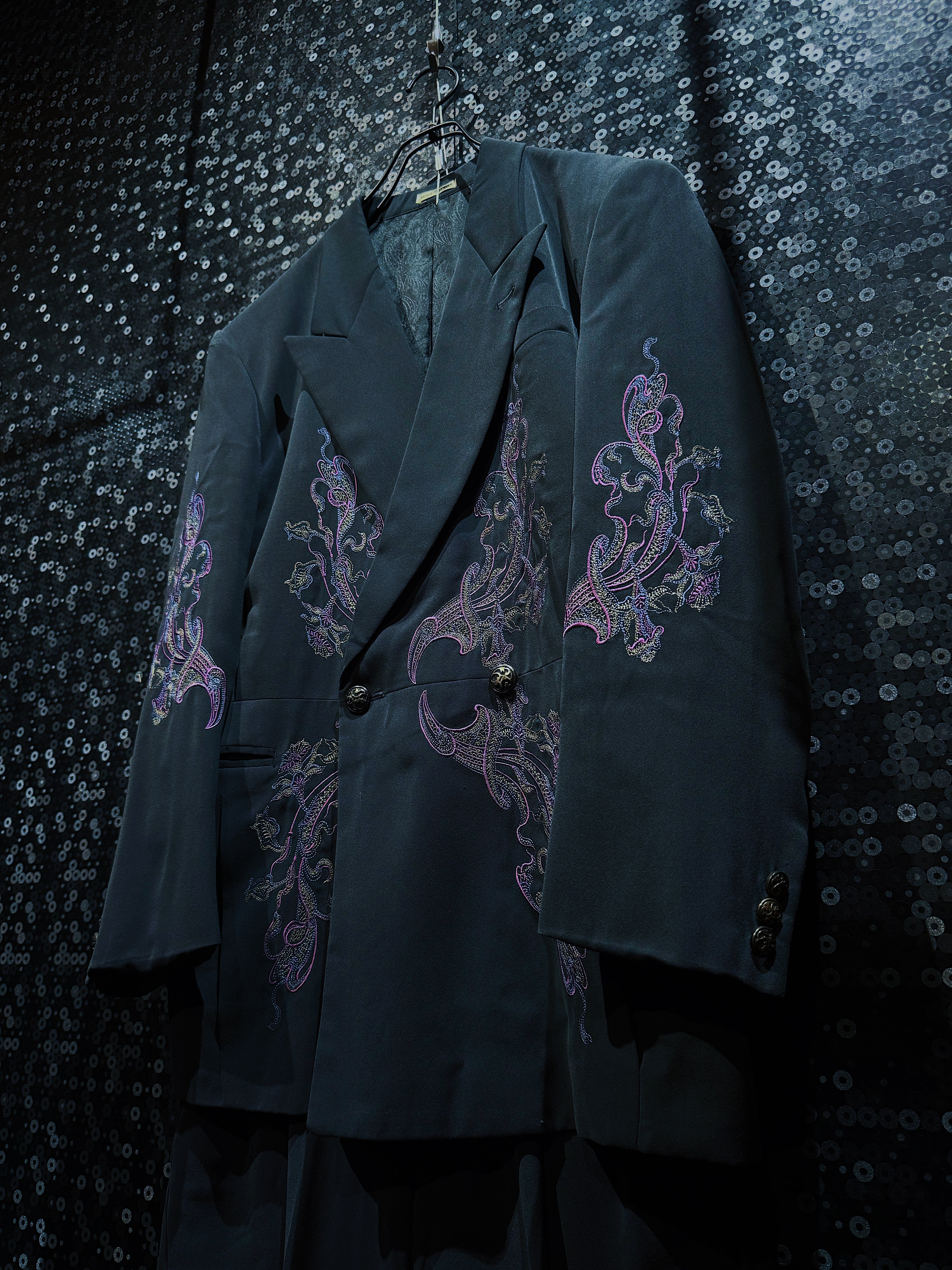 ジャケットはダブルブレスト仕様で、ワイドなピークドラペルが洗練されたシルエットを演出しています。フロントと袖に施されたパープル系の刺繍は、曲線的なデザインが印象的で、繊細ながらも存在感を放つ仕上がり。