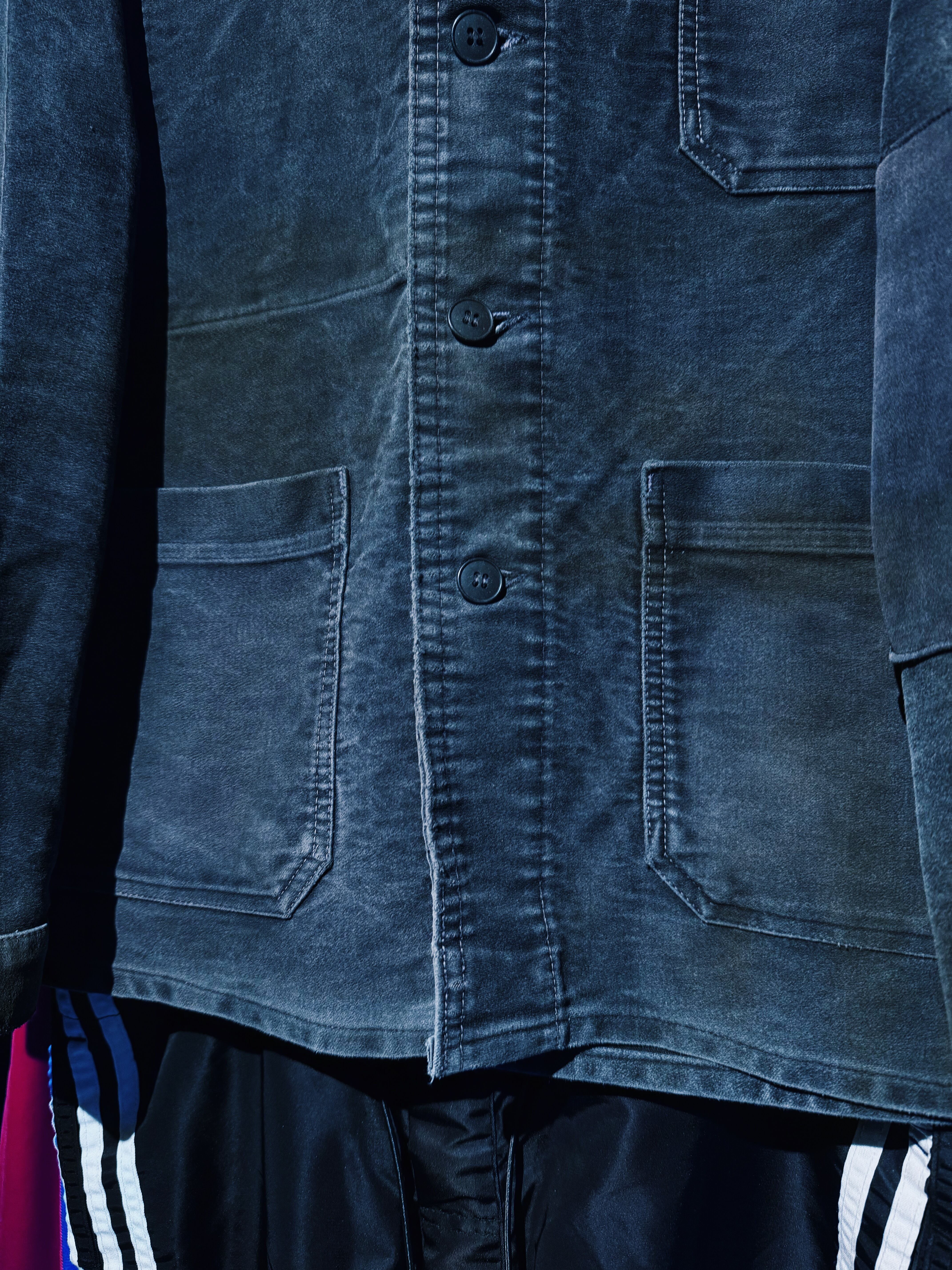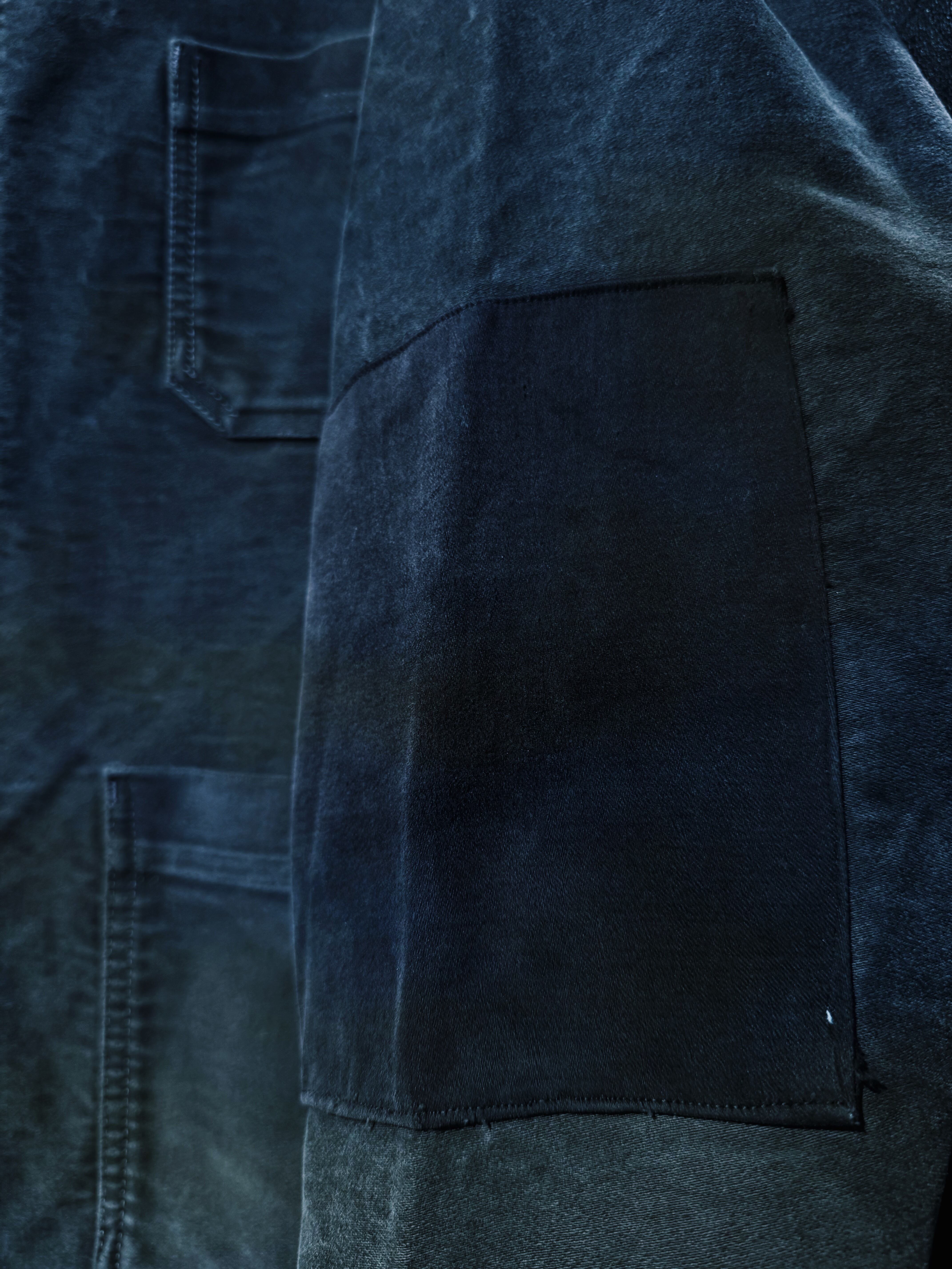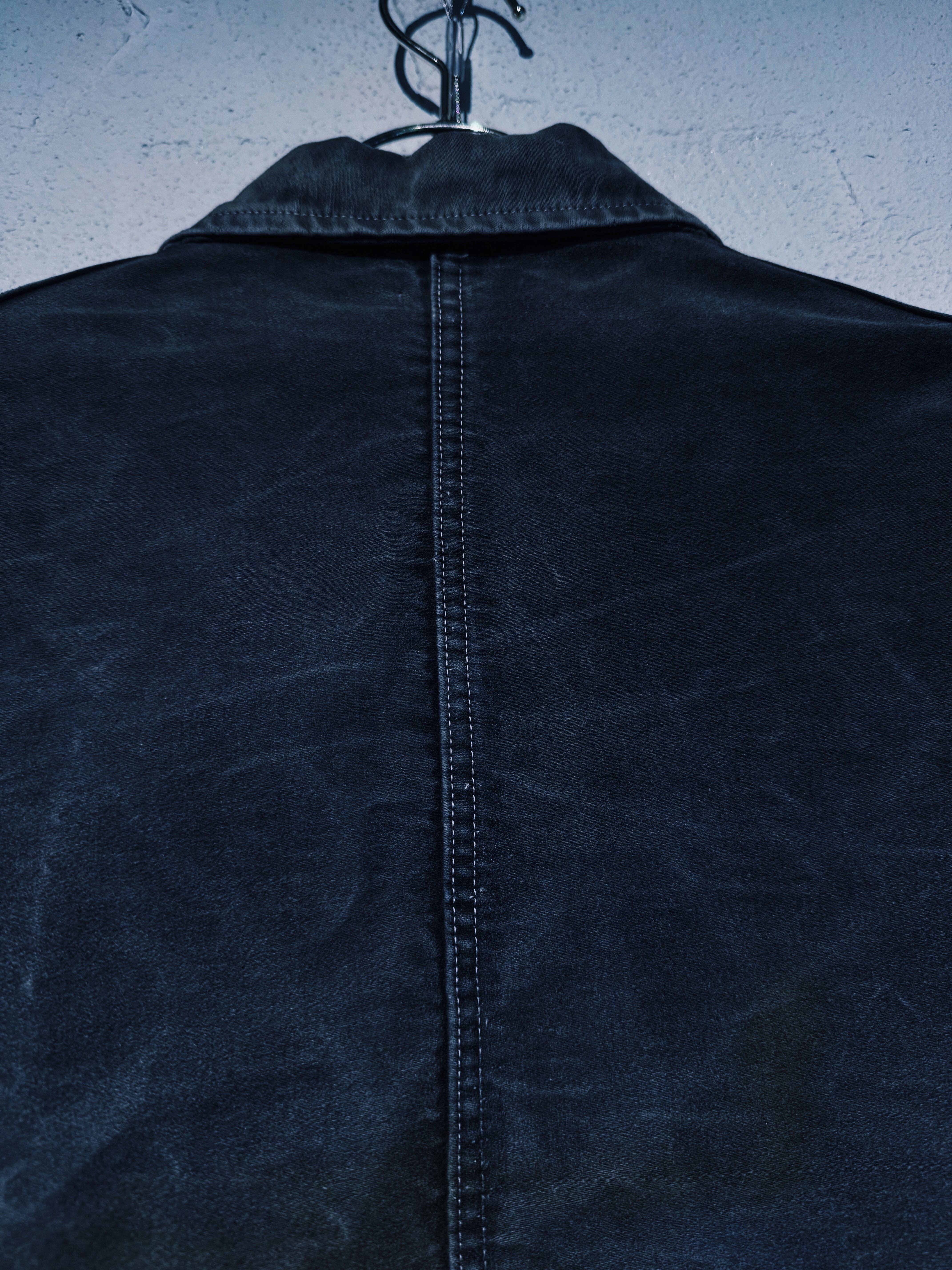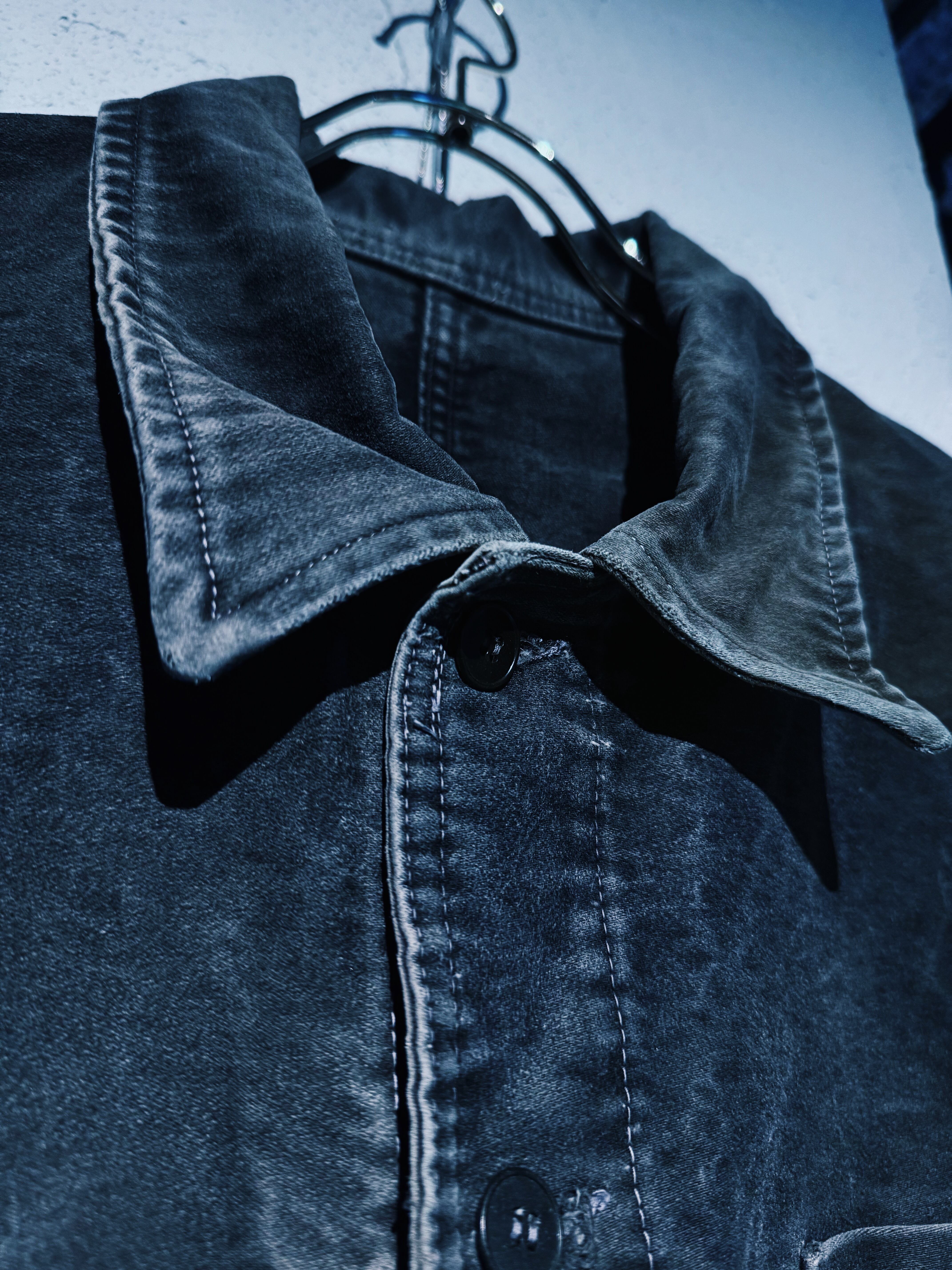50年代頃のフレンチモールスキンワークジャケット。フェードブラックのボディが全体的にフェードした素晴らしいエイジングです。ラウンドした襟の形状や、Vポケットなど古い年代に見られるディティールです。