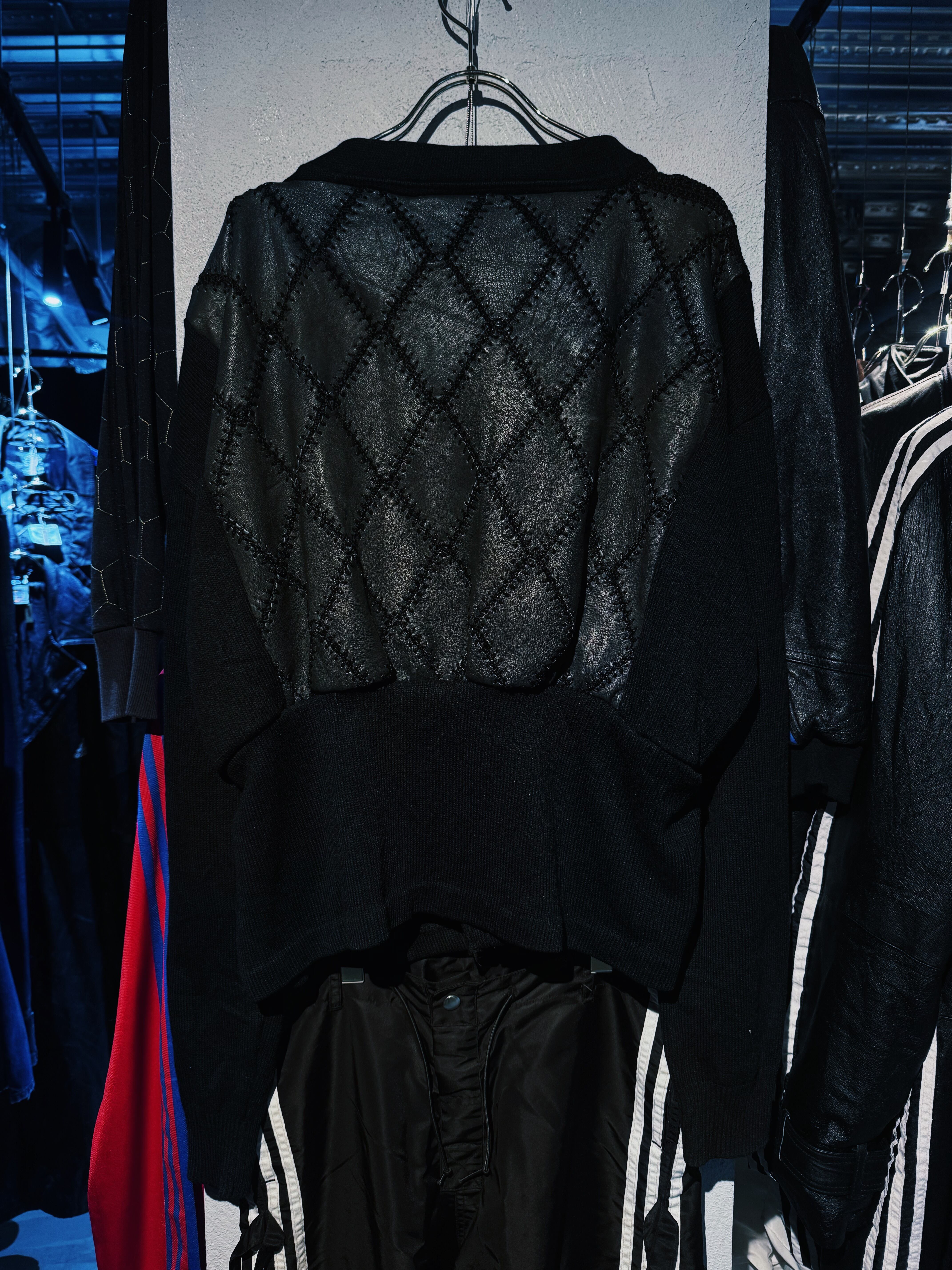 菱形で切り取られたブラックカラーの上質なレザーをツギハギし、非常に発色の良いレッドのカーディガンにドッキングしたスペシャルアイテム。