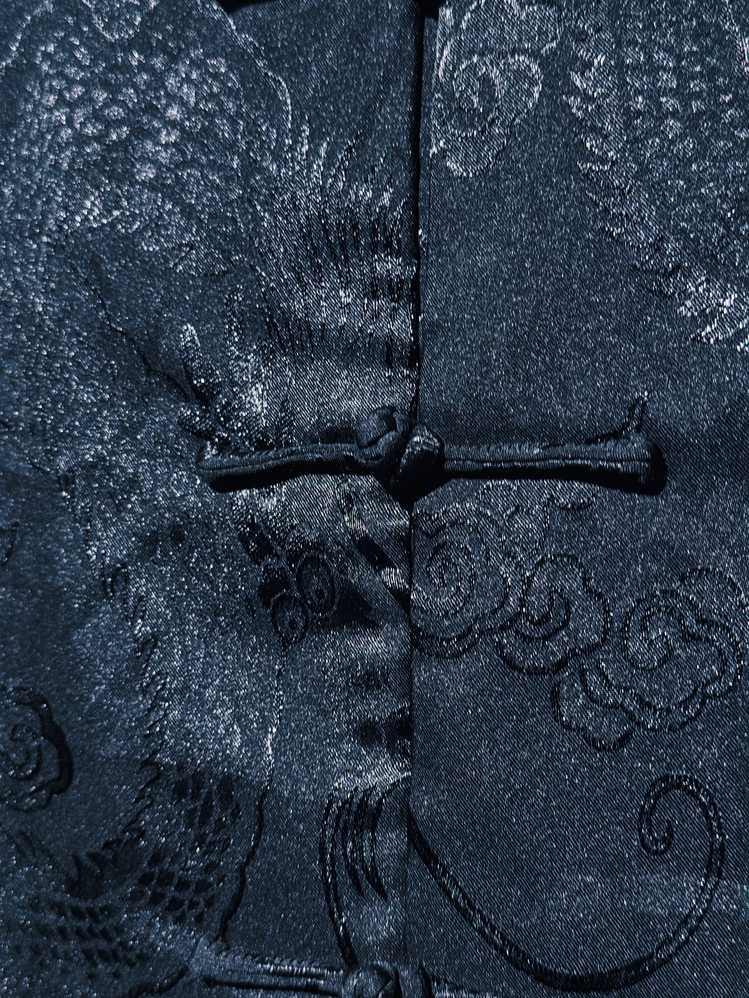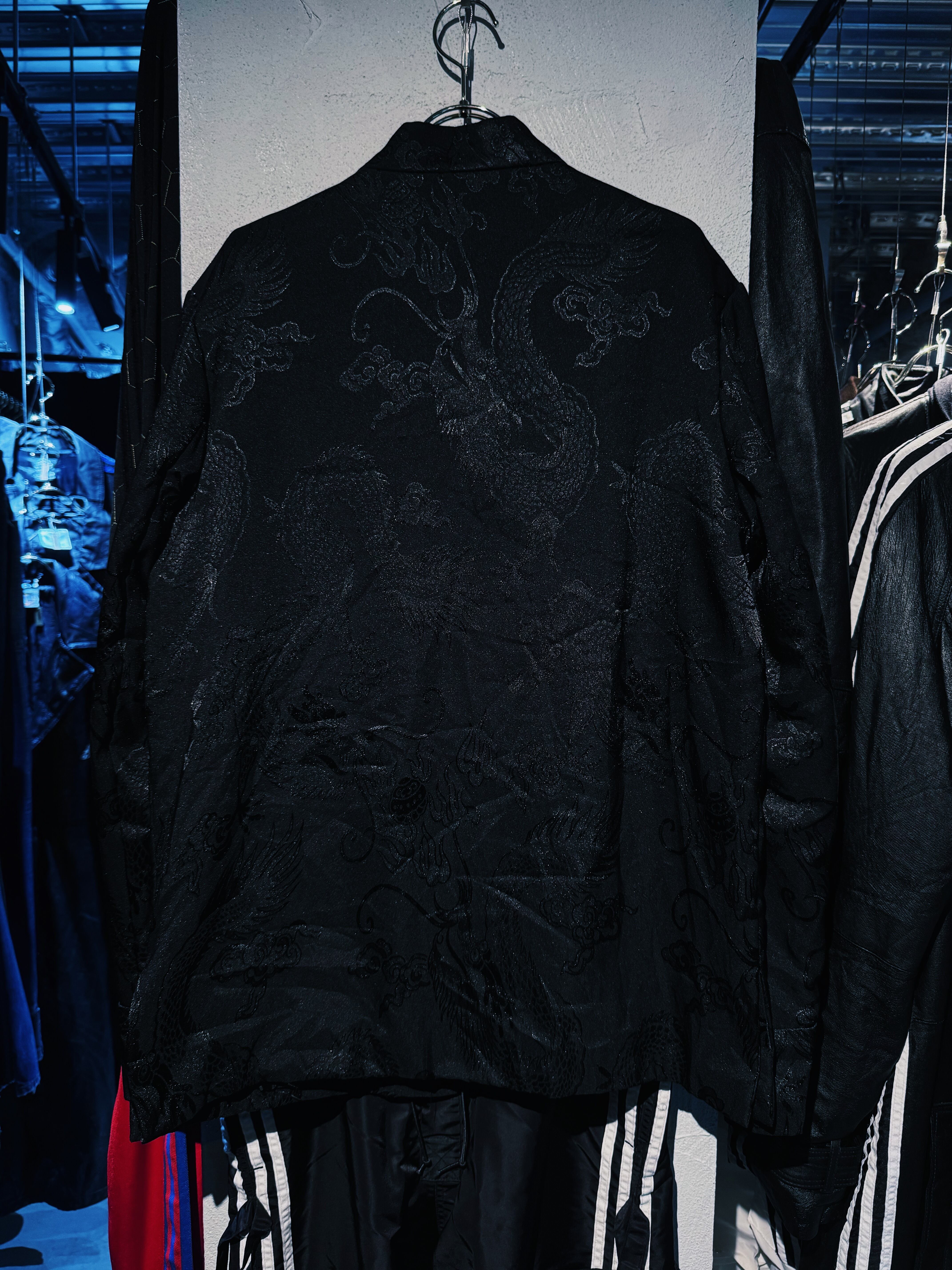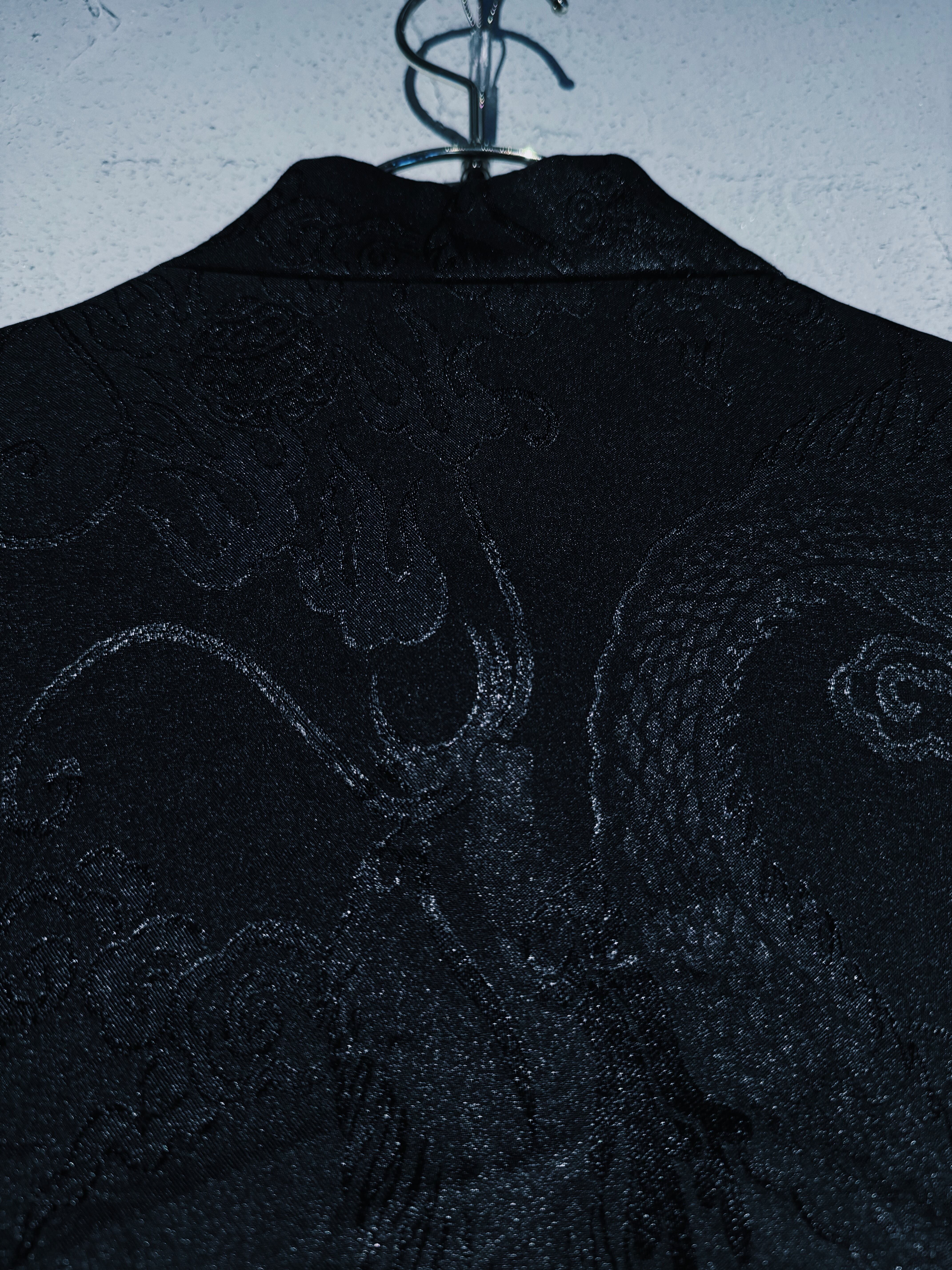 龍や花、雲と多種なパターンで構成されており、圧巻のマットブラックカラーさらにレトロな雰囲気を醸し出している存在感マシマシのチャイナジャケット。