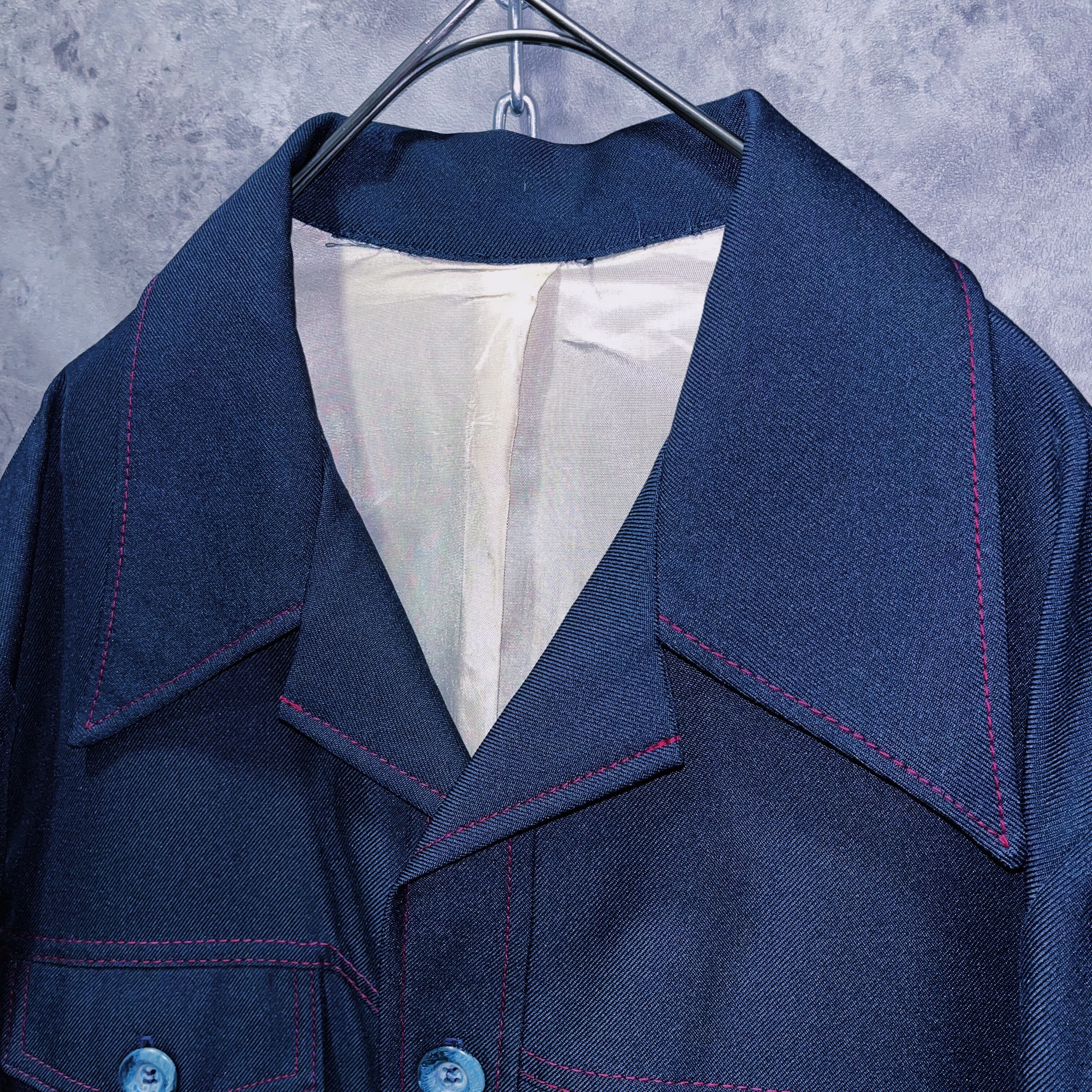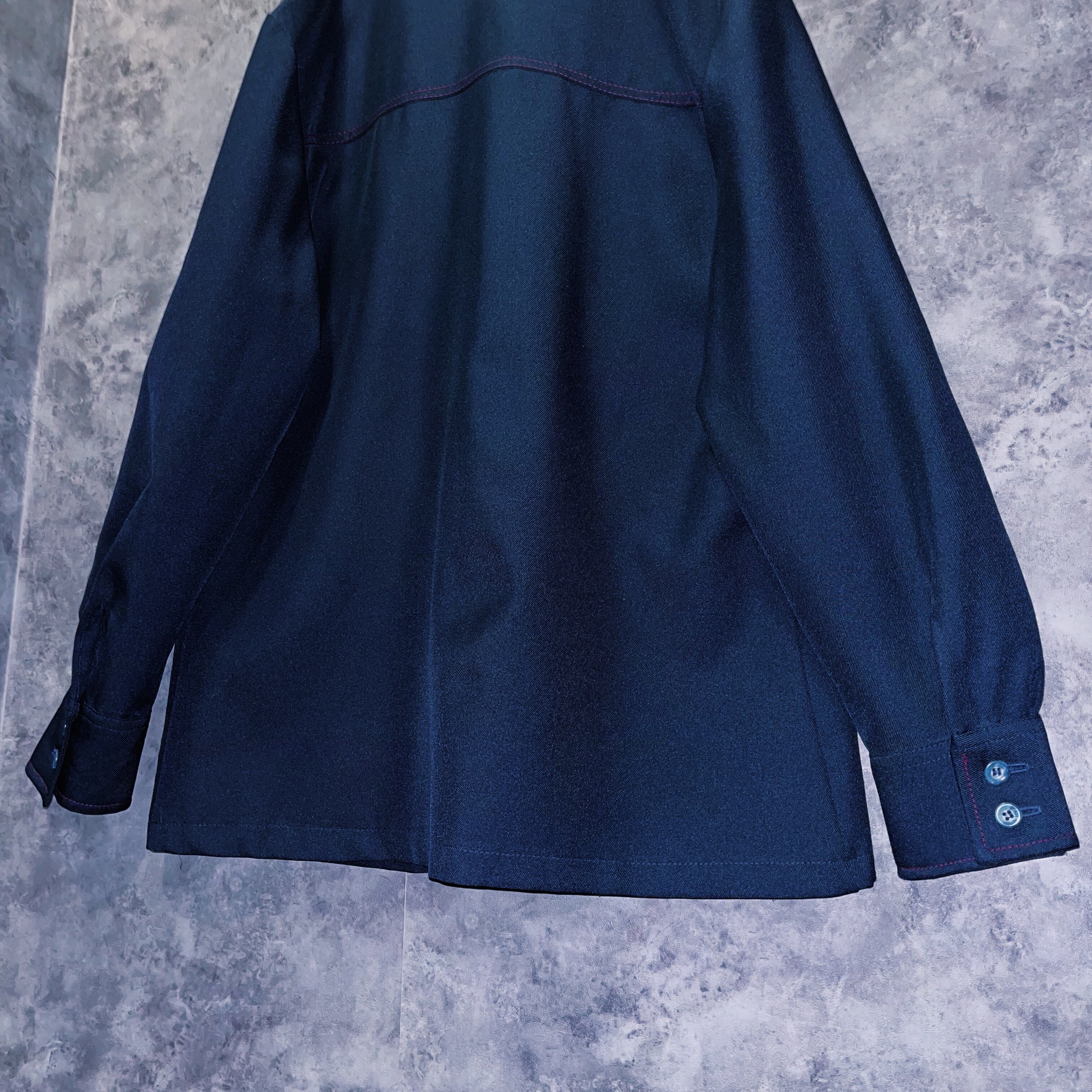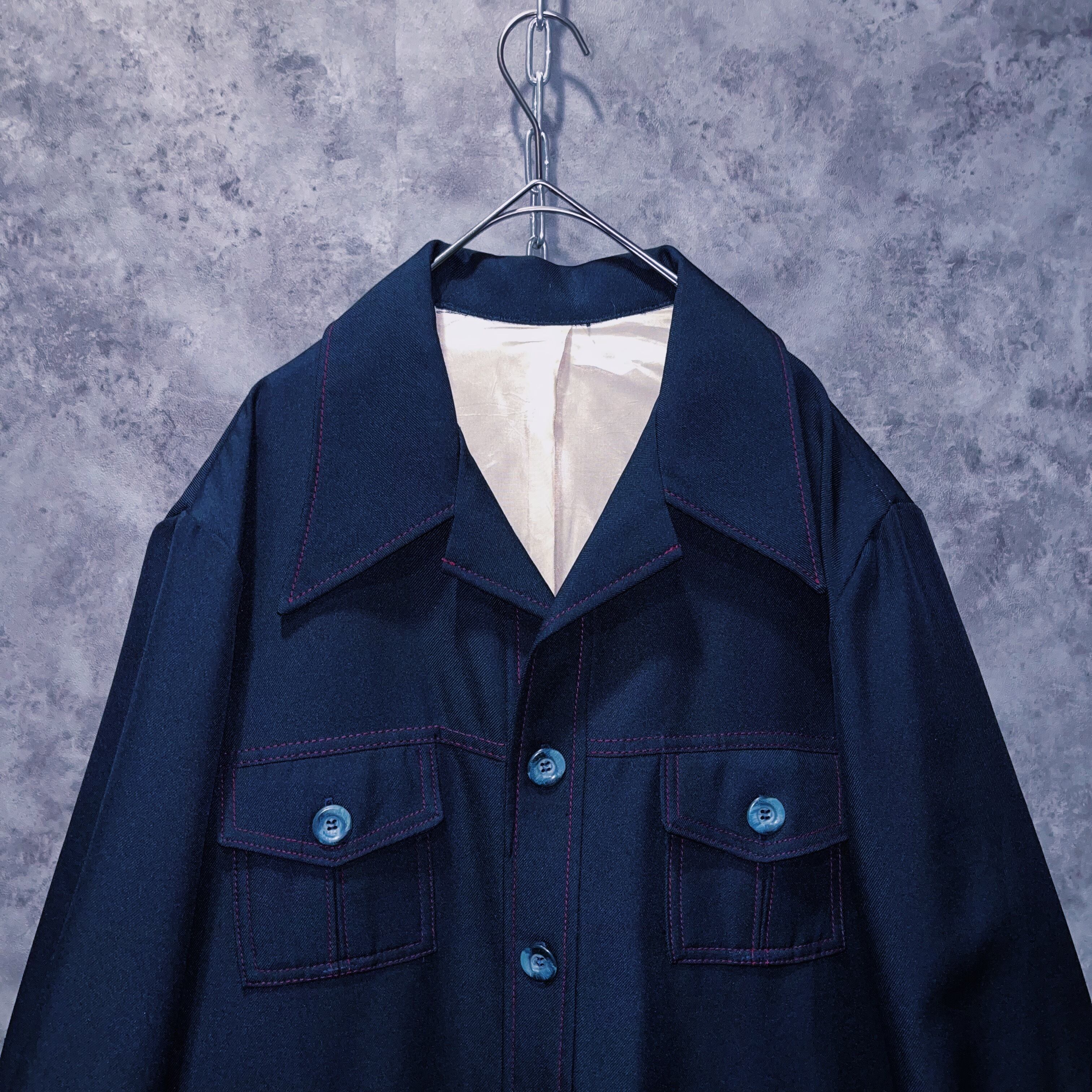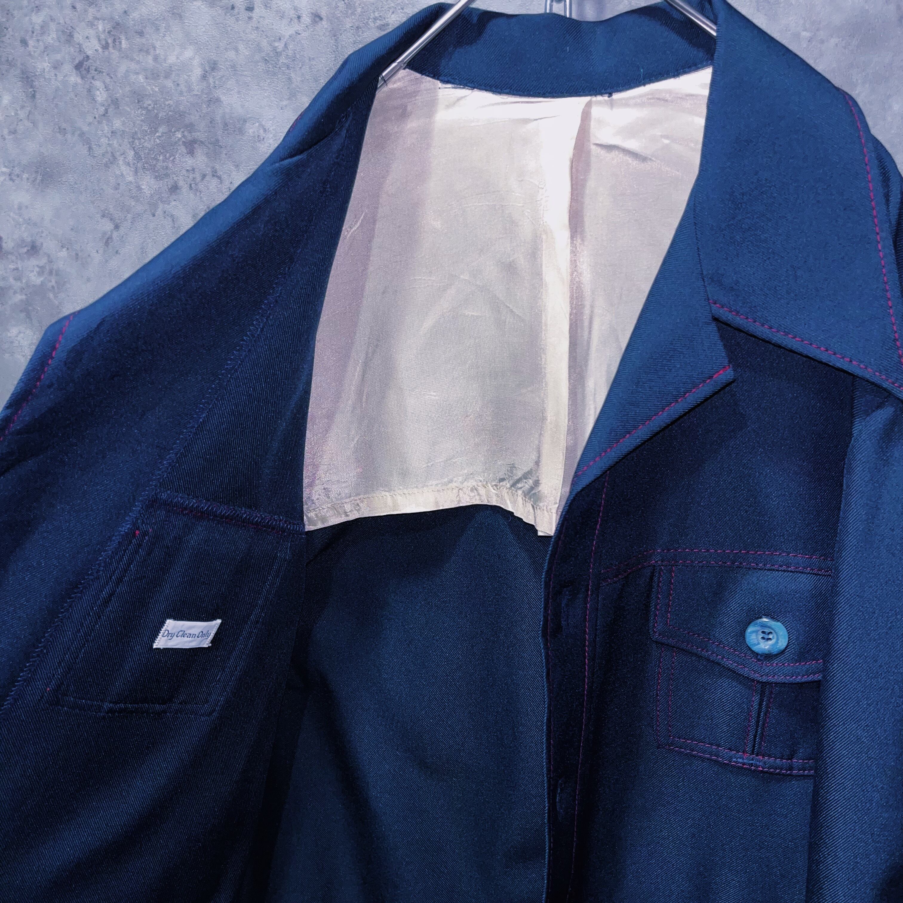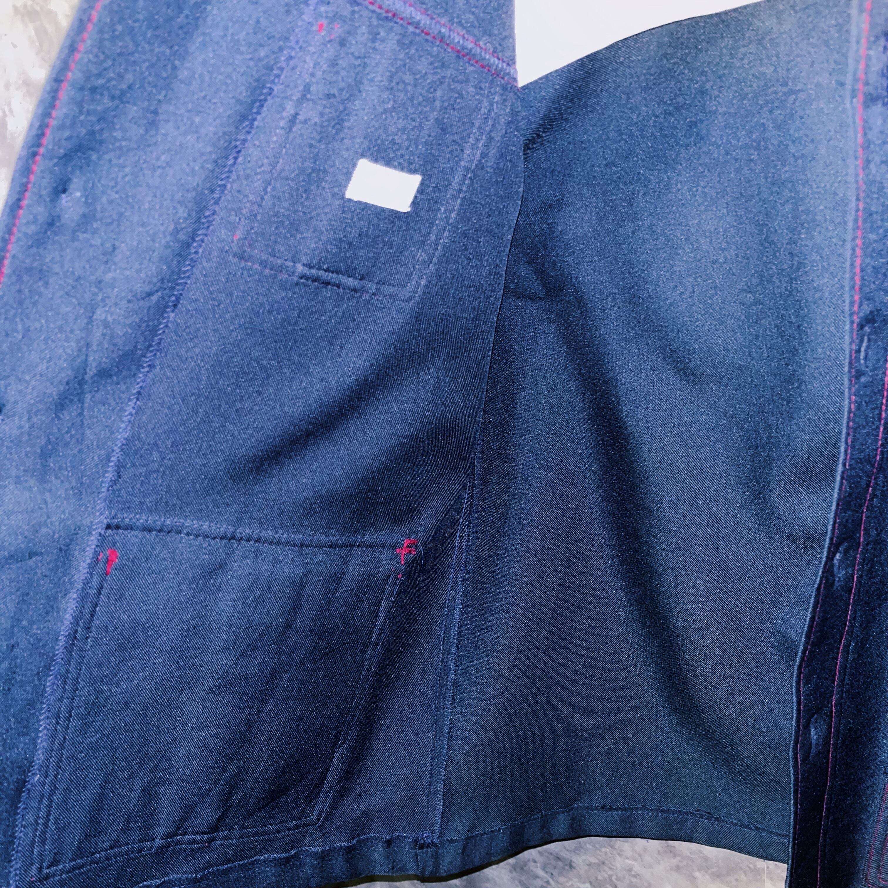 ディープネイビーのボディに入った発色の良いカーマインレッドのステッチがよく映えるデザインの一着。