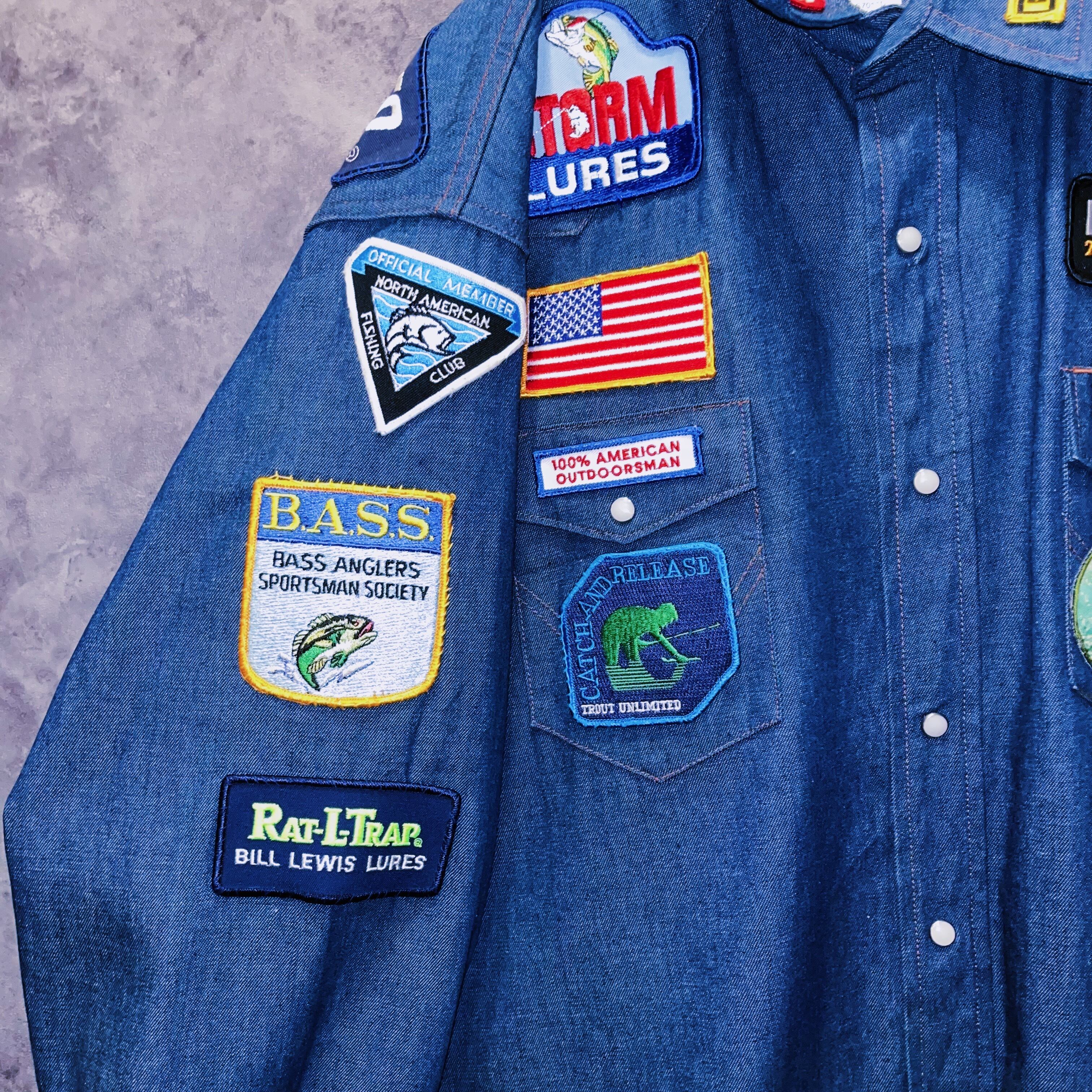 フロント、アーム、バック。全方向どの角度から見ても沢山のワッペンが貼られています。これはどれもバス釣りに関するもので、全てにバスや釣りの要素を含む刺繍がされています。