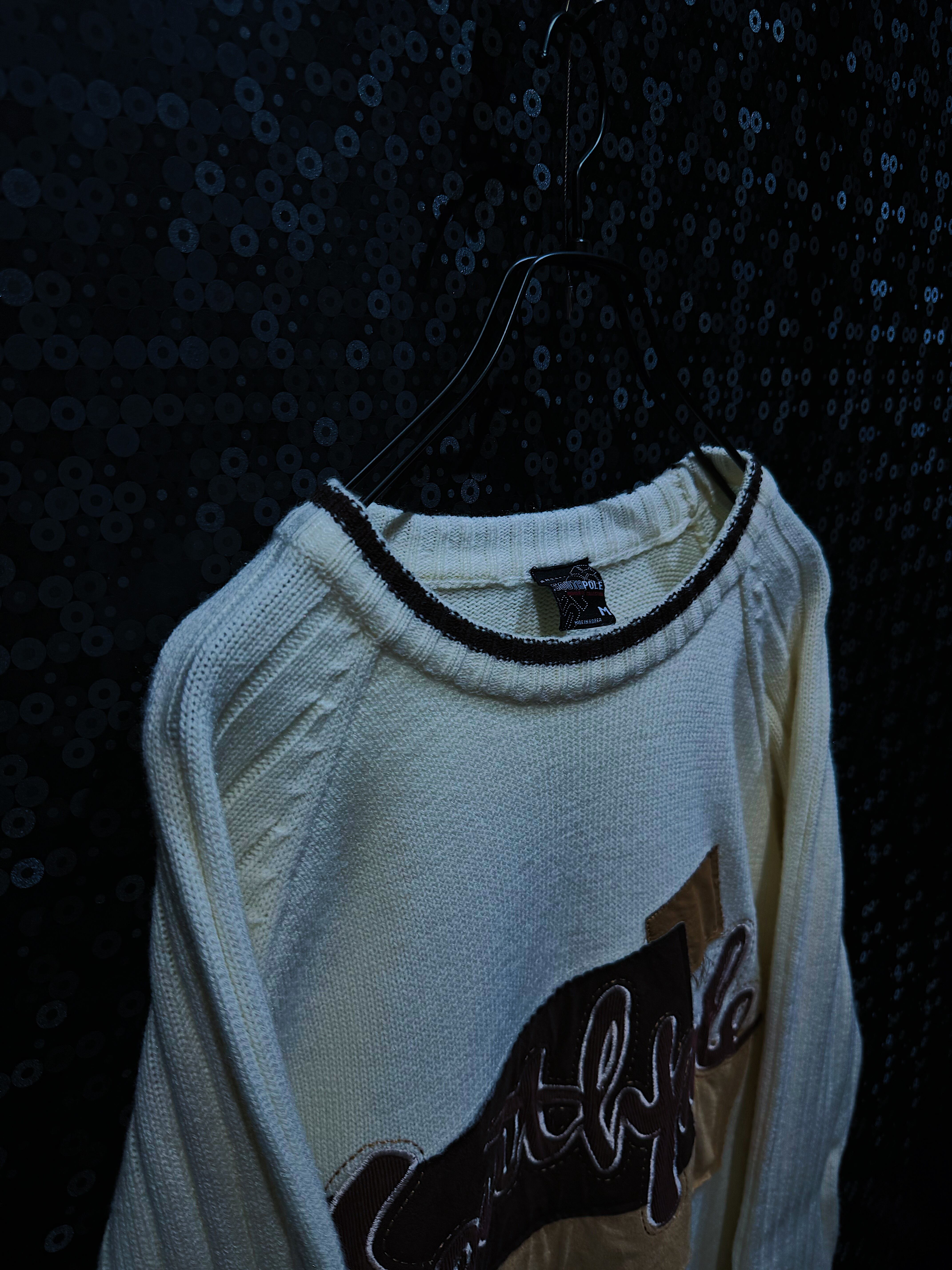このSouthpoleのロゴニットセーターは、クラシックなラグランスリーブ仕様で肩まわりがゆったりと仕立てられており、ストリートらしいリラックスしたシルエットが特徴的。