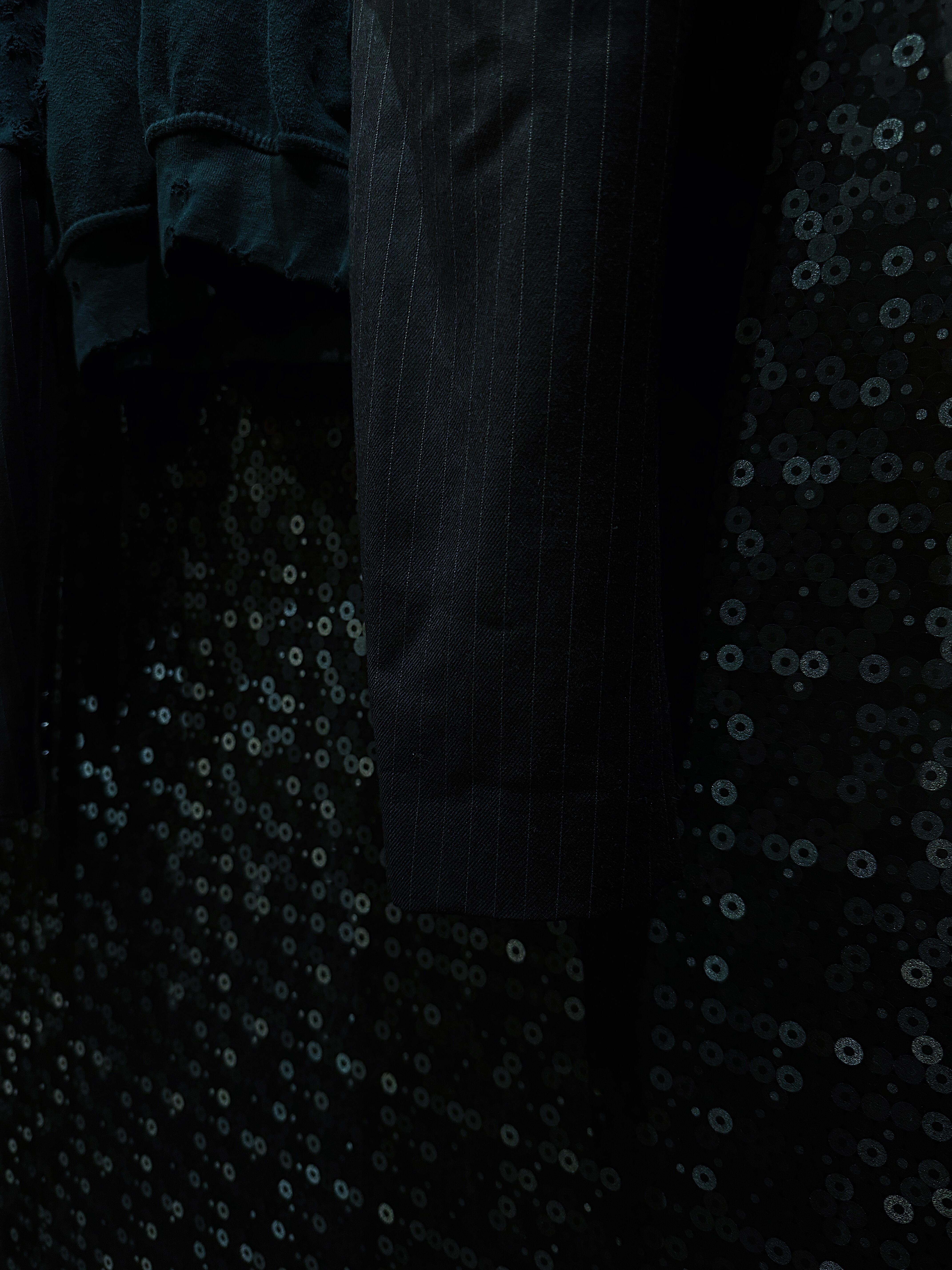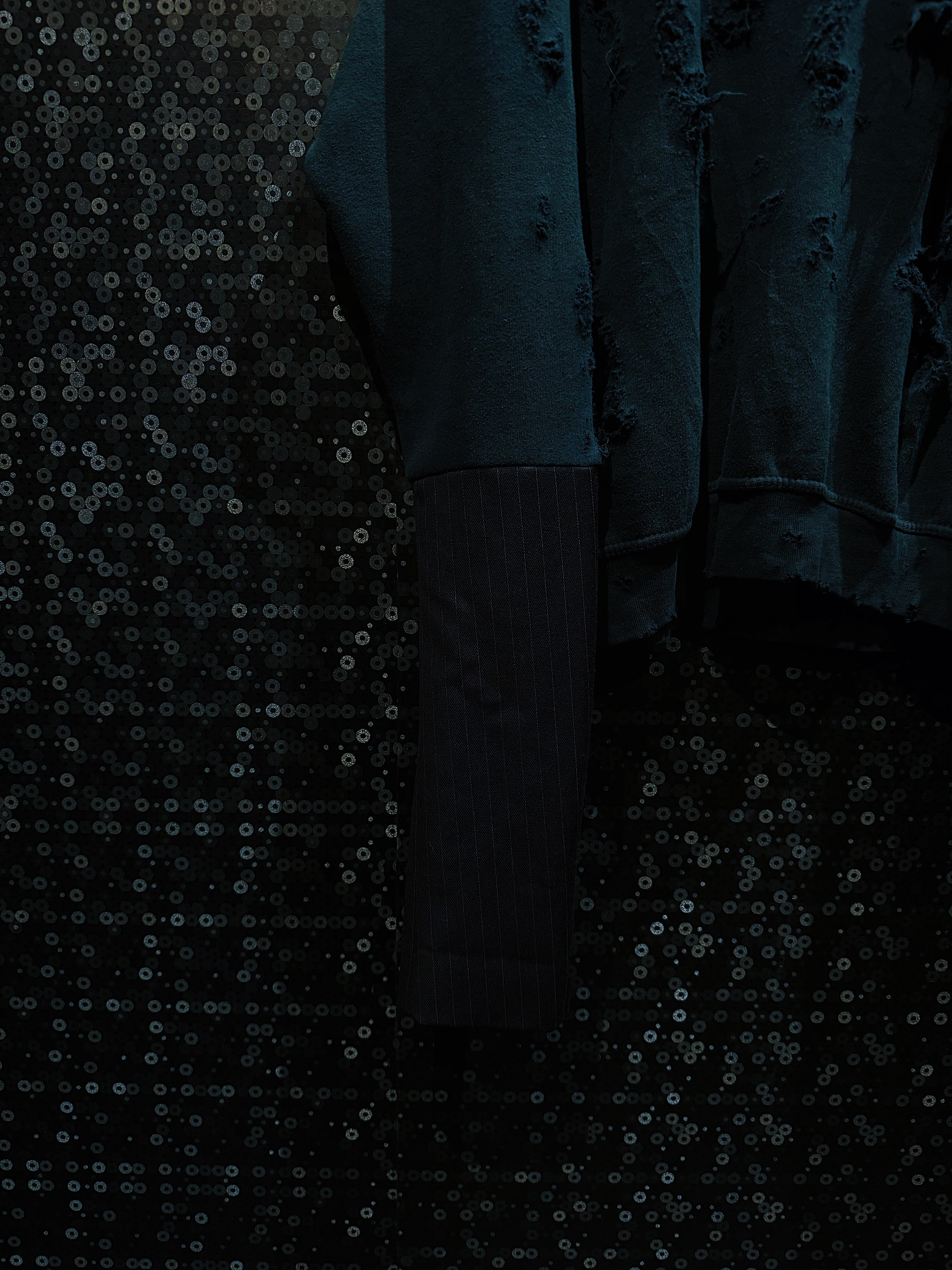 随所に大胆なダメージ加工を施し、年月を重ねたようなヴィンテージ感を表現しながら、袖にはスーツ地を使用した延長カスタムを採用。