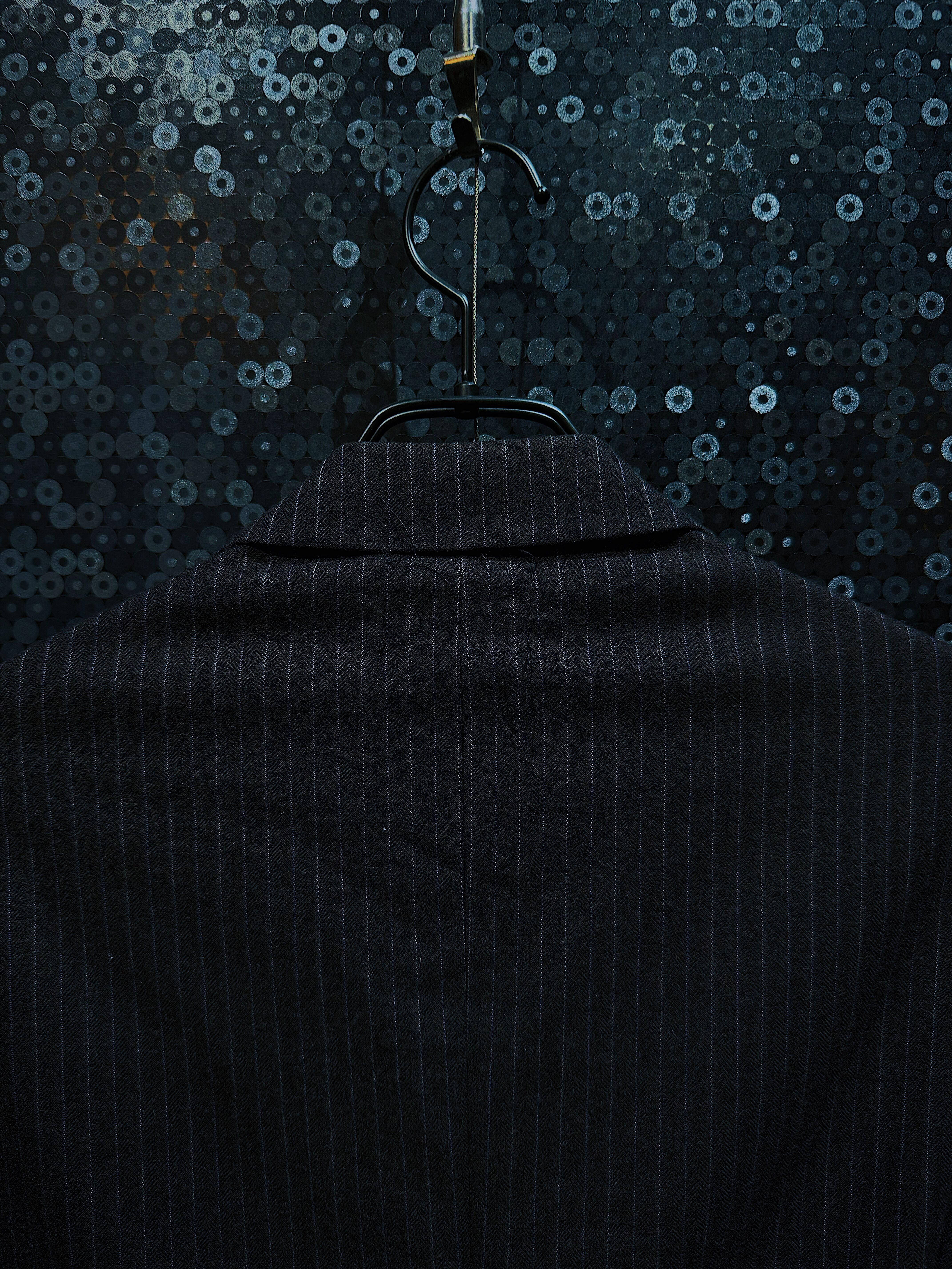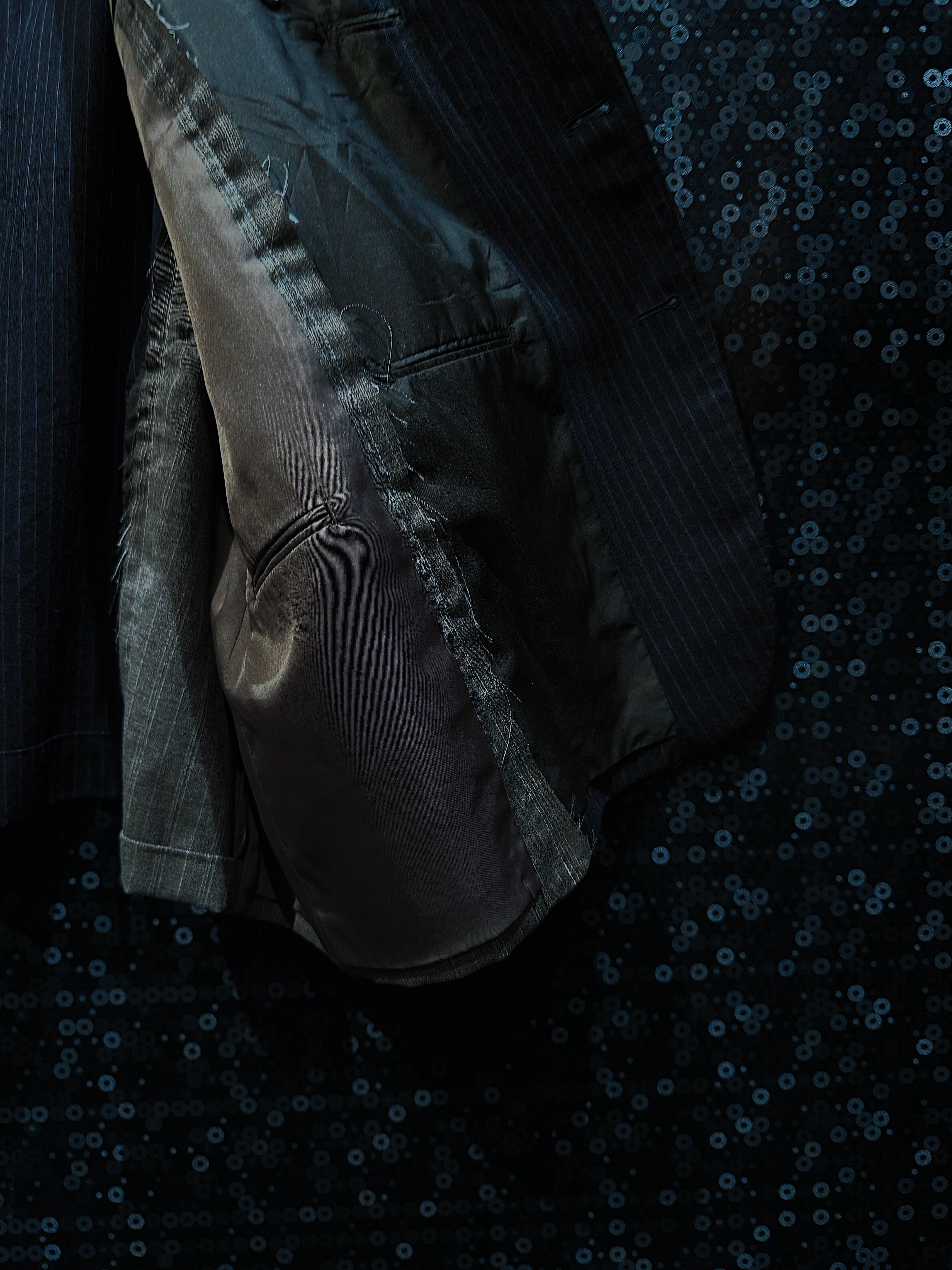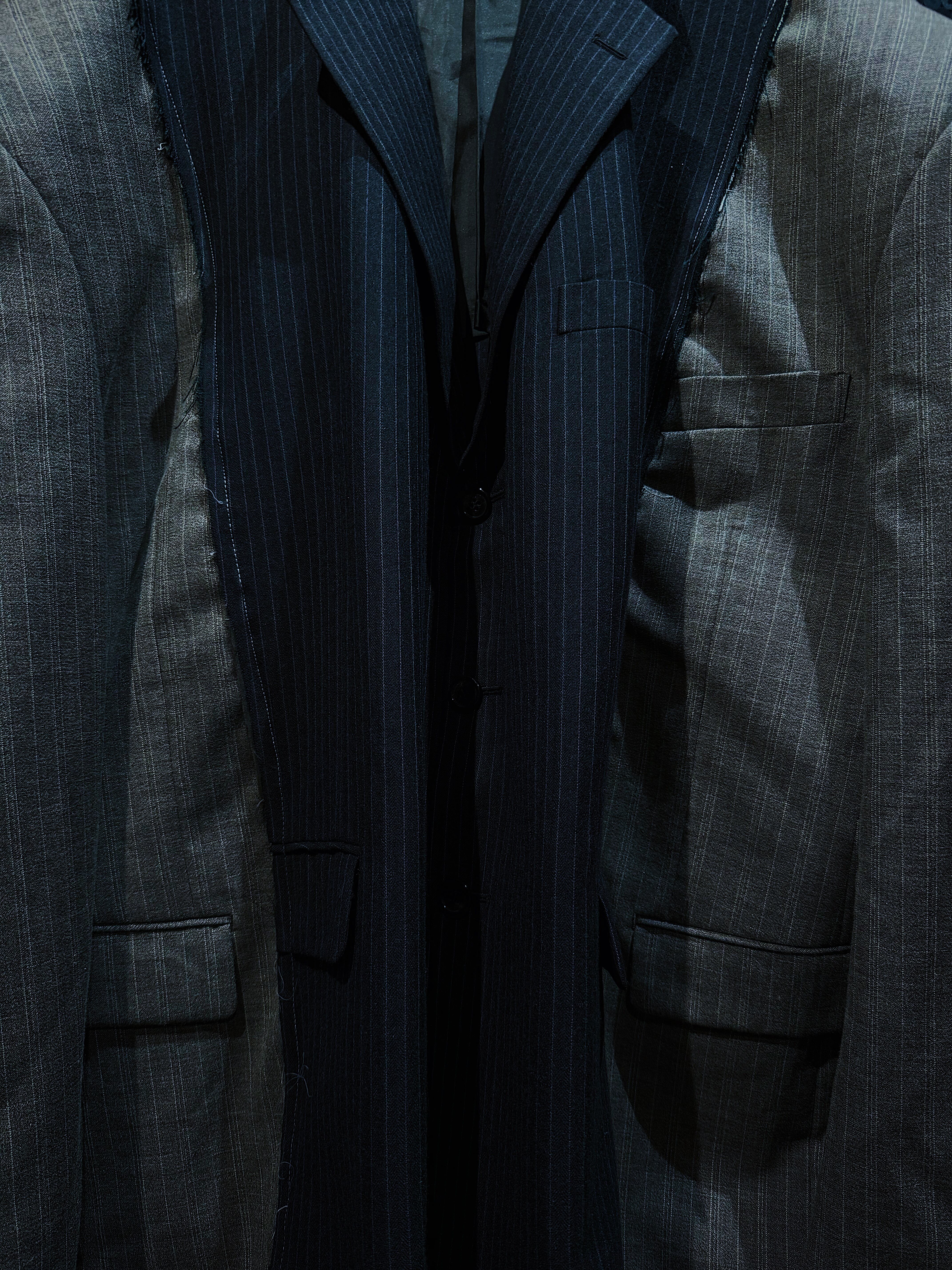 左右で異なるトーンとピンストライプが織りなすコントラストが、視覚的にも強い印象を与える一着。直線と曲線、過去と現在が交錯するシルエットは、再構築の真髄そのものです。