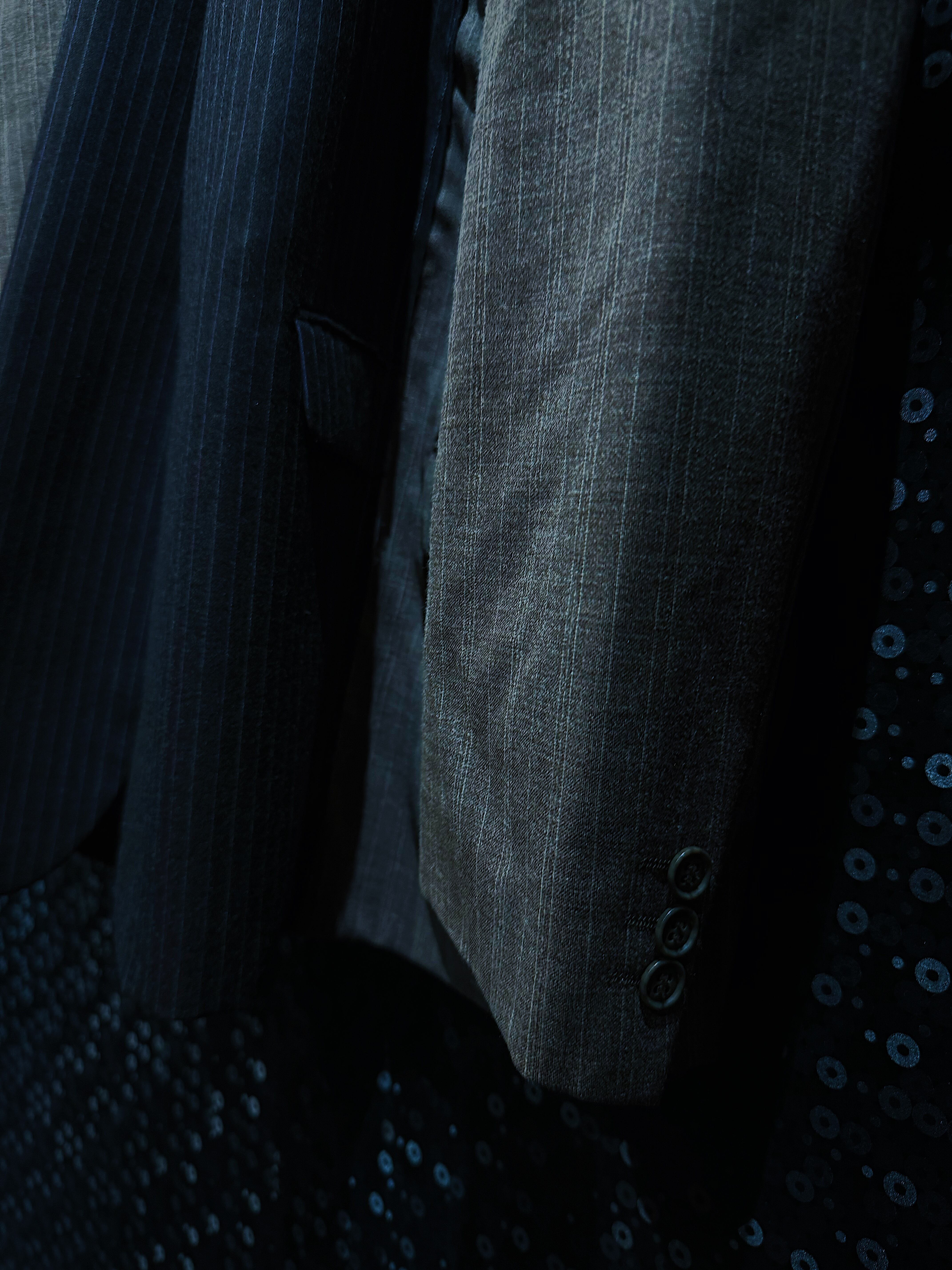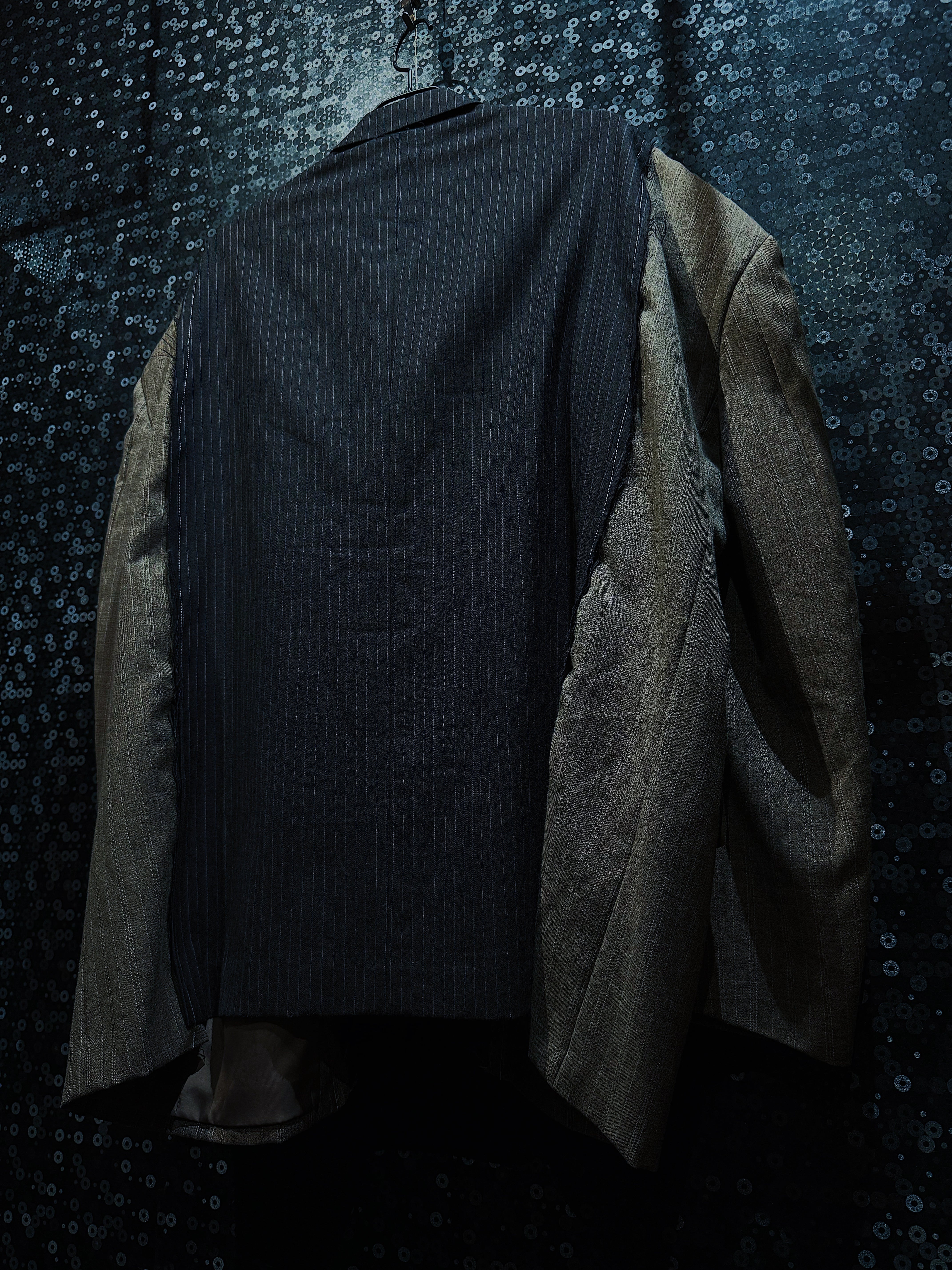 異なる二着のヴィンテージテーラードを中央で大胆に縫い合わせ、新たな形として再構築。あえて生地の切り替えや縫い目を露出させることで、アートピースとしての存在感を強調しています。