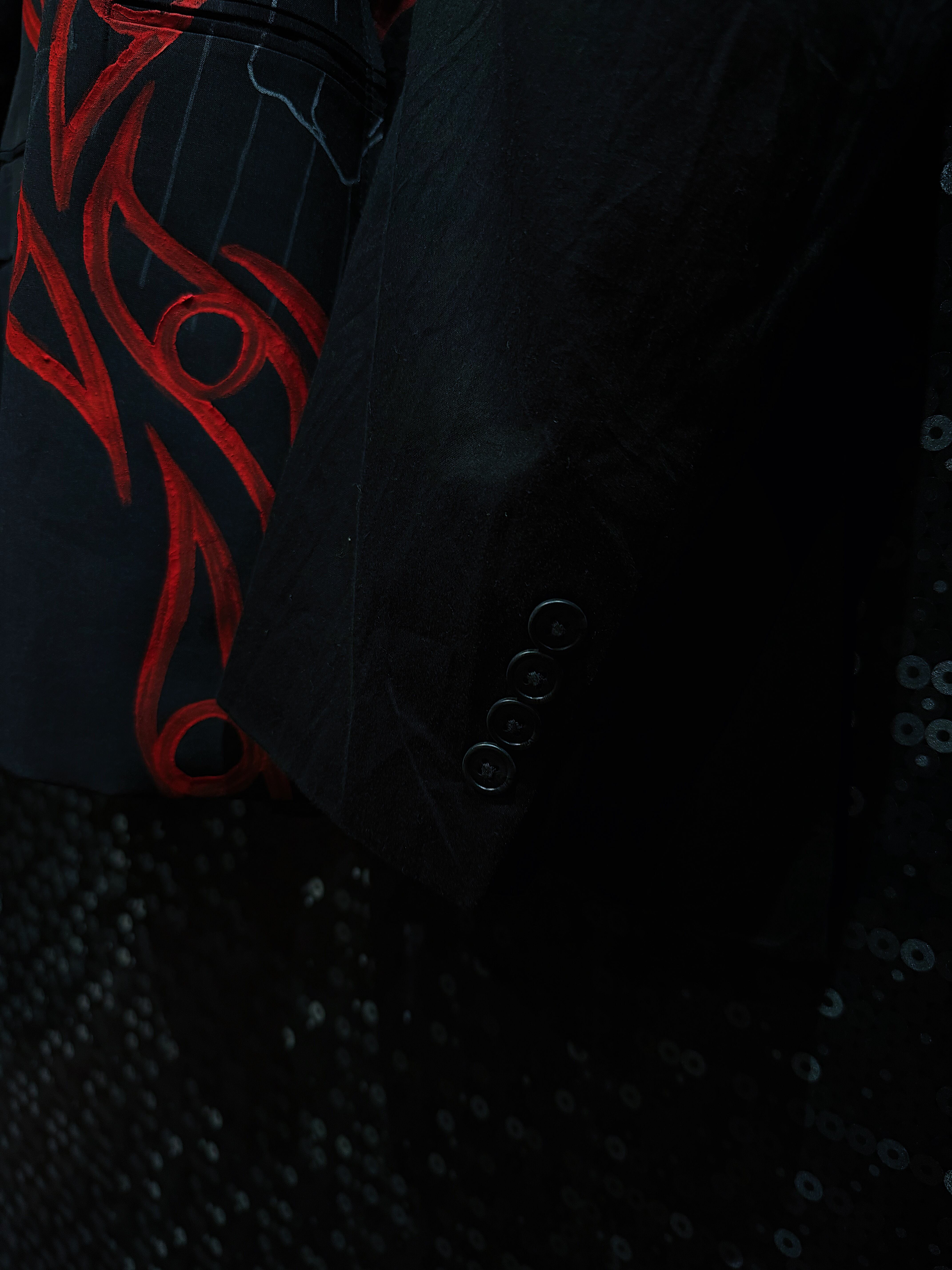 黒のダブルテーラードをベースに、赤と白で描かれた“目と木”のモチーフが浮かび上がるアートワークは圧巻で、視線を集めずにはいられない存在感を放つ。