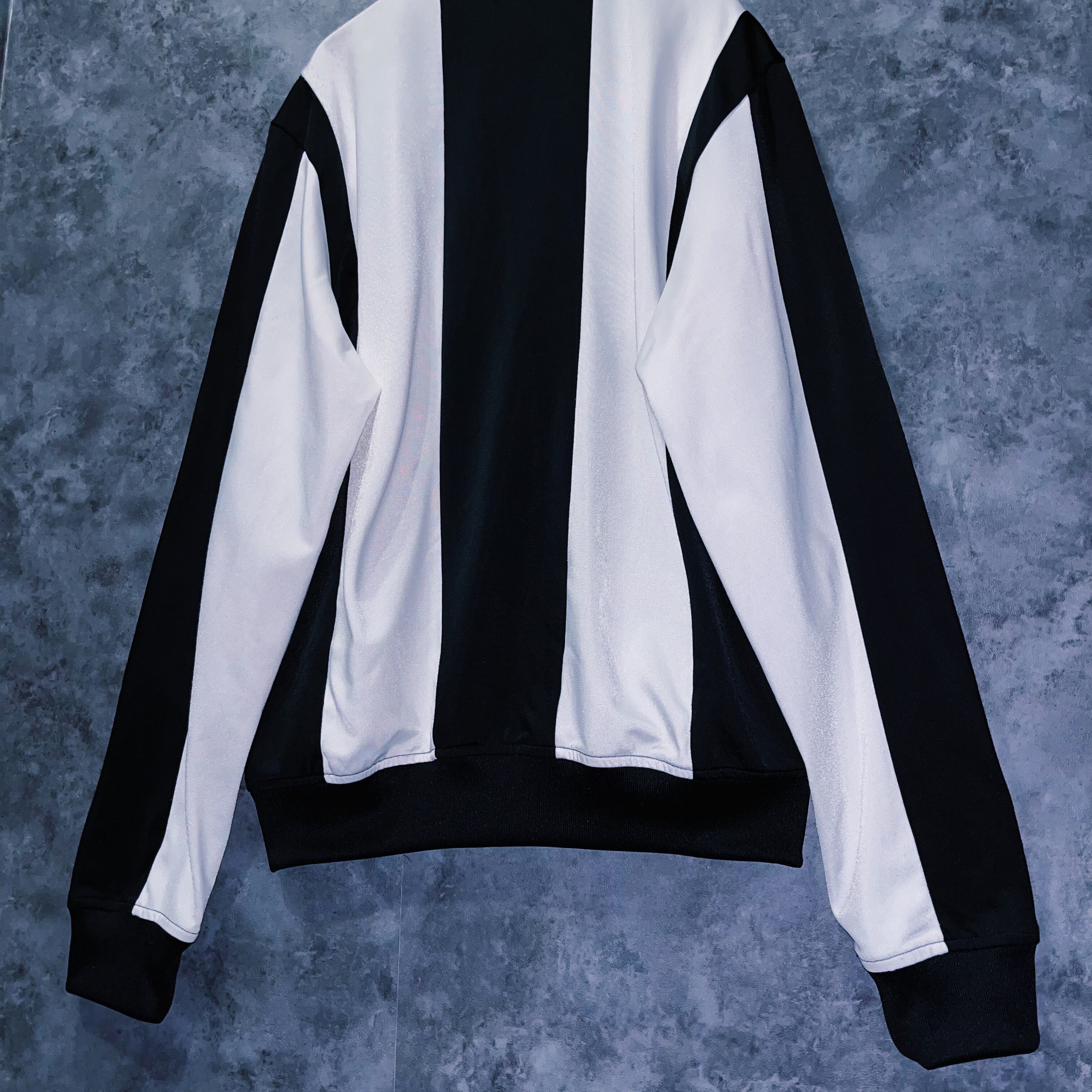 ブラック×ホワイトというシンプルなカラーですが、さすがvintage adidas 退屈にはさせてくれません。両アームに一本ずつ、フロントに一本黒のストライプを入れることで、全体を見た時にスリーストライプが作られるデザインになっています。