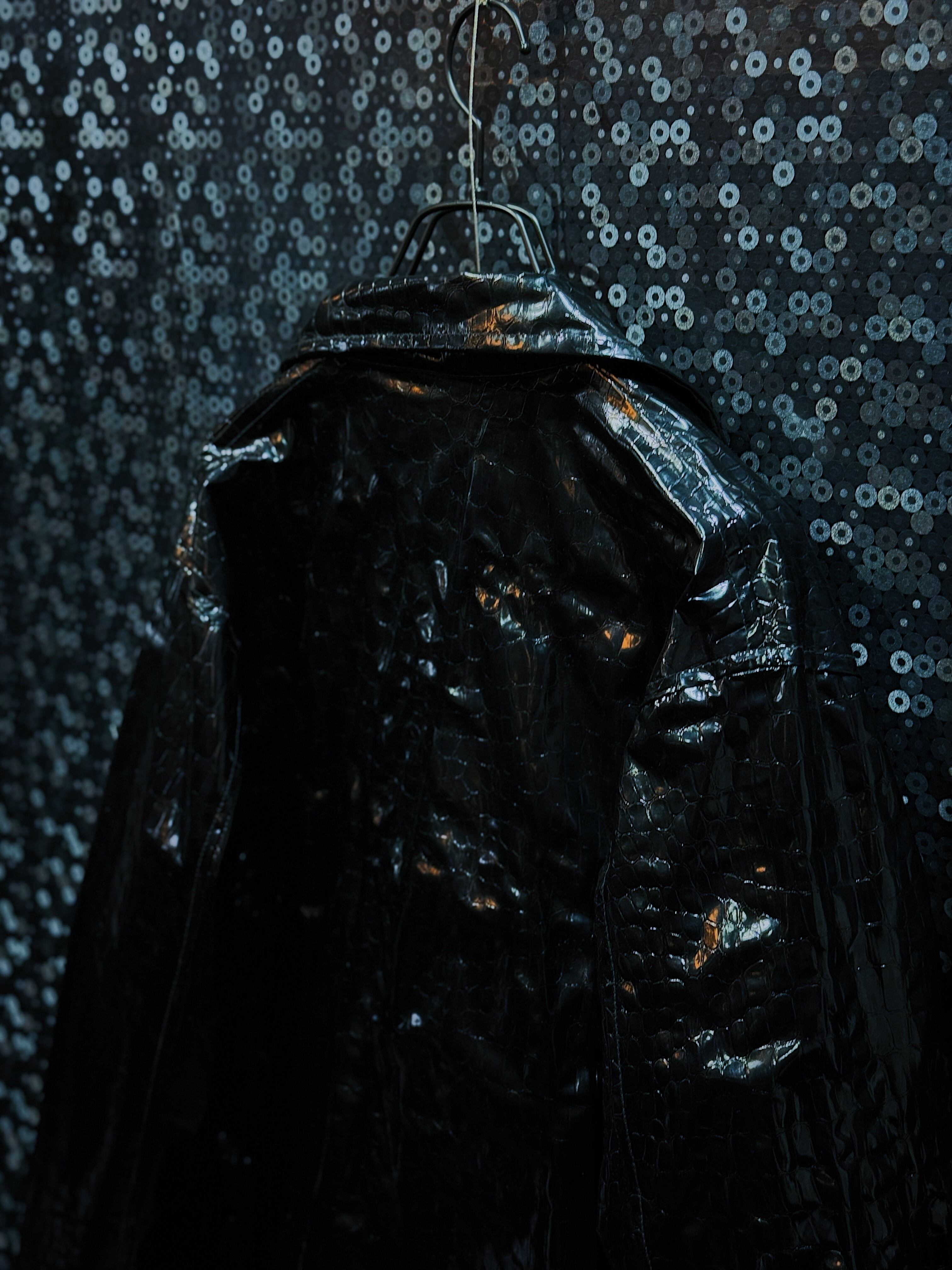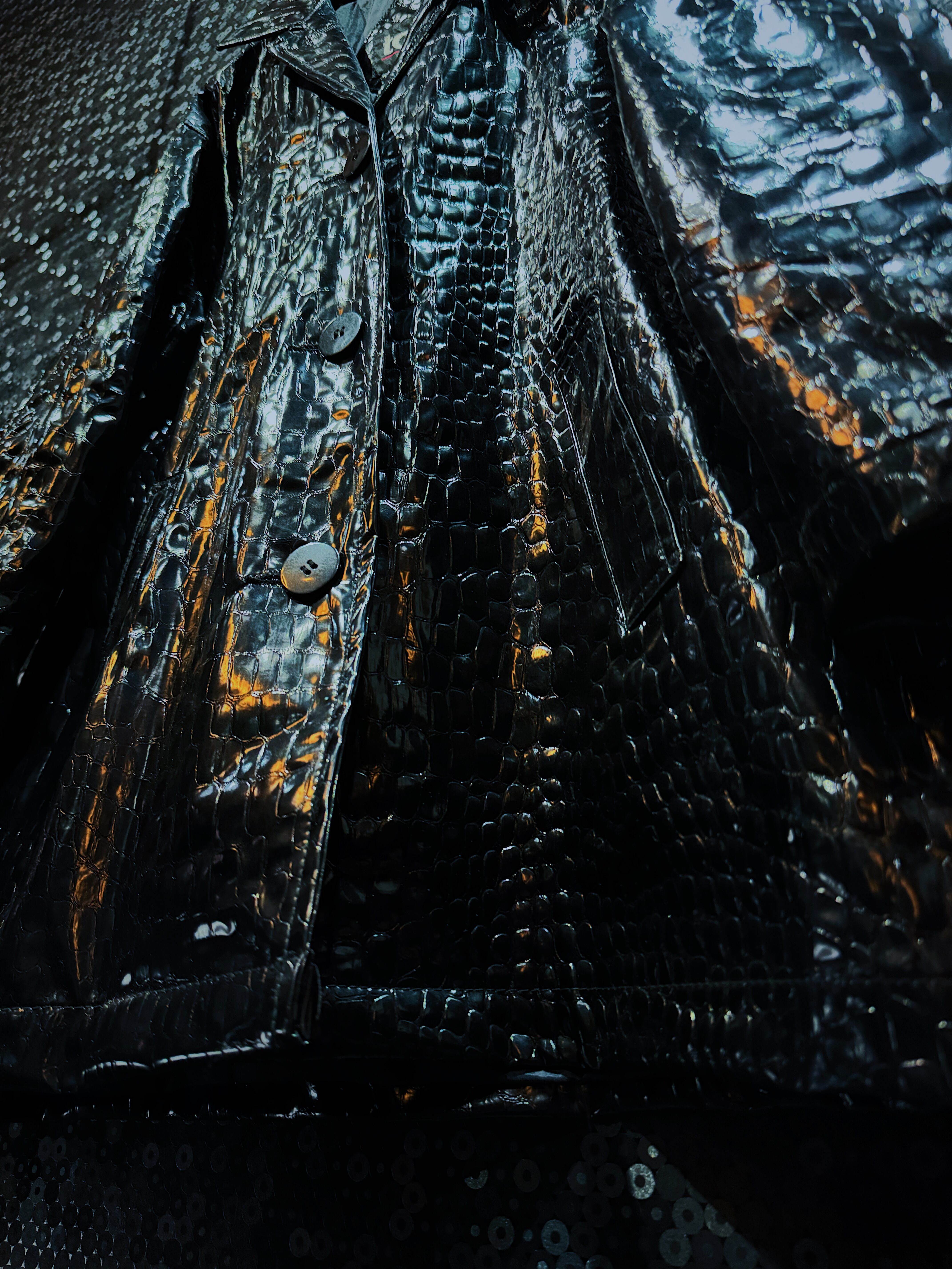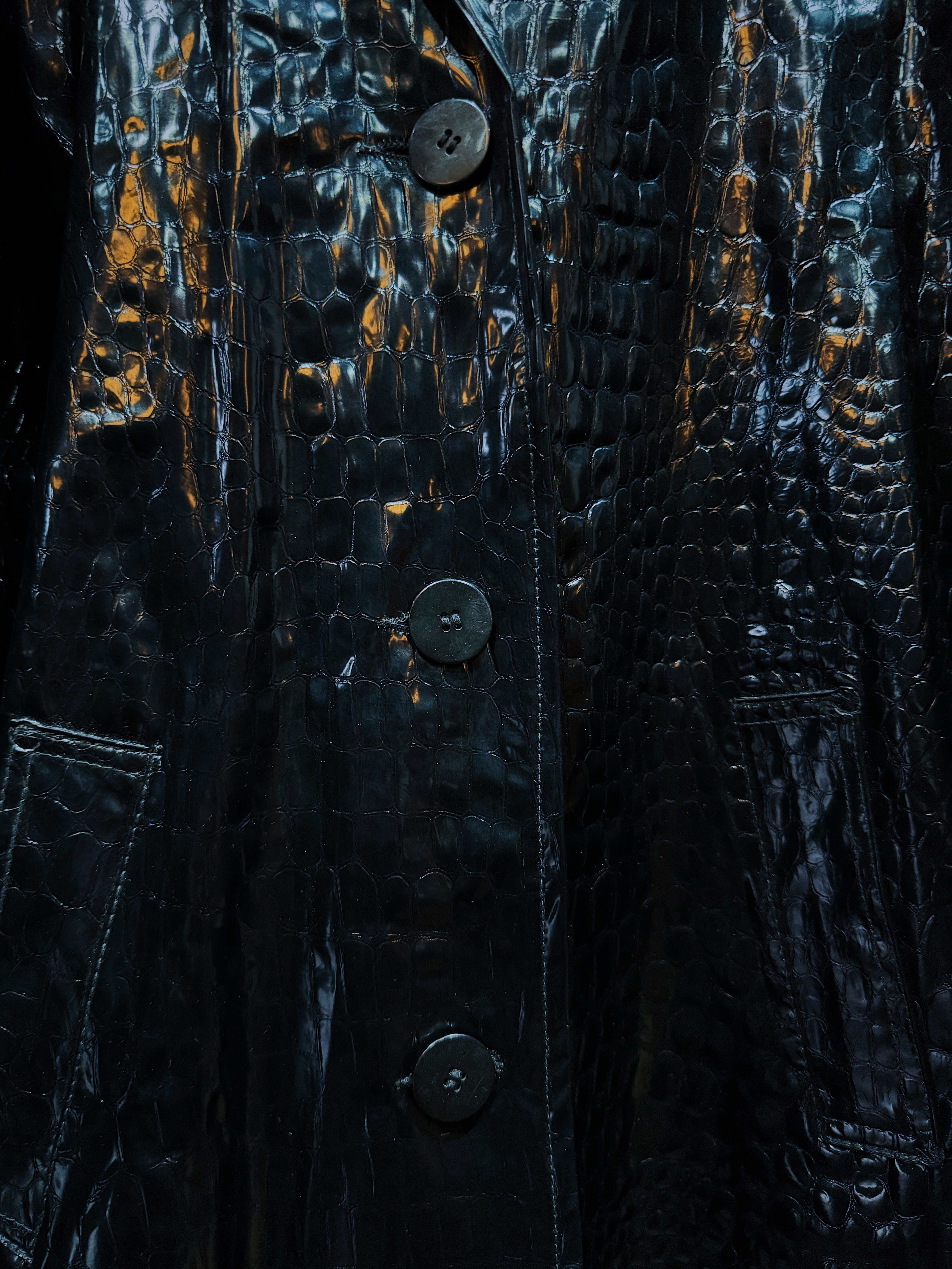 ビニールのような光沢感が特徴で、ハードな印象のクロコパターンを前面に押し出したインパクトある一着。