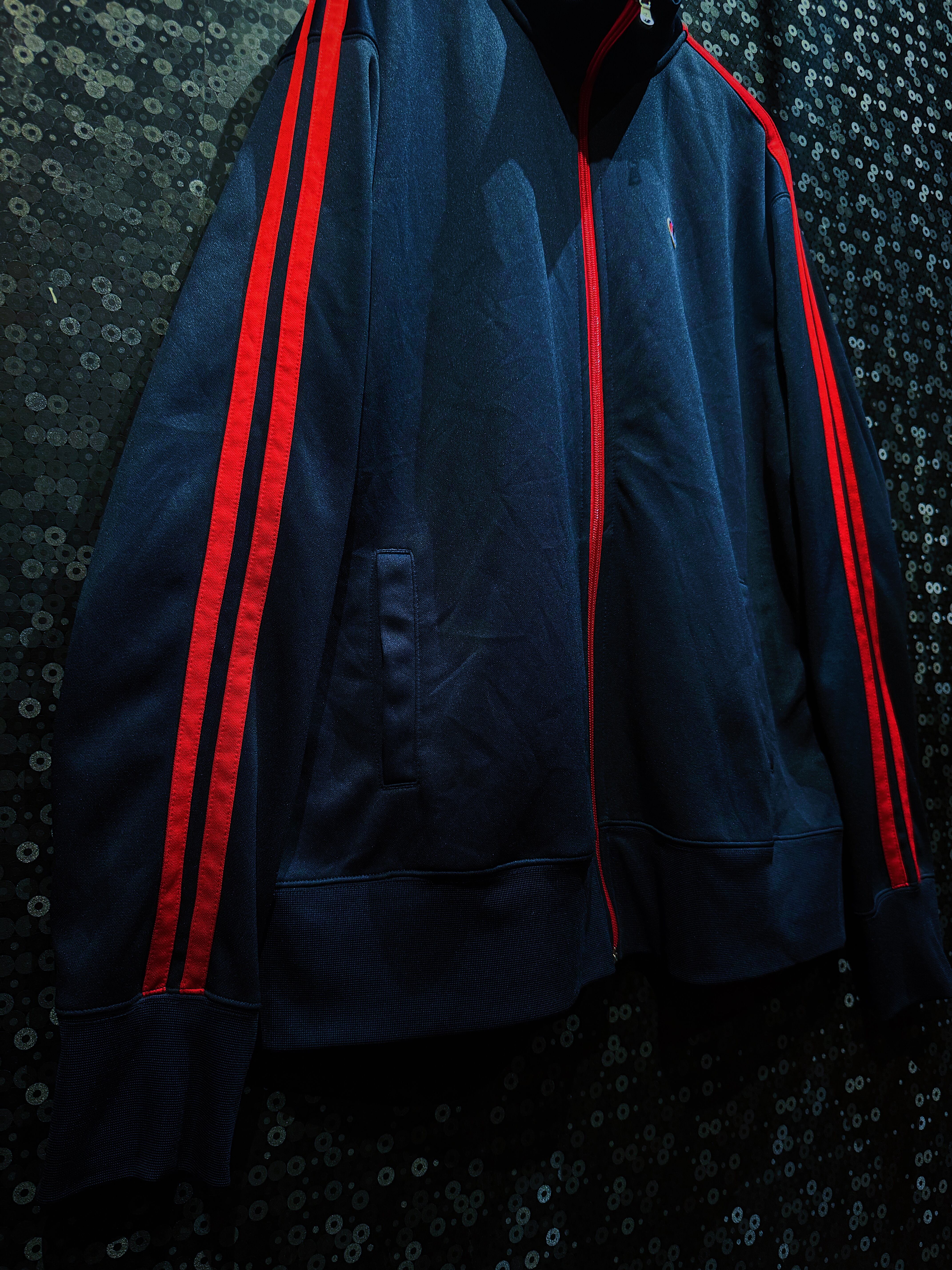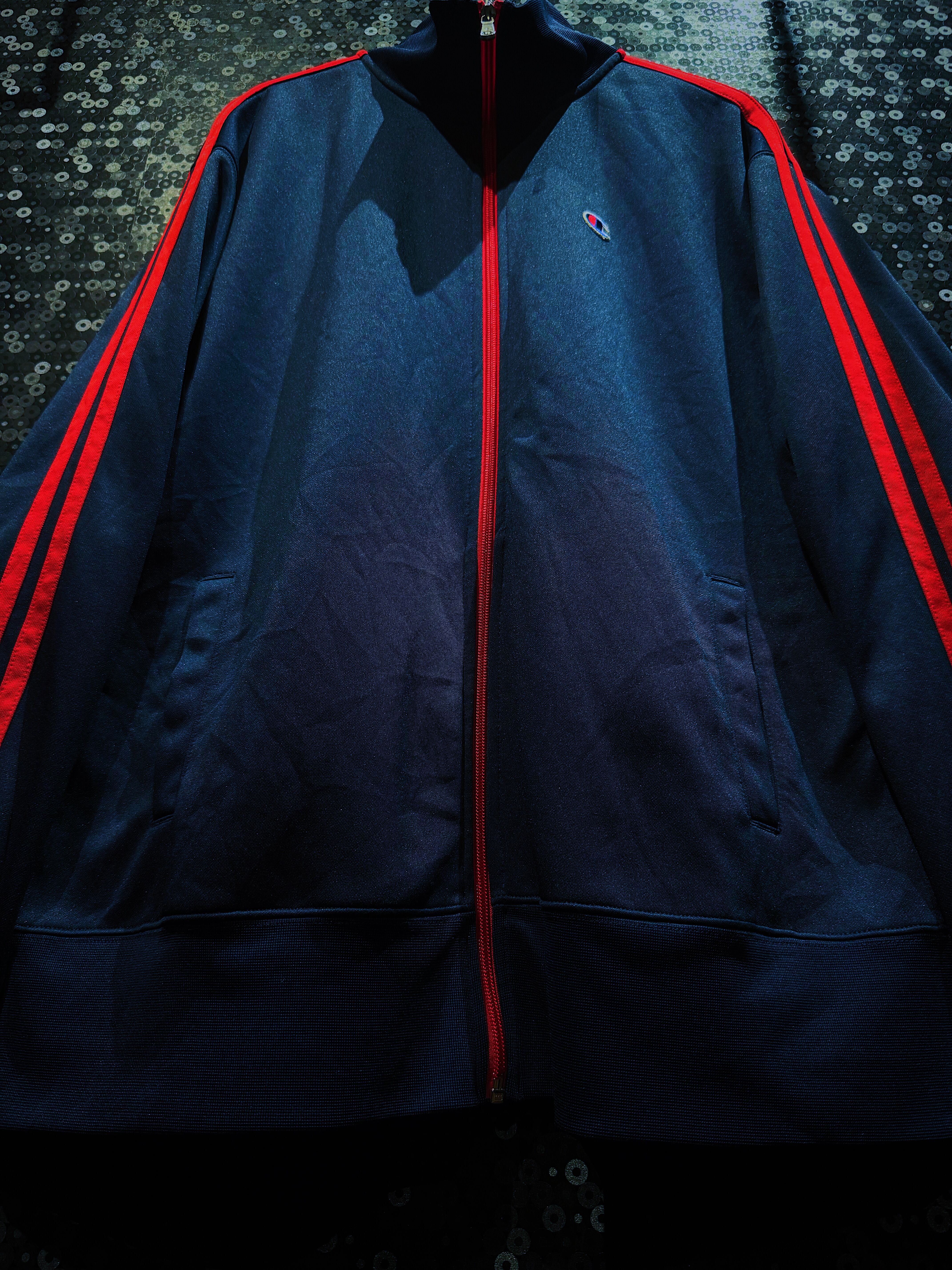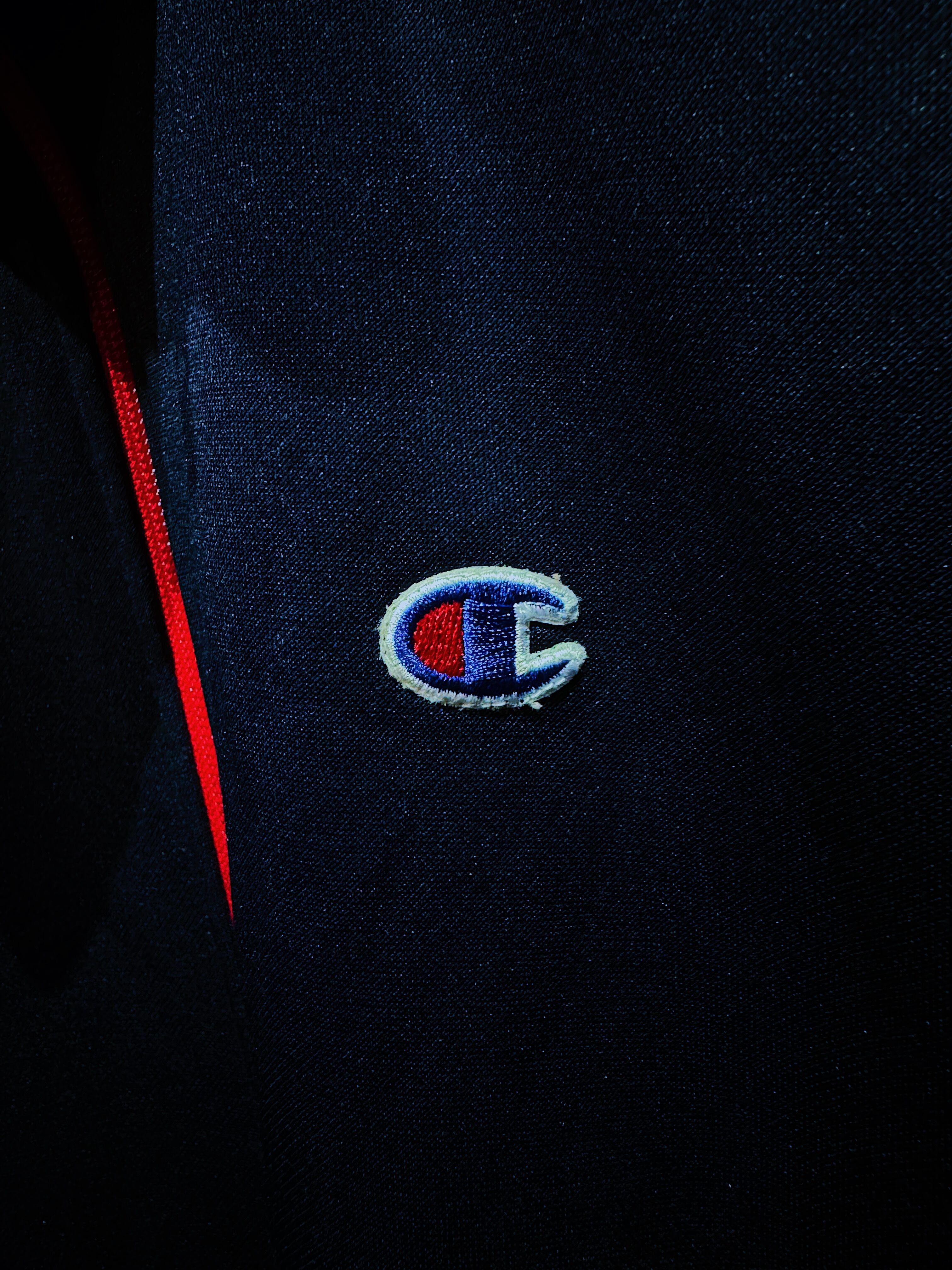 胸元にはおなじみのChampionロゴがワンポイントで刺繍され、ヴィンテージらしい風合いのあるネームタグも、時代を感じさせる魅力のひとつ。生地は厚手のポリ混ジャージ素材で、しっかりとした質感と程よいハリがあり、90sのトラックジャケットらしいタフさを備えています。