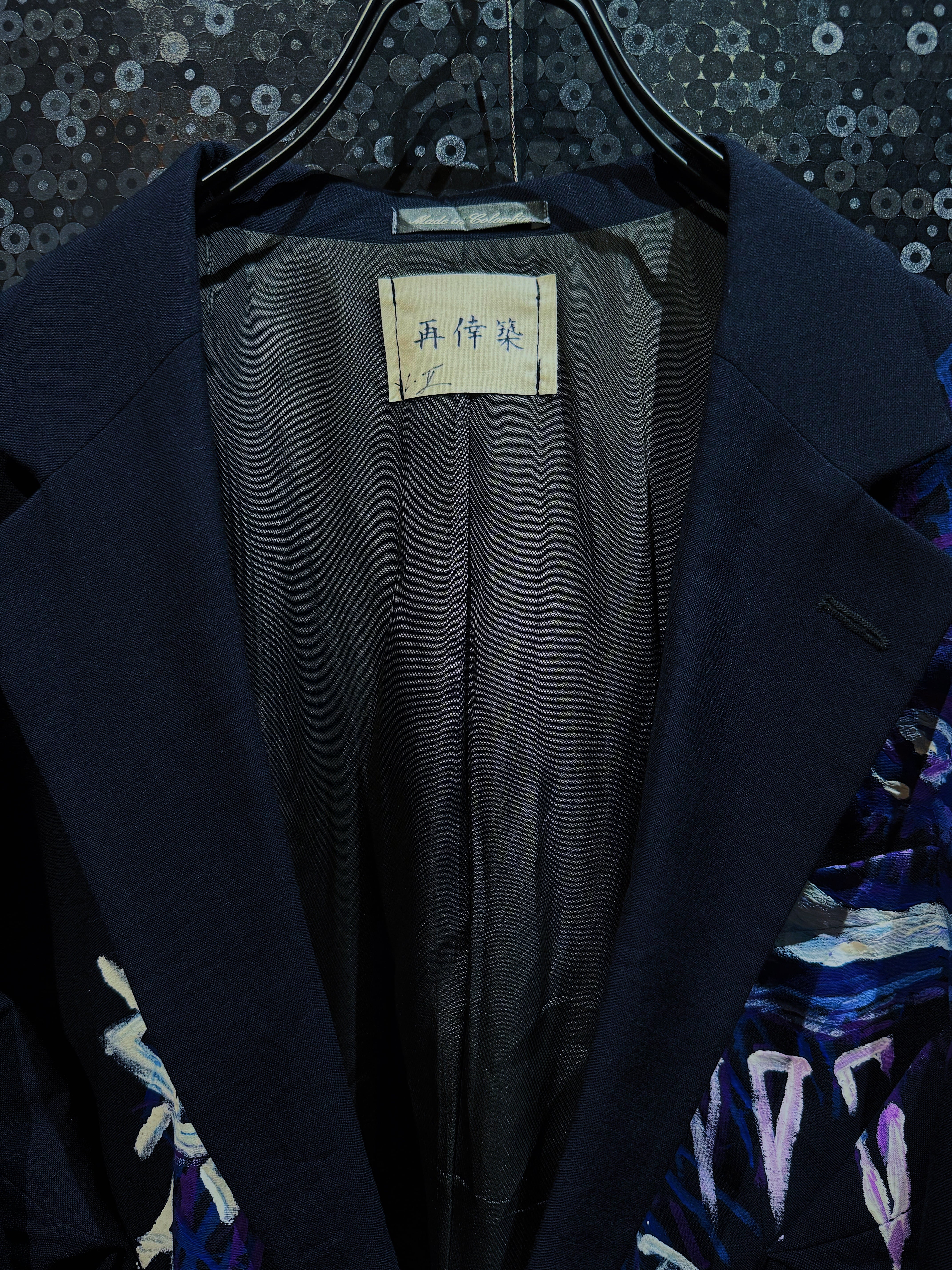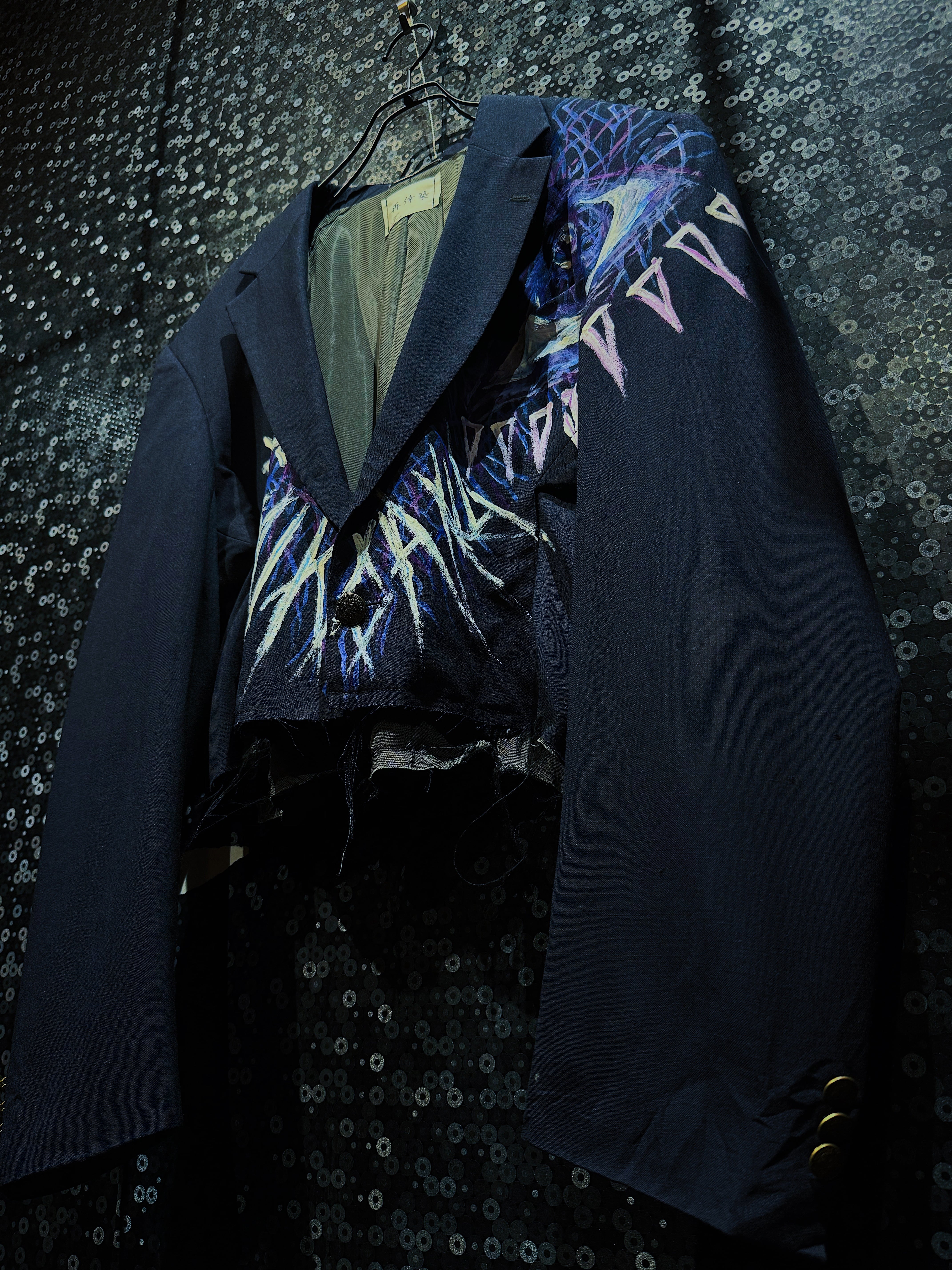 この「再倖築ハーフテーラード青ペイント」は、クラシックなテーラードジャケットを大胆に切り詰め、ハーフ丈に再構築した一点モノ。