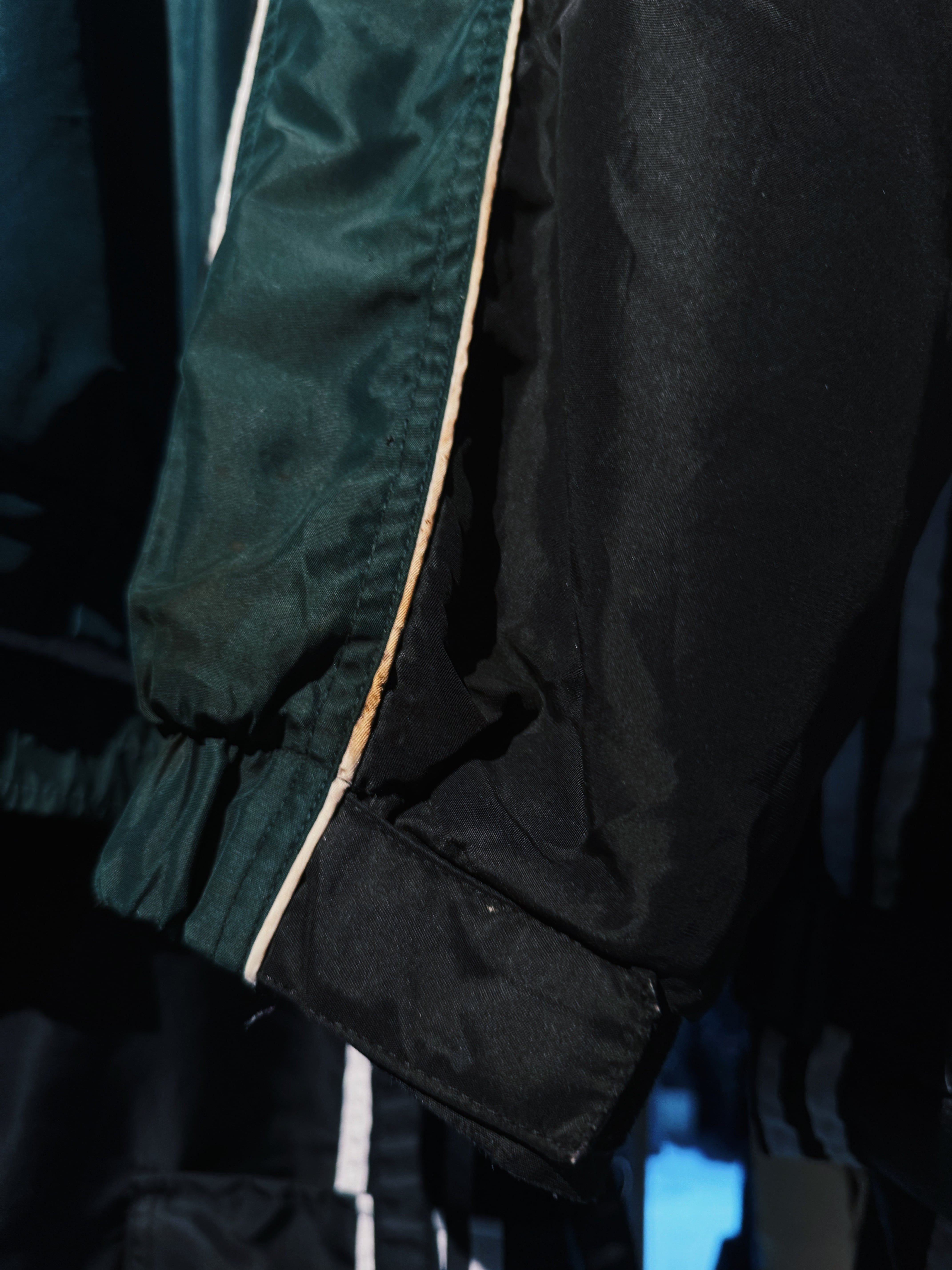 深いグリーンとブラックが不規則的なボーダーデザインのようにスイッチングされたナイロントラックジャケット。胸元には"NIKE"のシグネチャーであるスウッシュがグリーンで刺繍されアクセントに。
