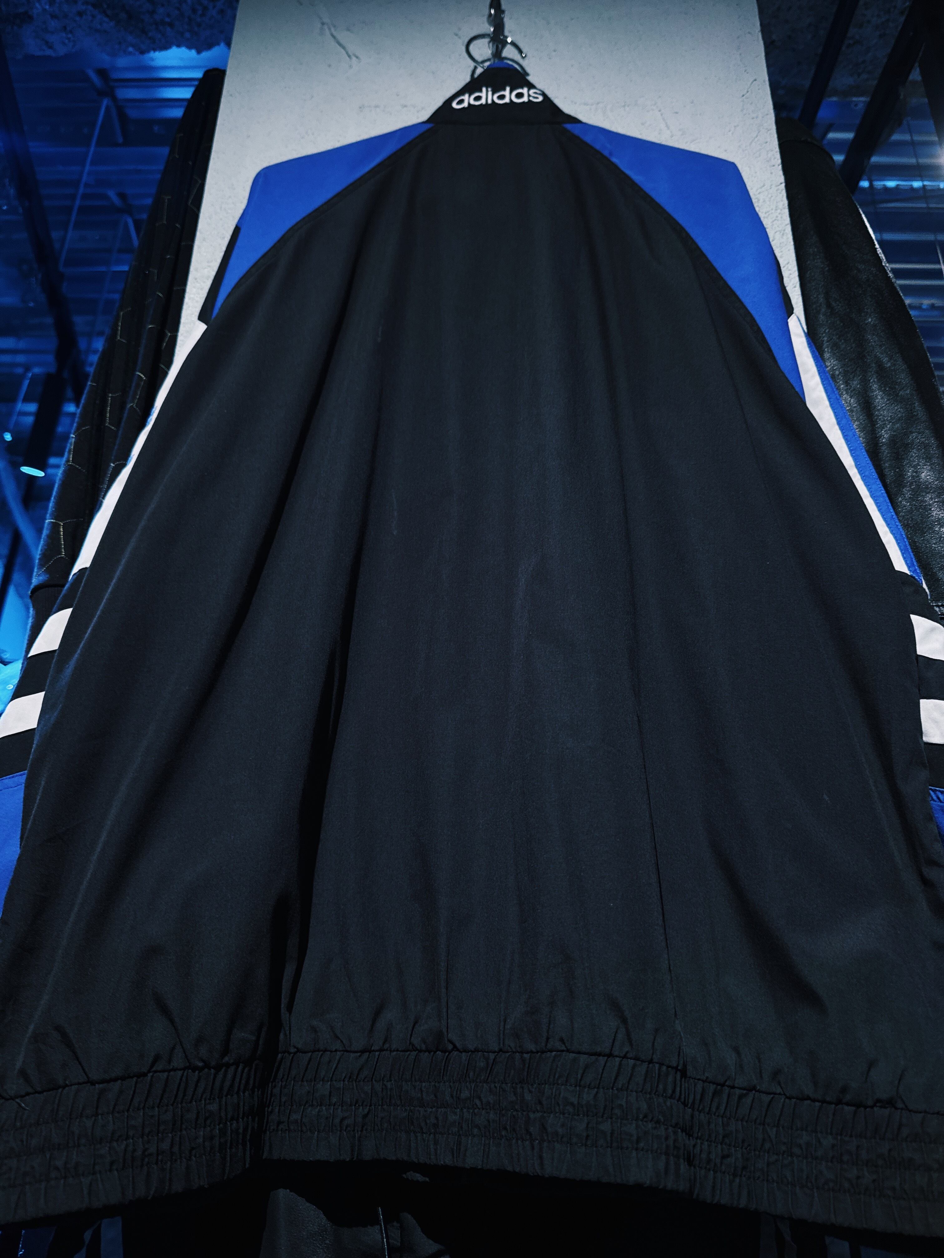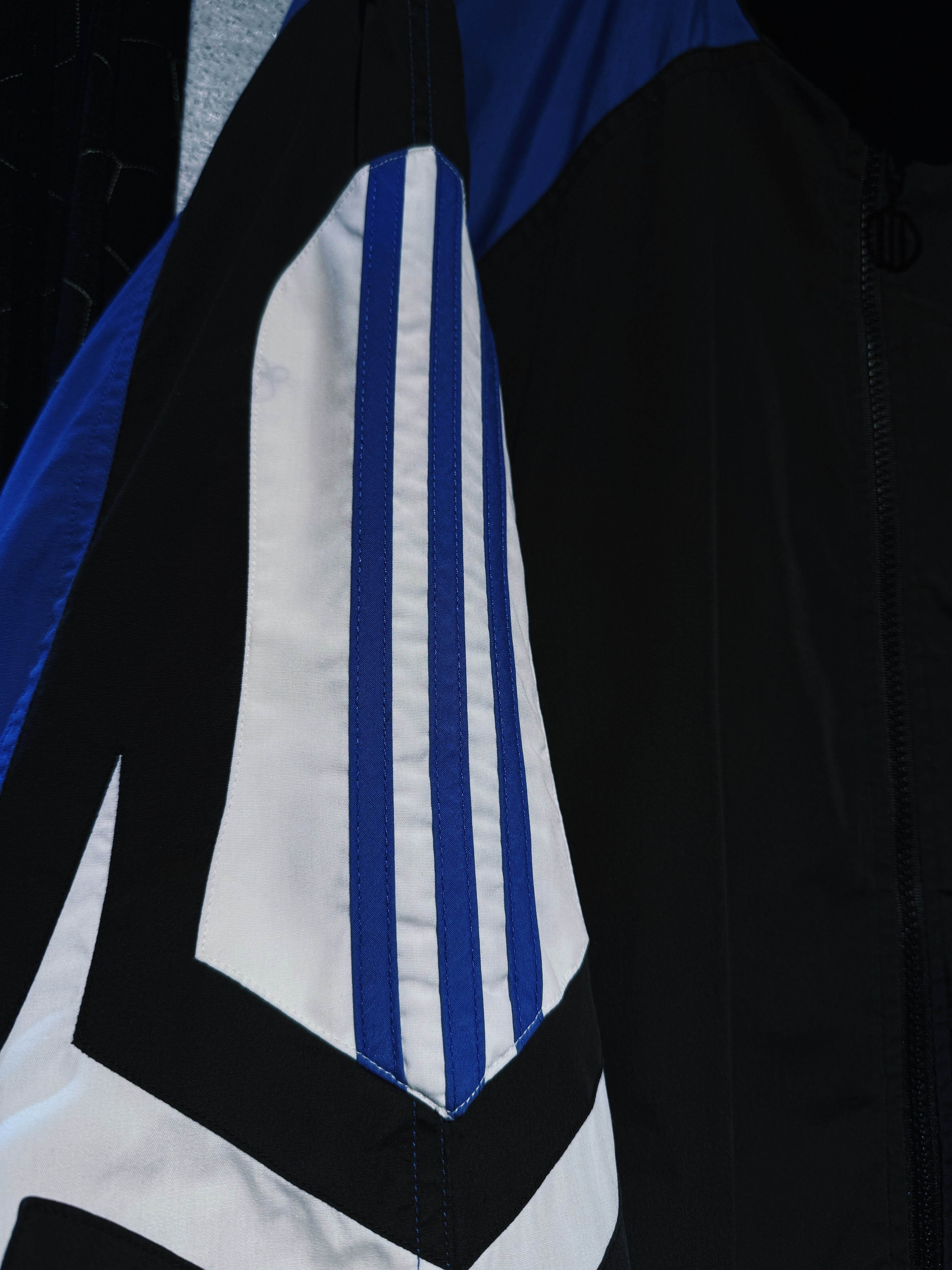 ブルー×ホワイト×ブラックのスイッチングに目を奪われるナイロントラックジャケット。3ストライプスを規則的に施しており、このユーロ規格らしい洗練されたデザインは高級感があって良いですね。