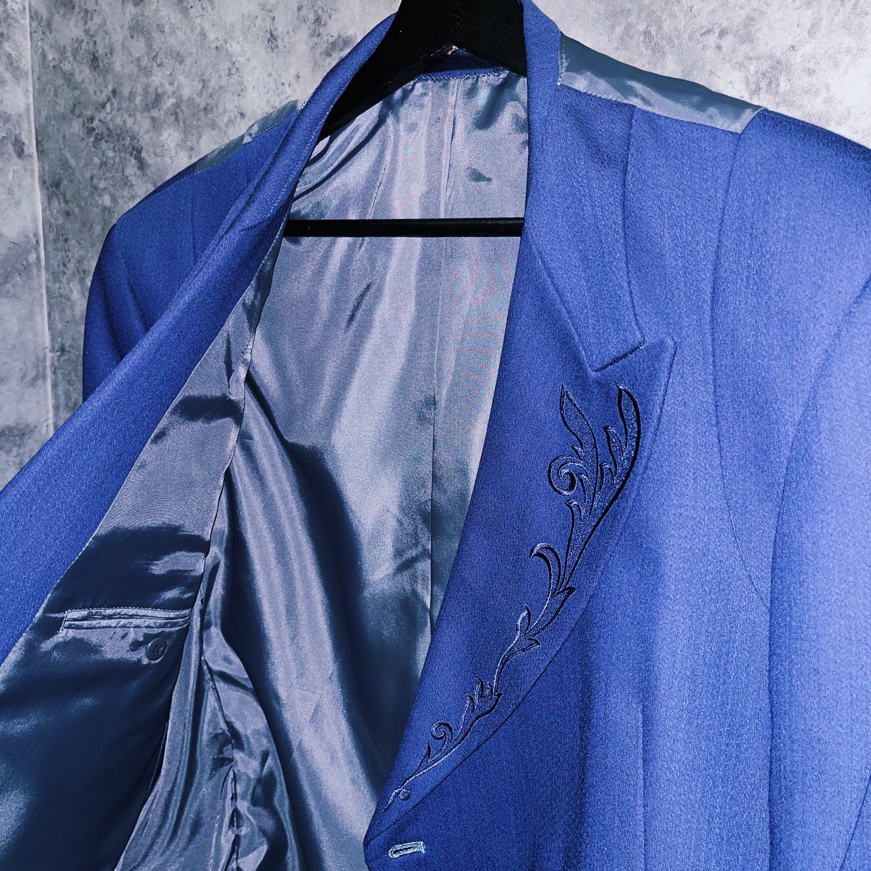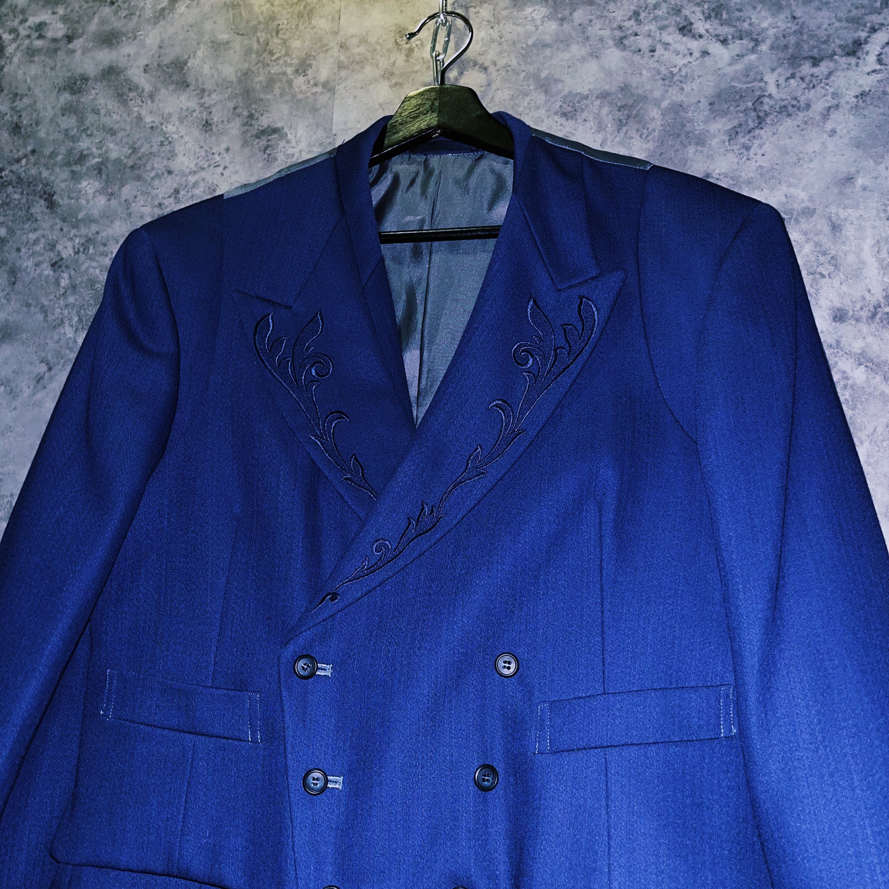 90‘sヴィンテージスリーピースラピスラズリカラーエンブロイダリークアトロボタンダブルブレストセットアップ