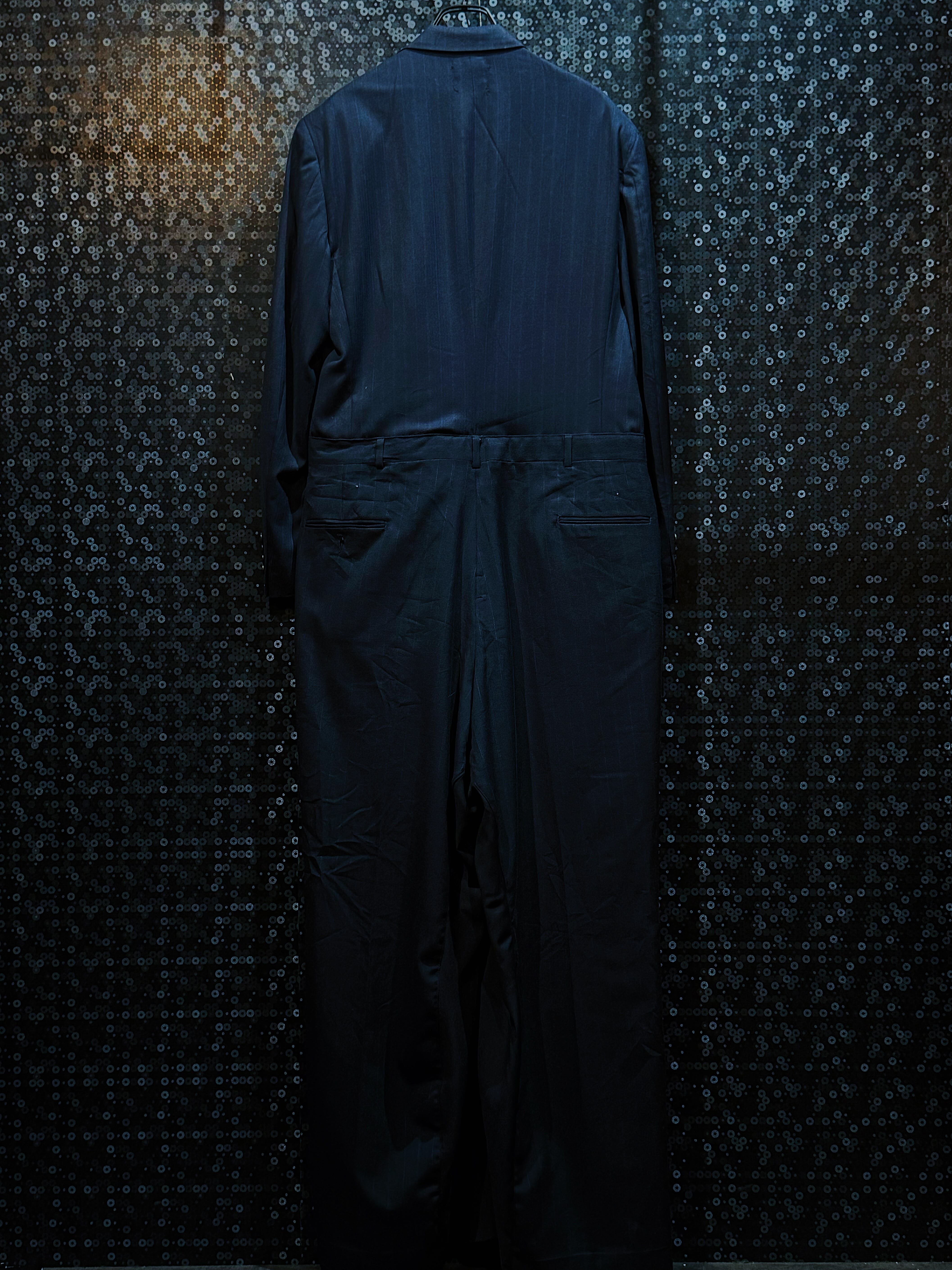 テーラードジャケットとパンツが一体となった、再倖築によるネイビーのジャンプスーツスタイルの一着。
