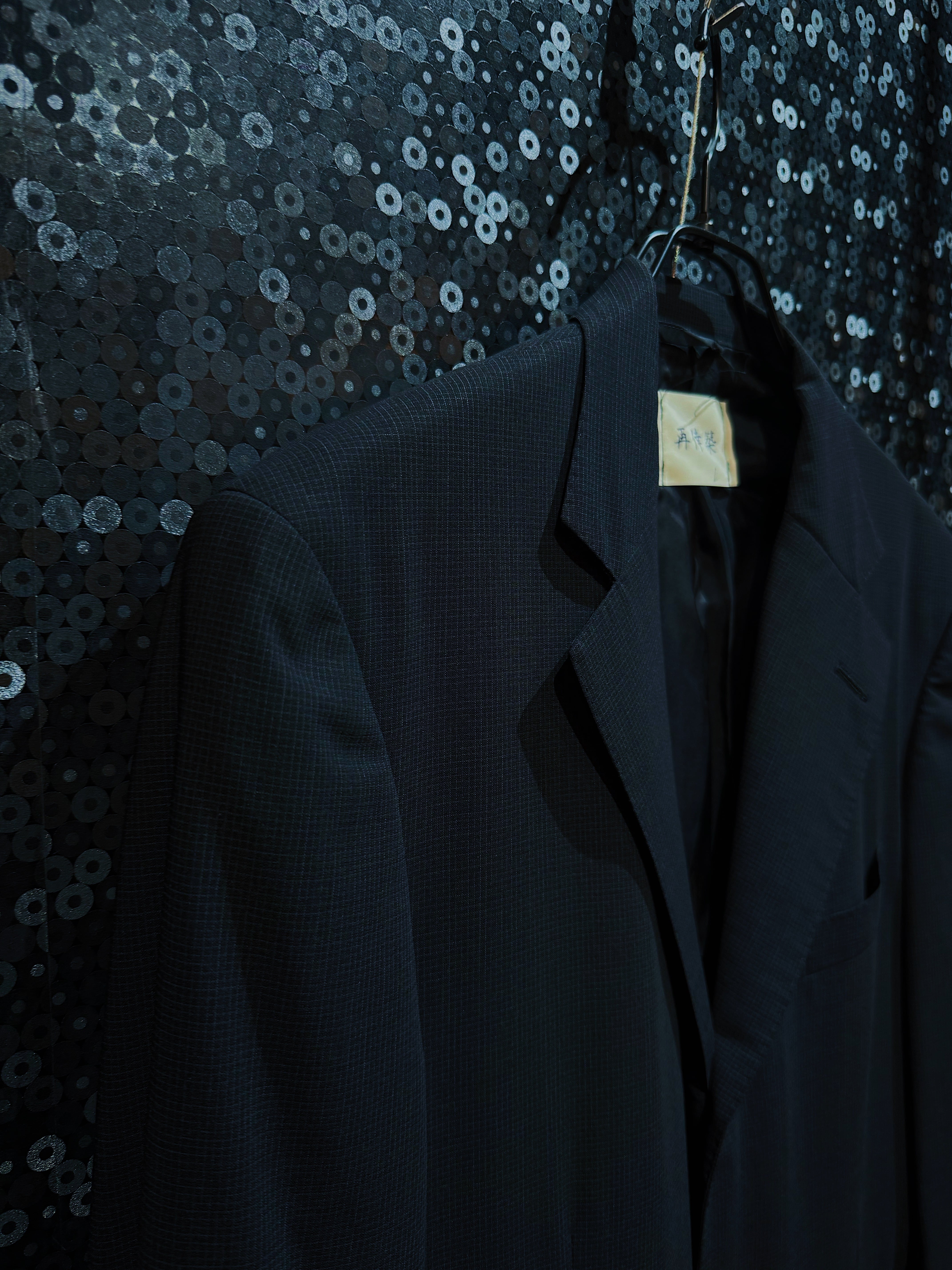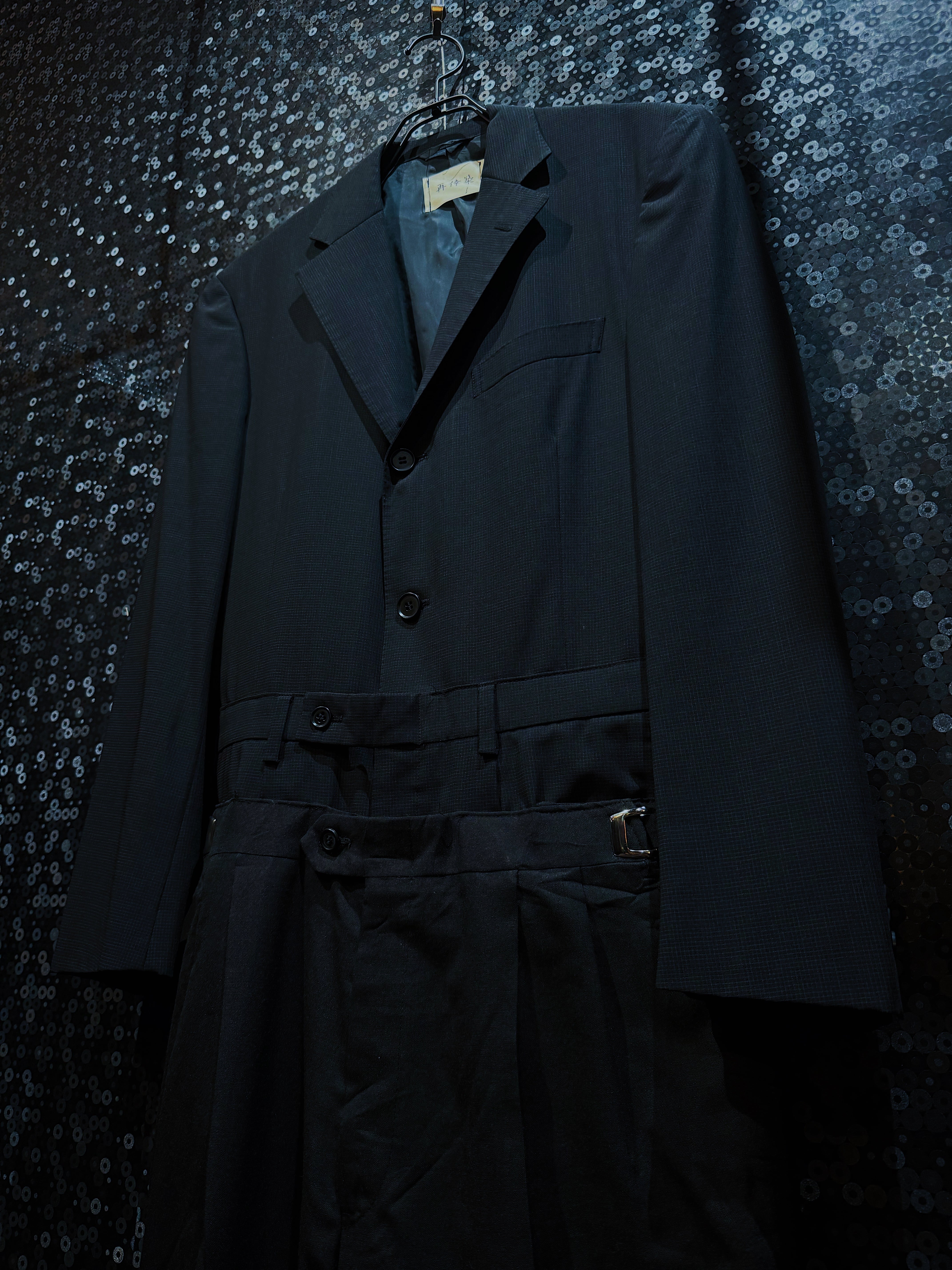 「再倖築」によるジャンプスーツ型の一点物カスタムアイテムで、テーラードジャケットとスラックスを上下で縫い繋ぎ、つなぎとして再構築された作品です。