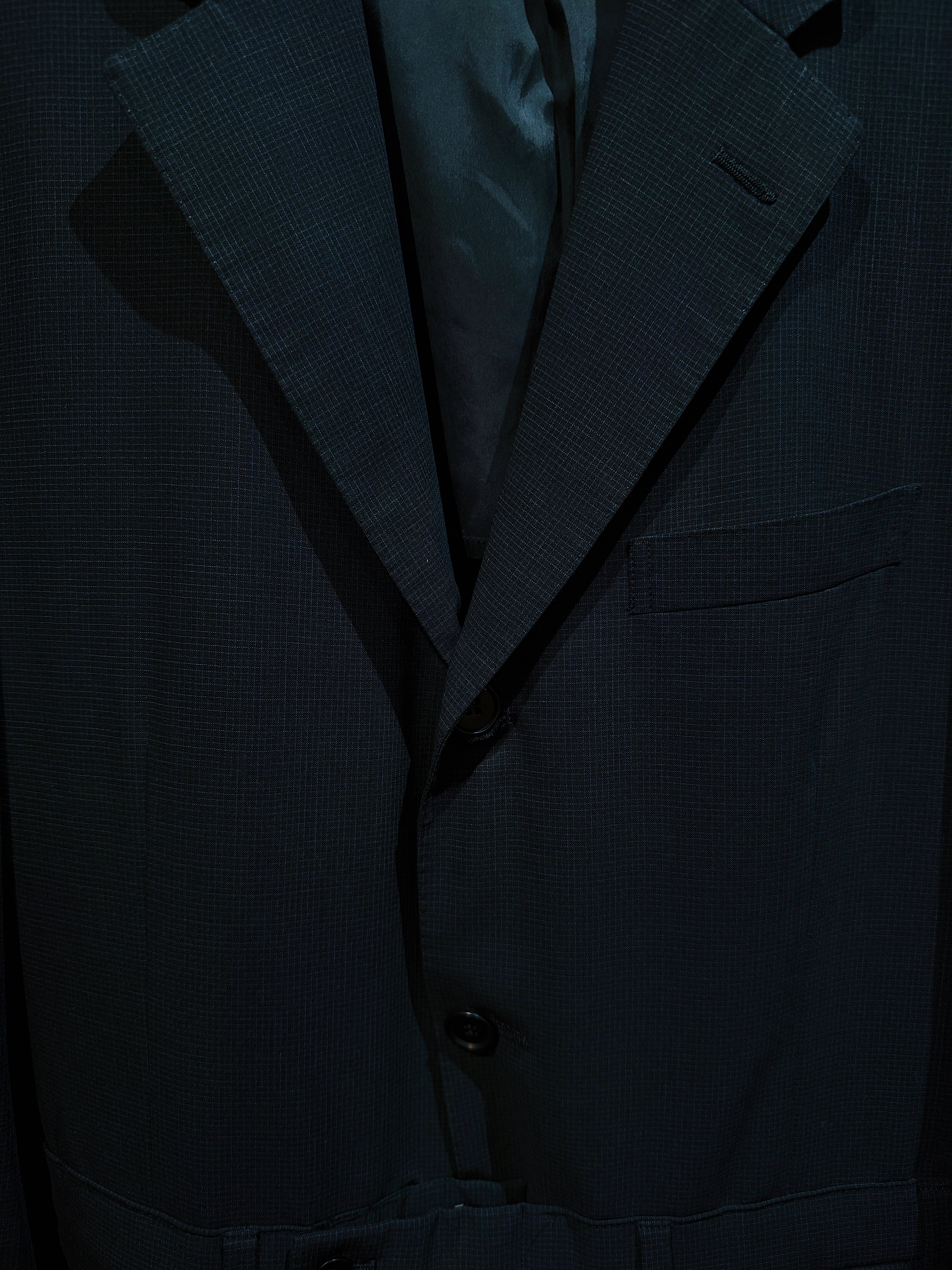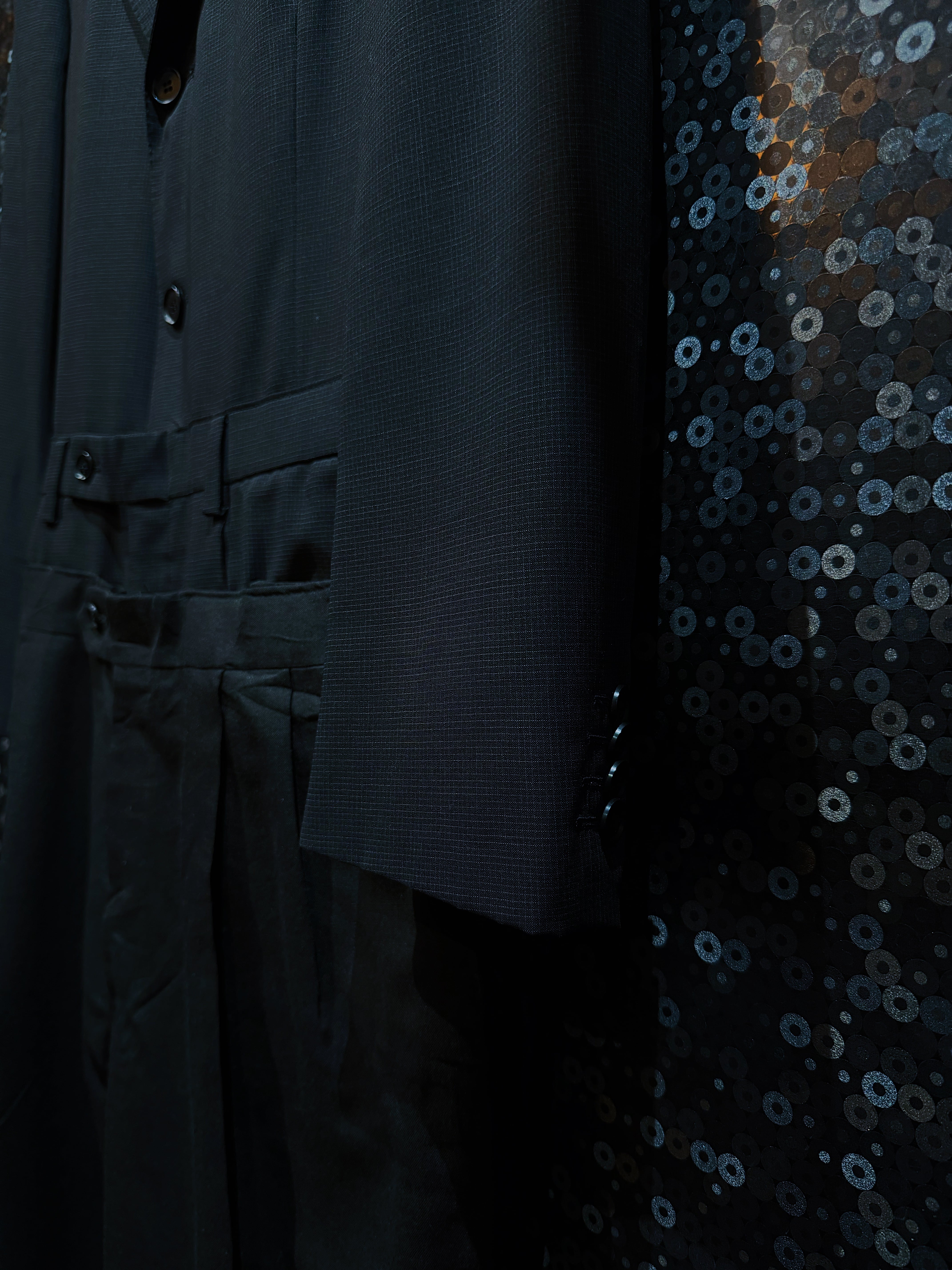 元々はフォーマルなメンズセットアップであったものを解体し、再びひとつの衣服として「ジャンプスーツ化」することで、ユニフォーム的な重厚さとドレッシーな緊張感を両立しています。