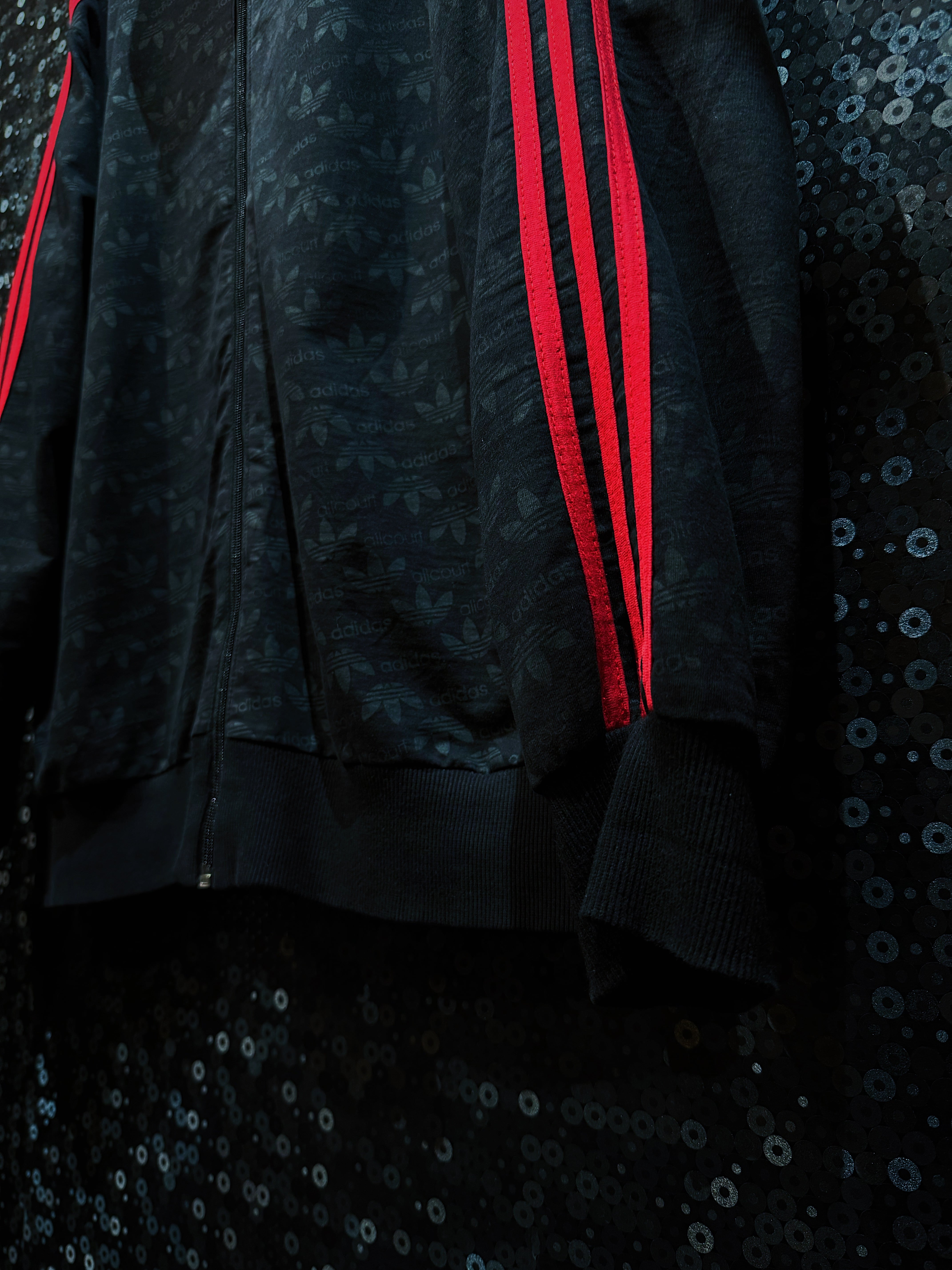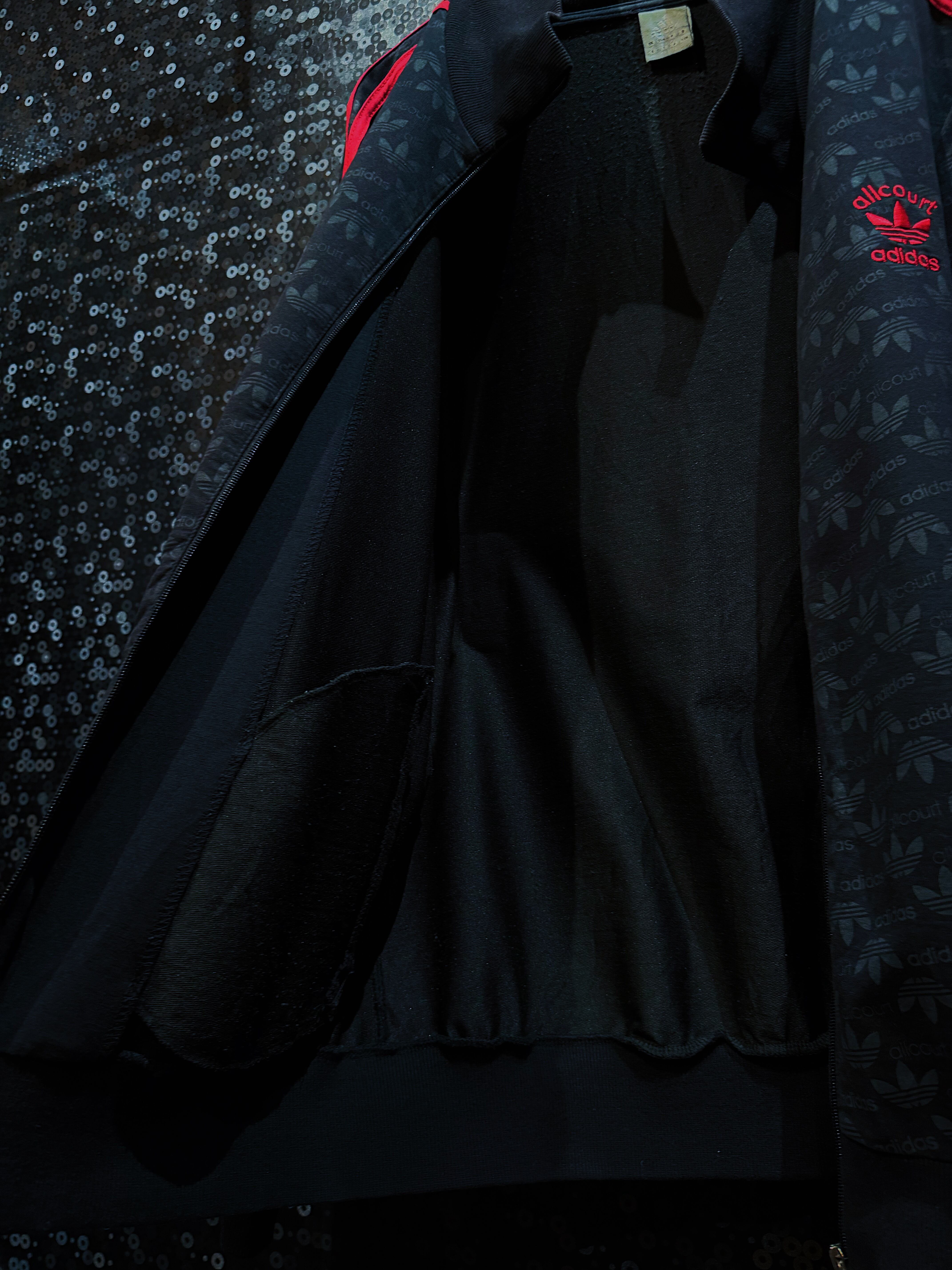 こちらはadidasの「allcourt」シリーズより、希少な総柄トラックジャケットでございます。ブラックのボディに浮かび上がるようにあしらわれたトレフォイルロゴと”allcourt”の文字が、まるでジャカード織りのように全体に広がり、唯一無二の存在感を放ちます。