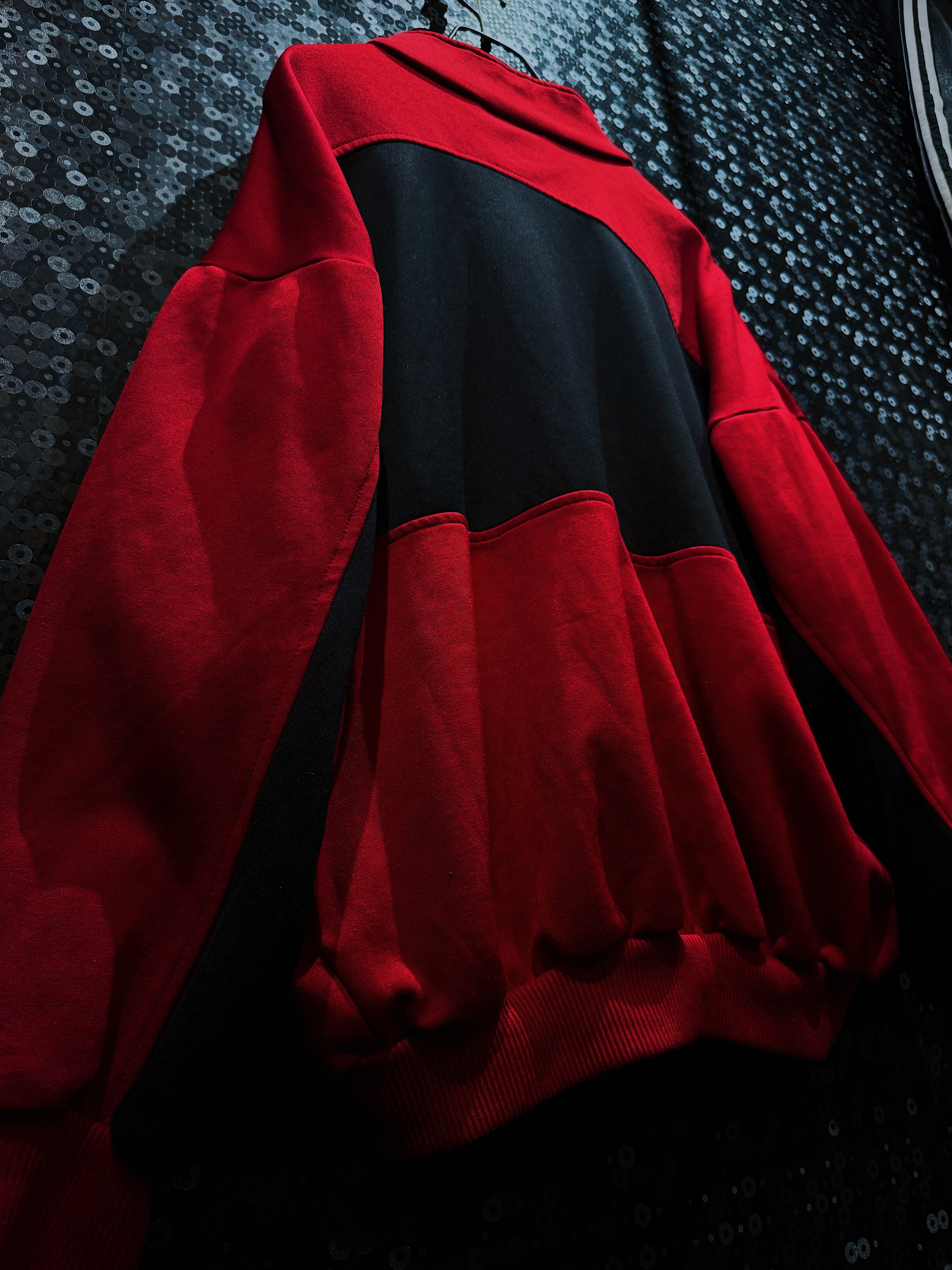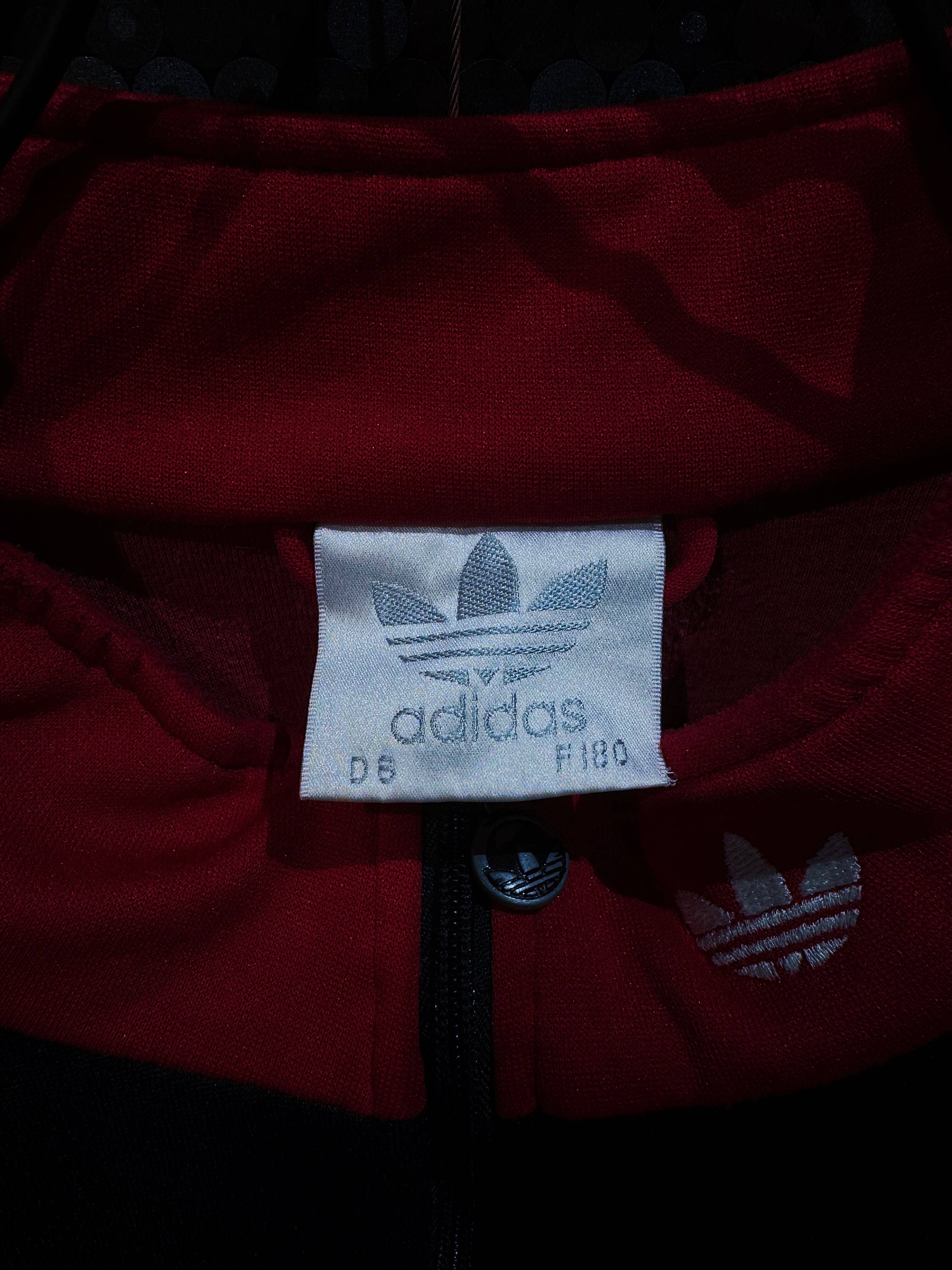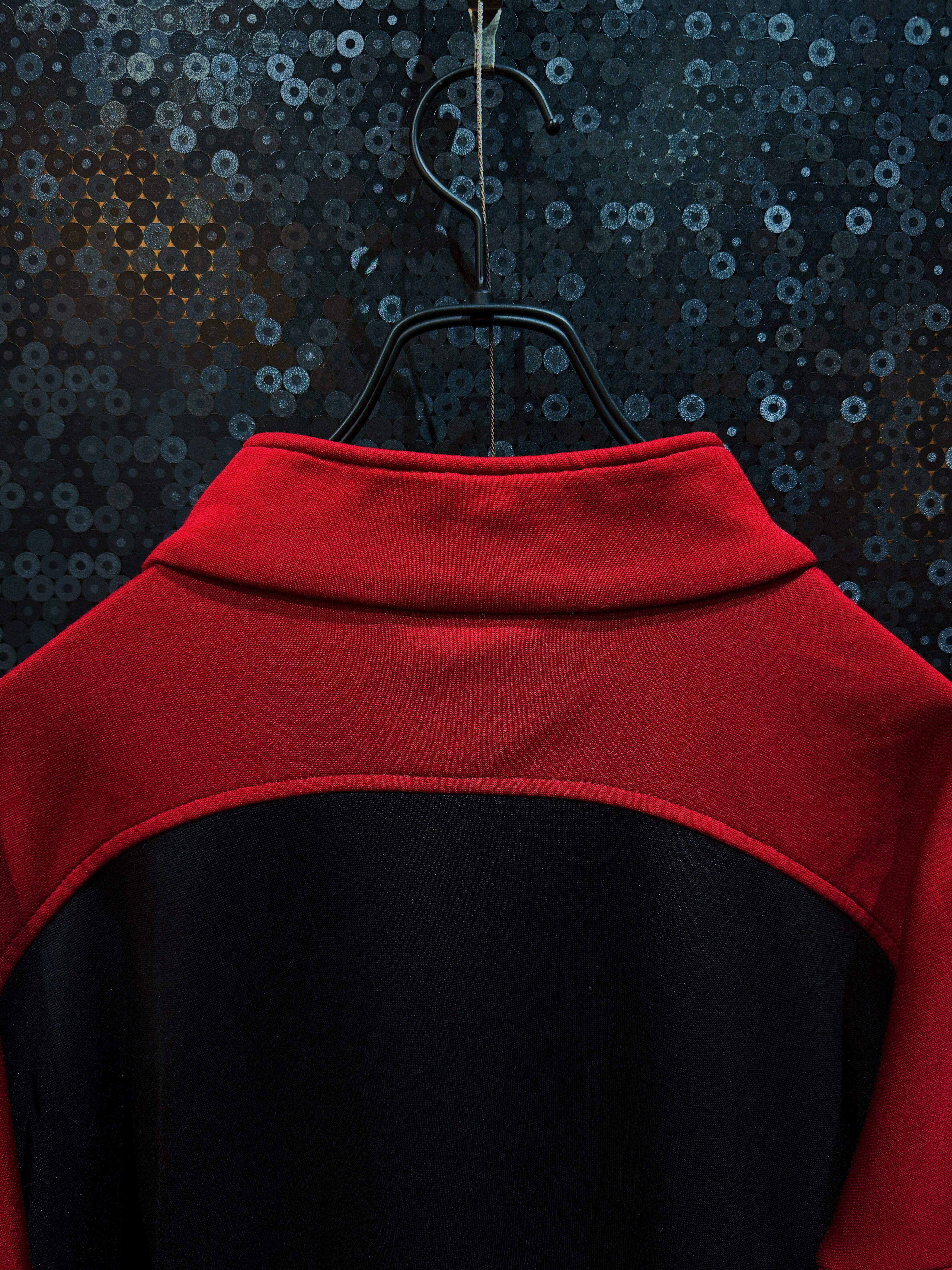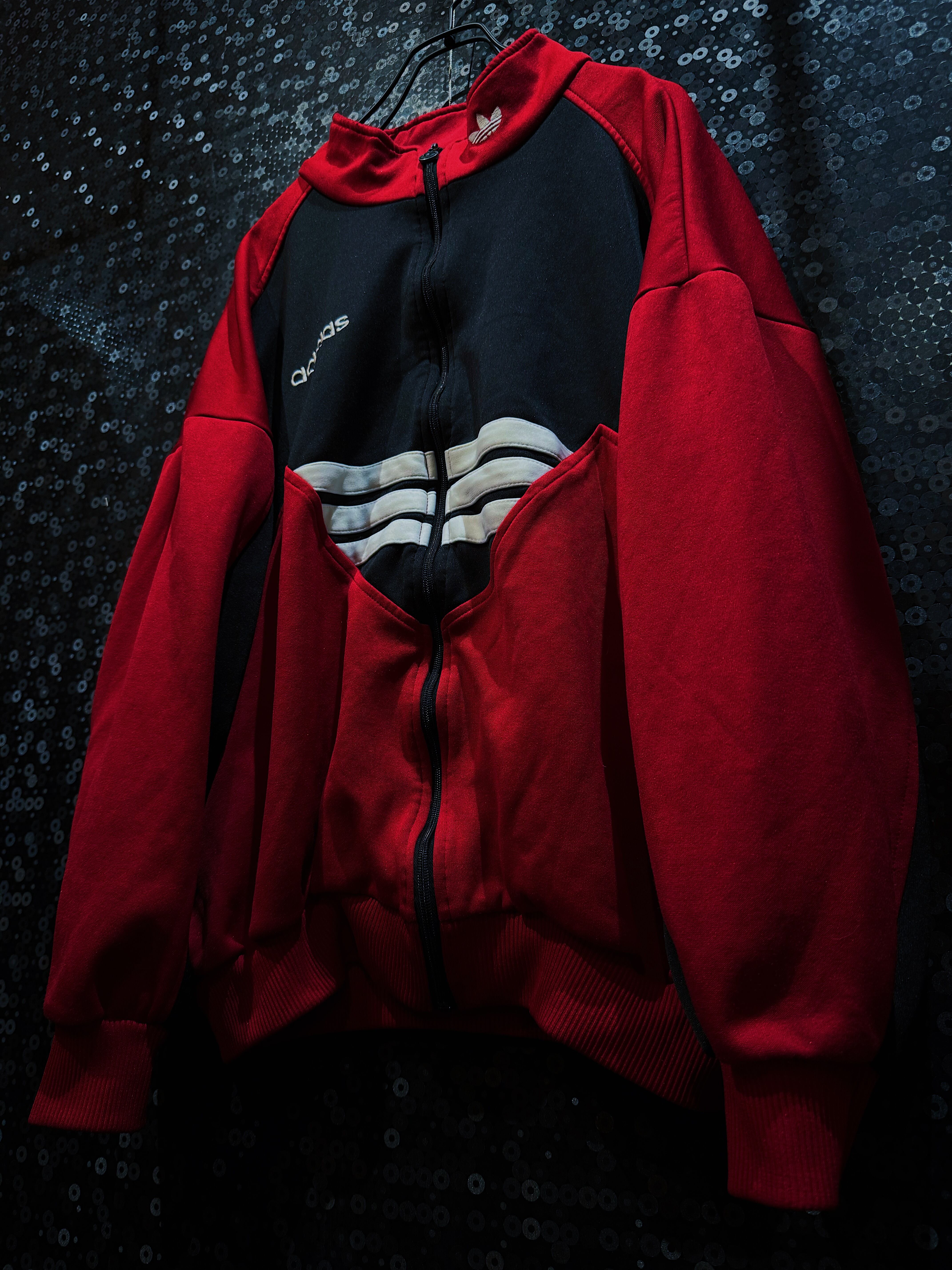 adidasのヴィンテージ・トラックジャケットの中でも特に存在感のある一着です。レッド×ブラックの切り替えに、中央を横断するホワイトのスリーストライプ。