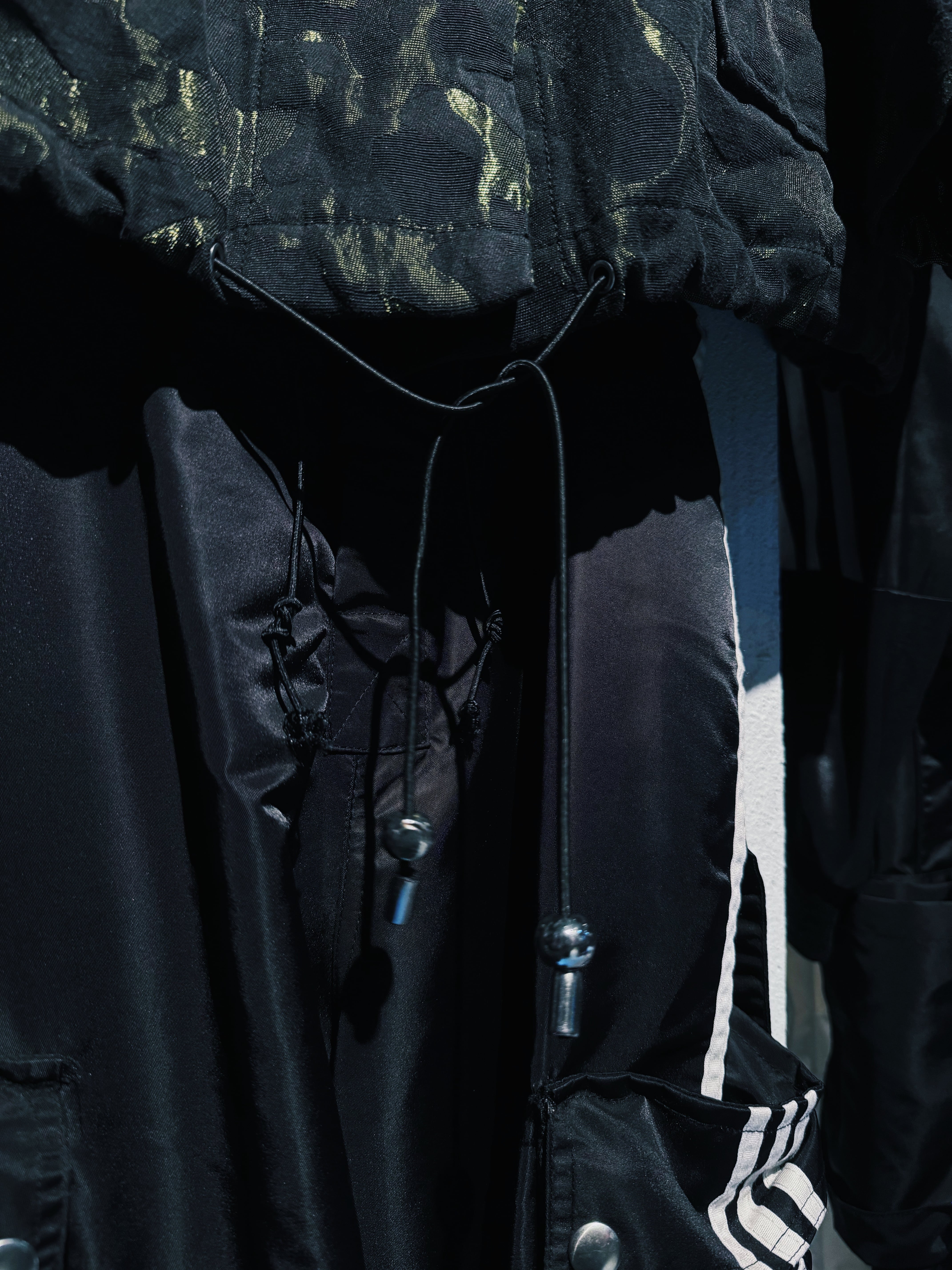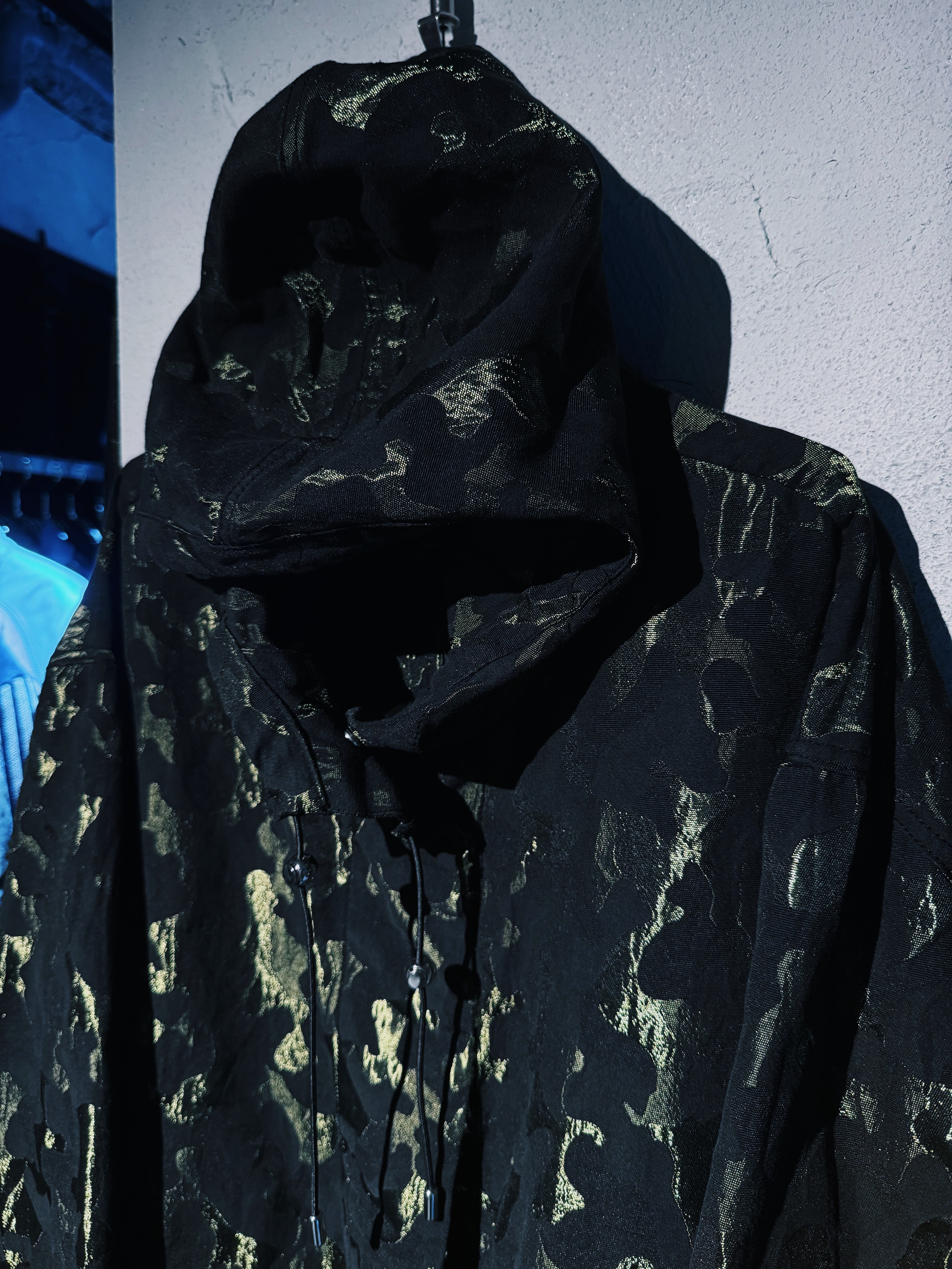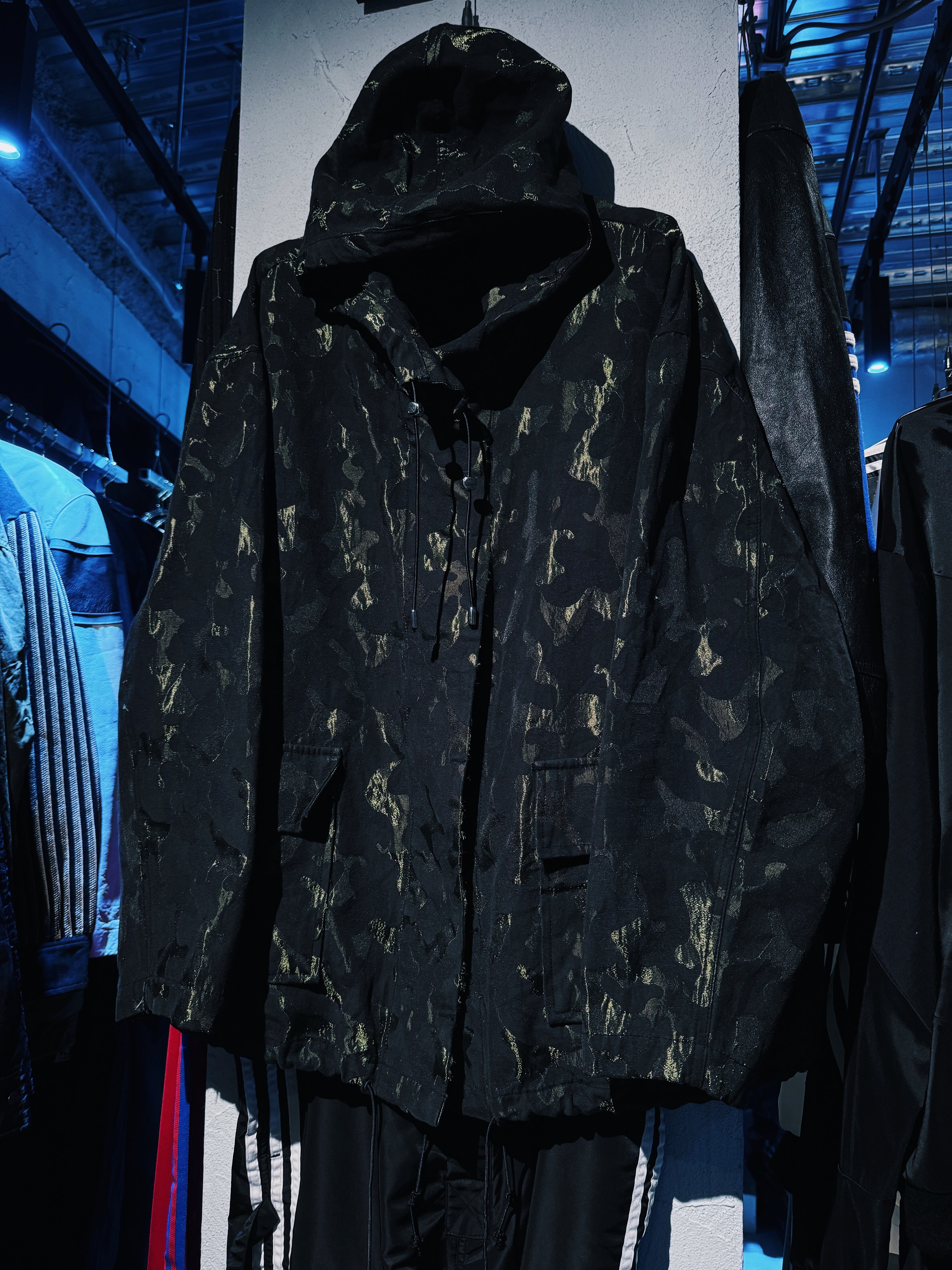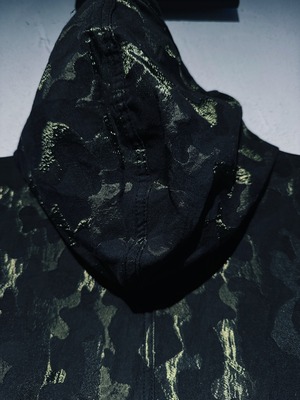 カモフラージュデザインにフード付き、大きくポケットが施されていたりとミリタリー感満載な逸品。