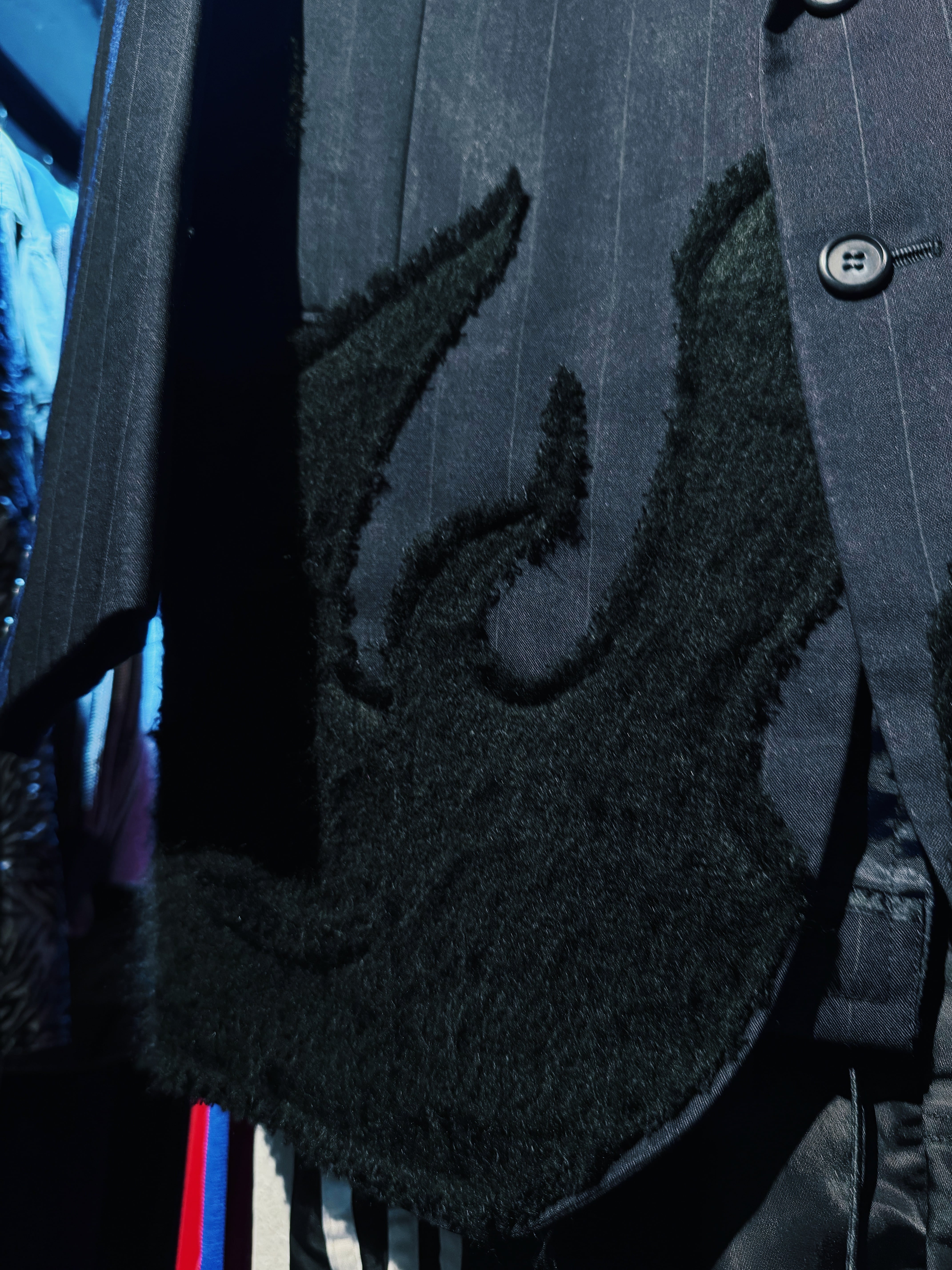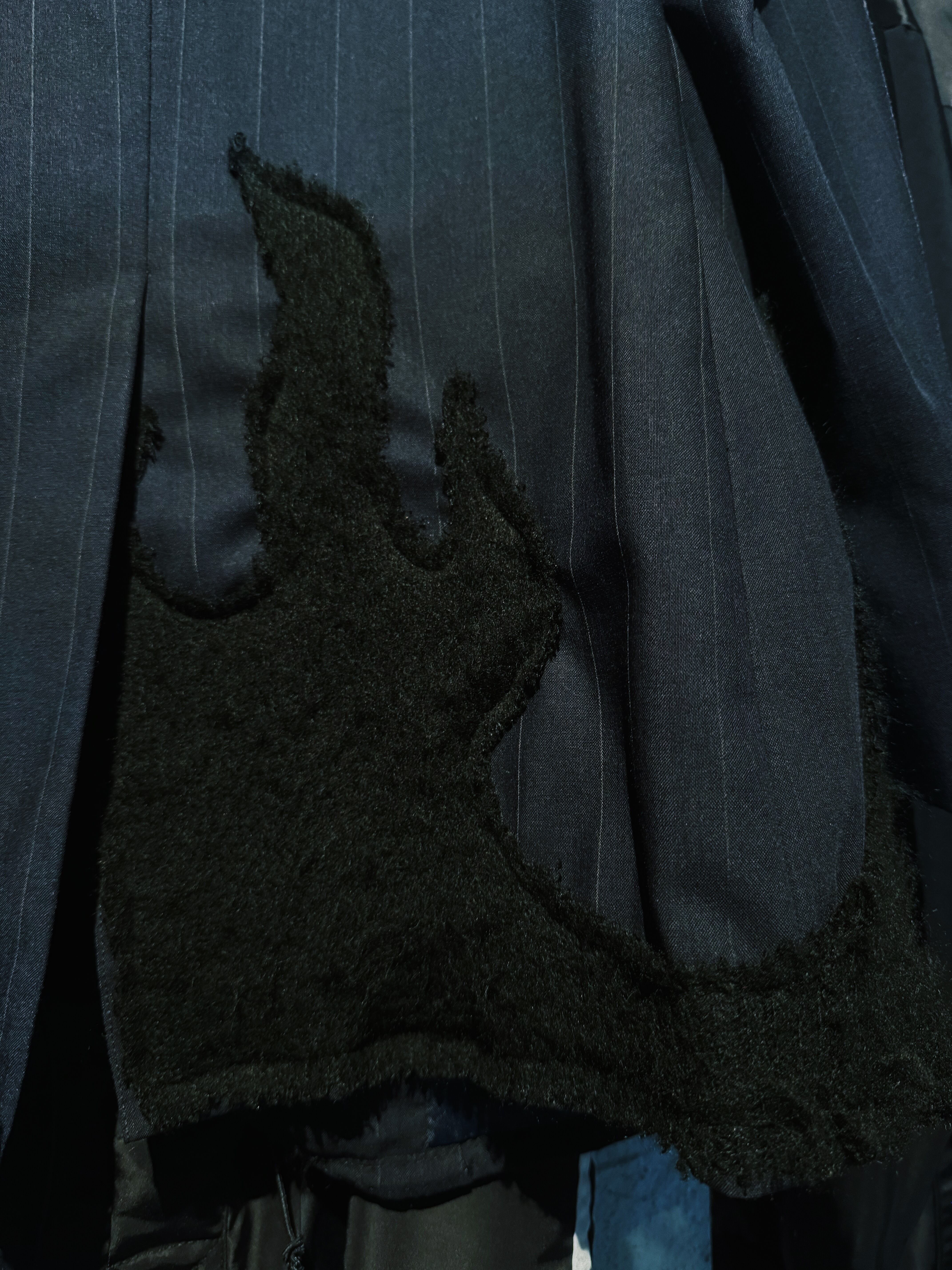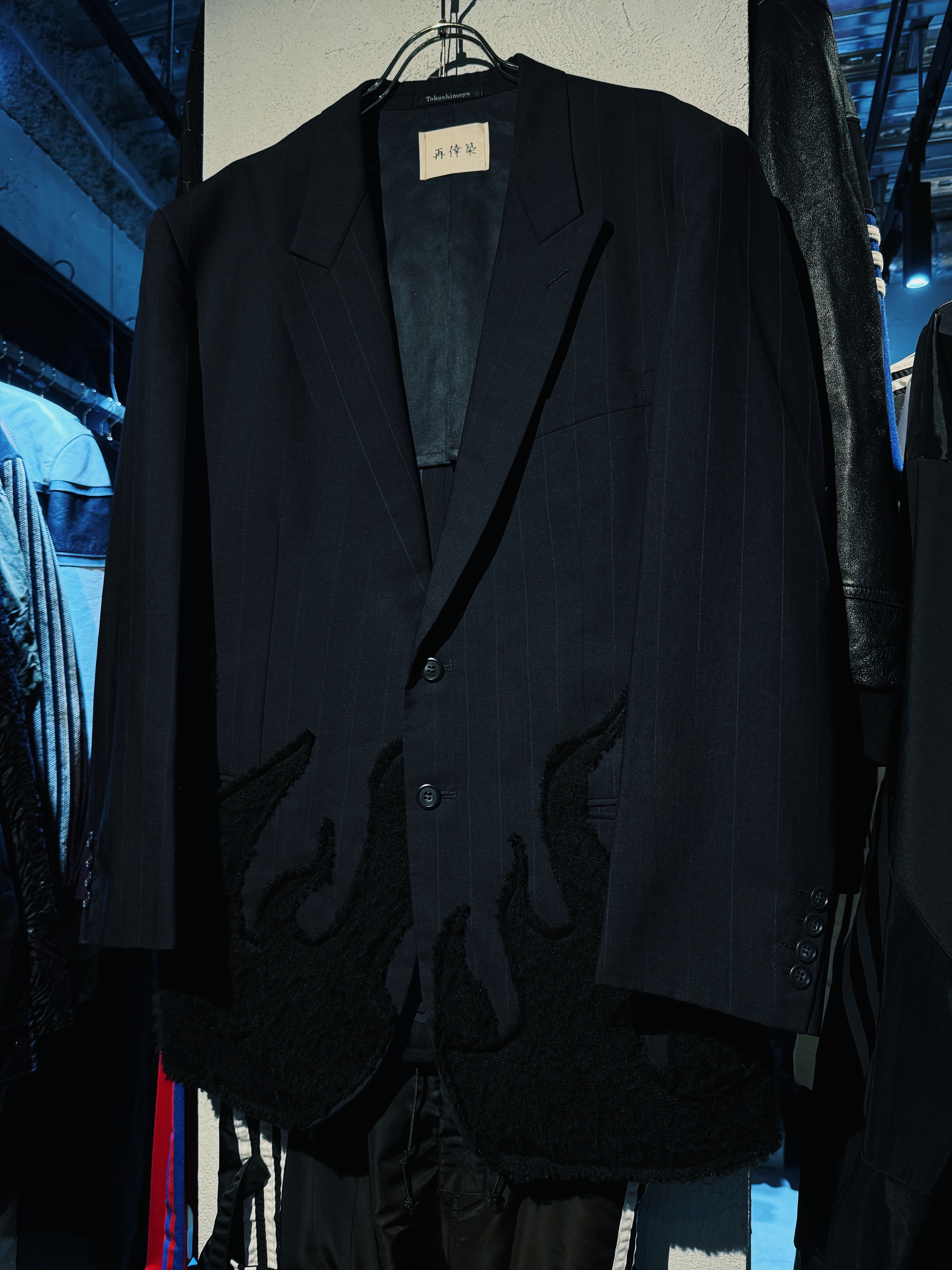 クラシックなストライプデザインのテーラードジャケットに異素材で組み込まれたファイヤーパターンが素晴らしい逸品。