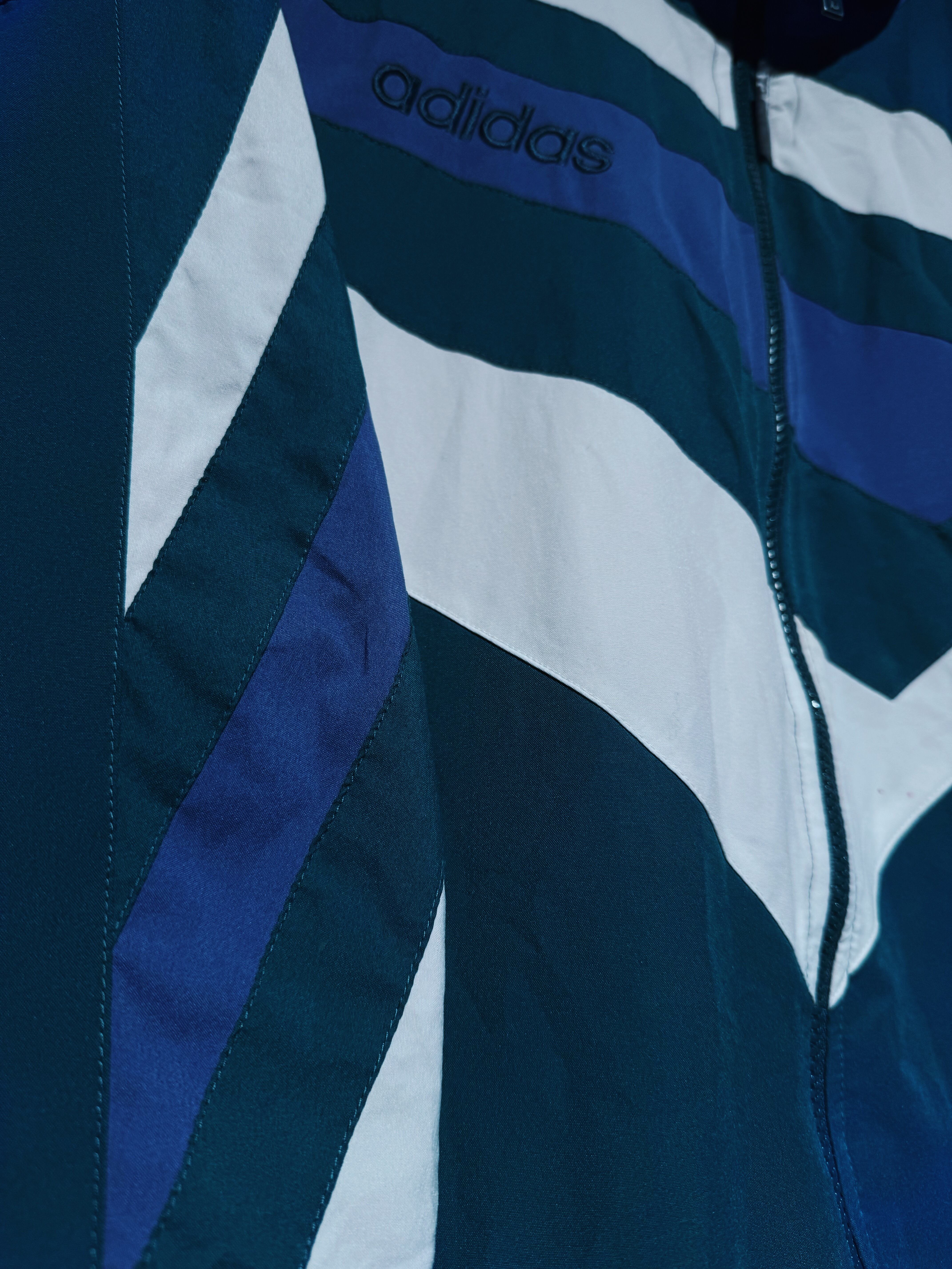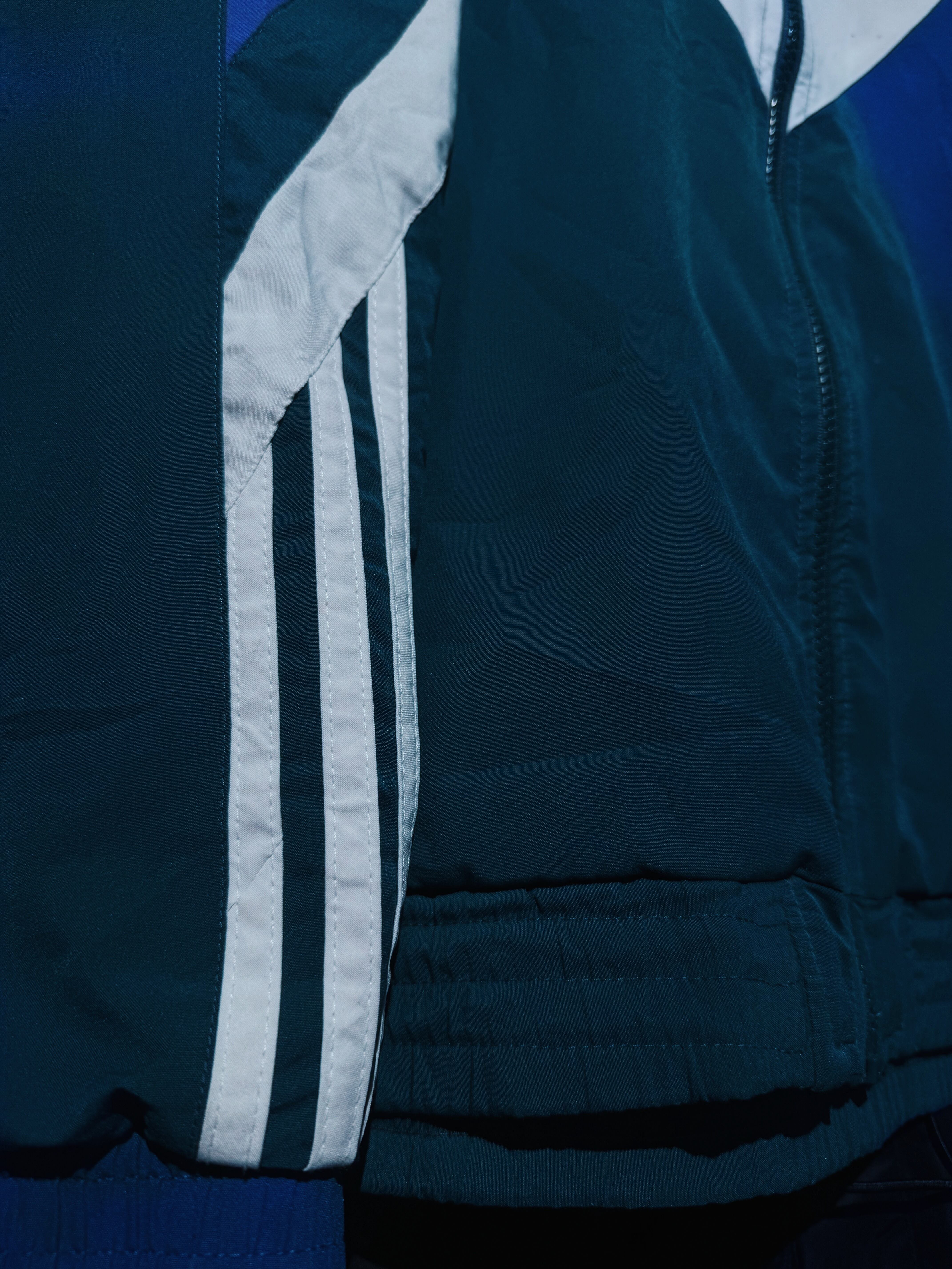 マルチカラーでブルーカラーがベースでホワイトカラースウィッチングが施されている多色なトラックジャケット。