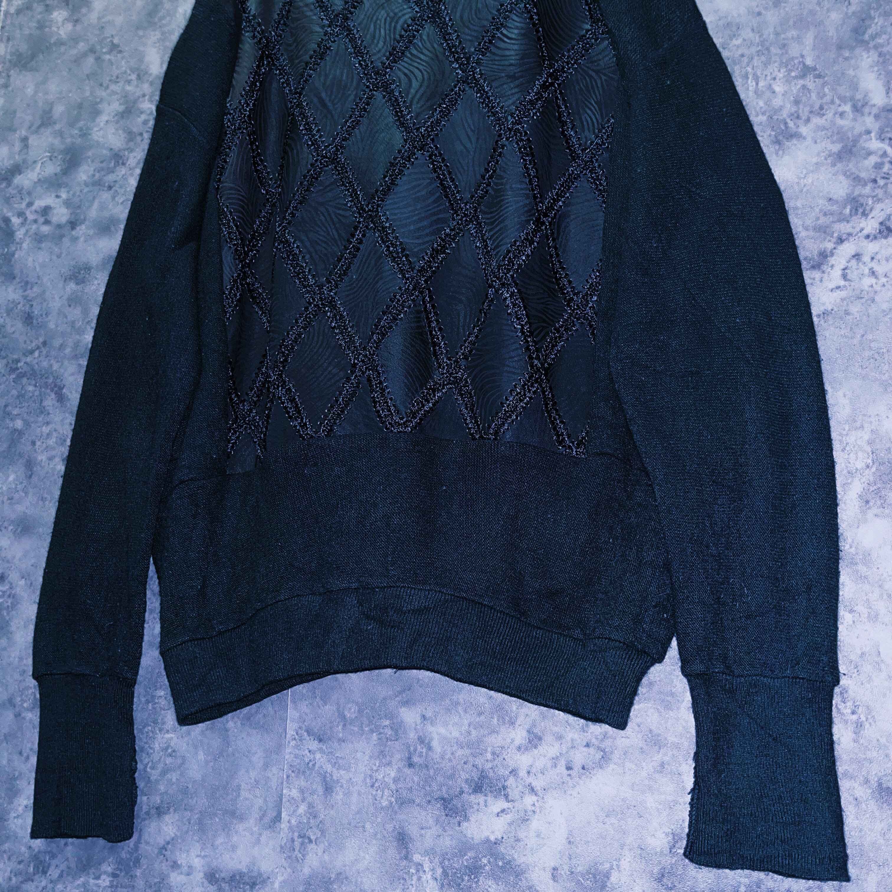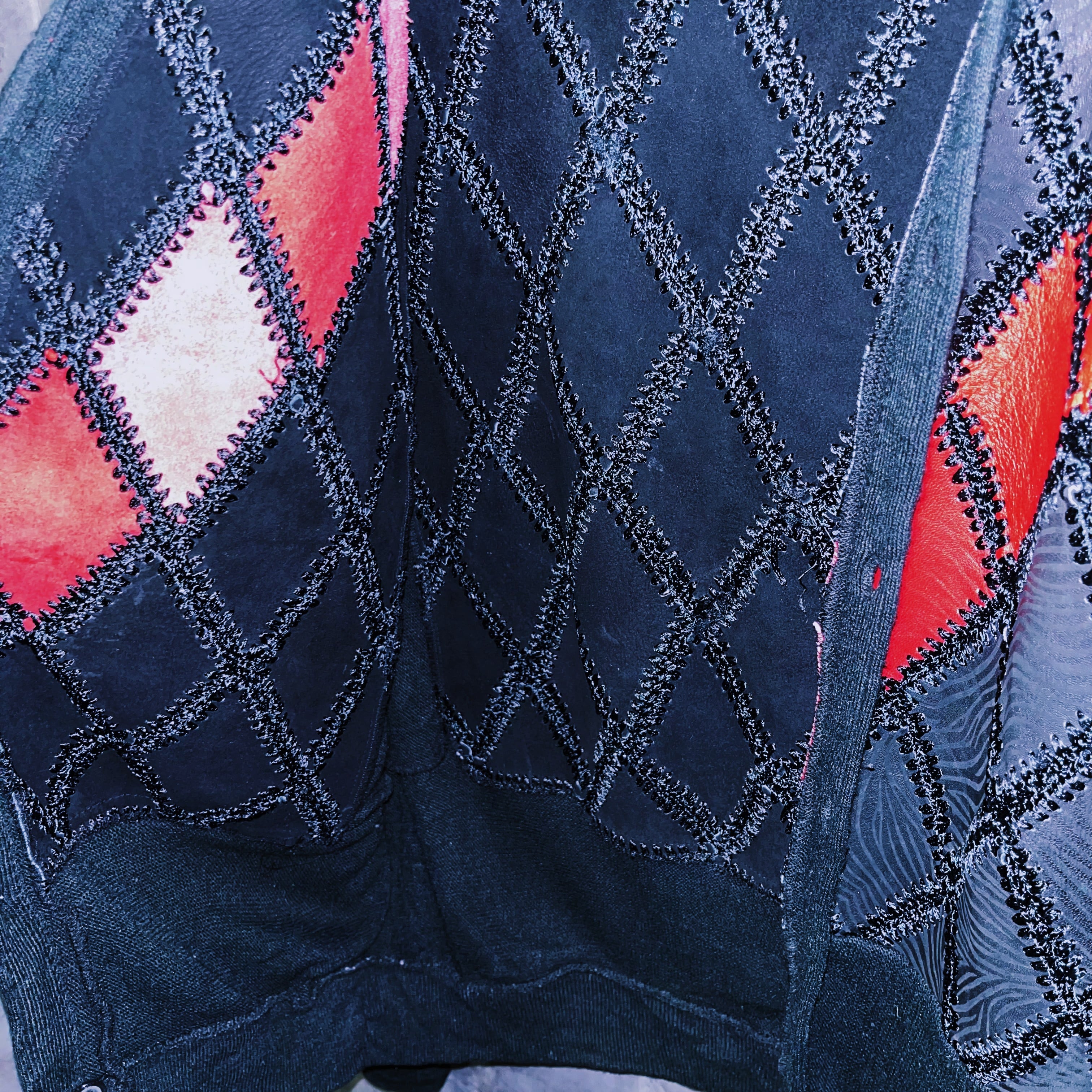 深いインディゴブルーのボディにさまざまなパッチが貼られたデザインのカーディガン。