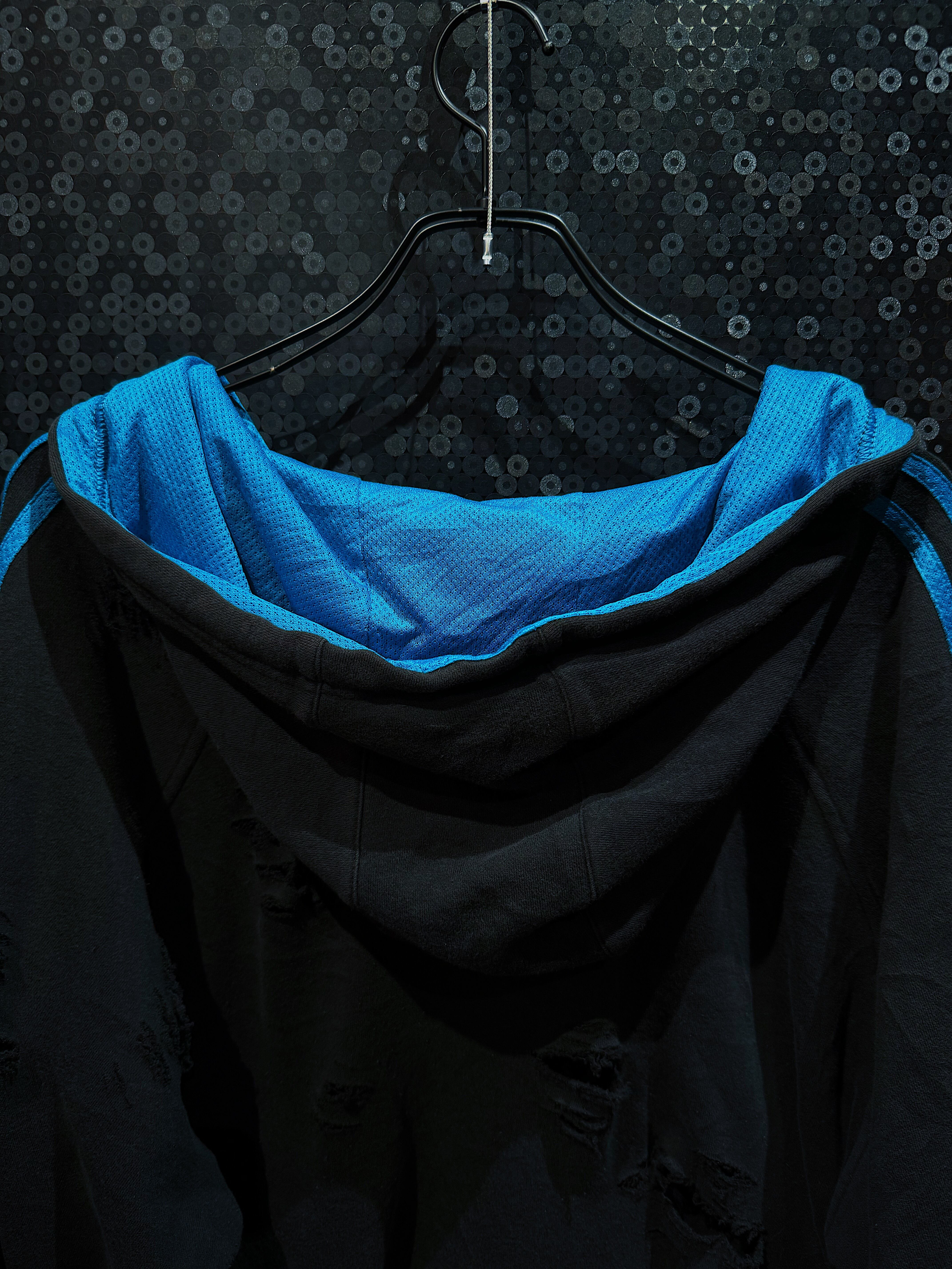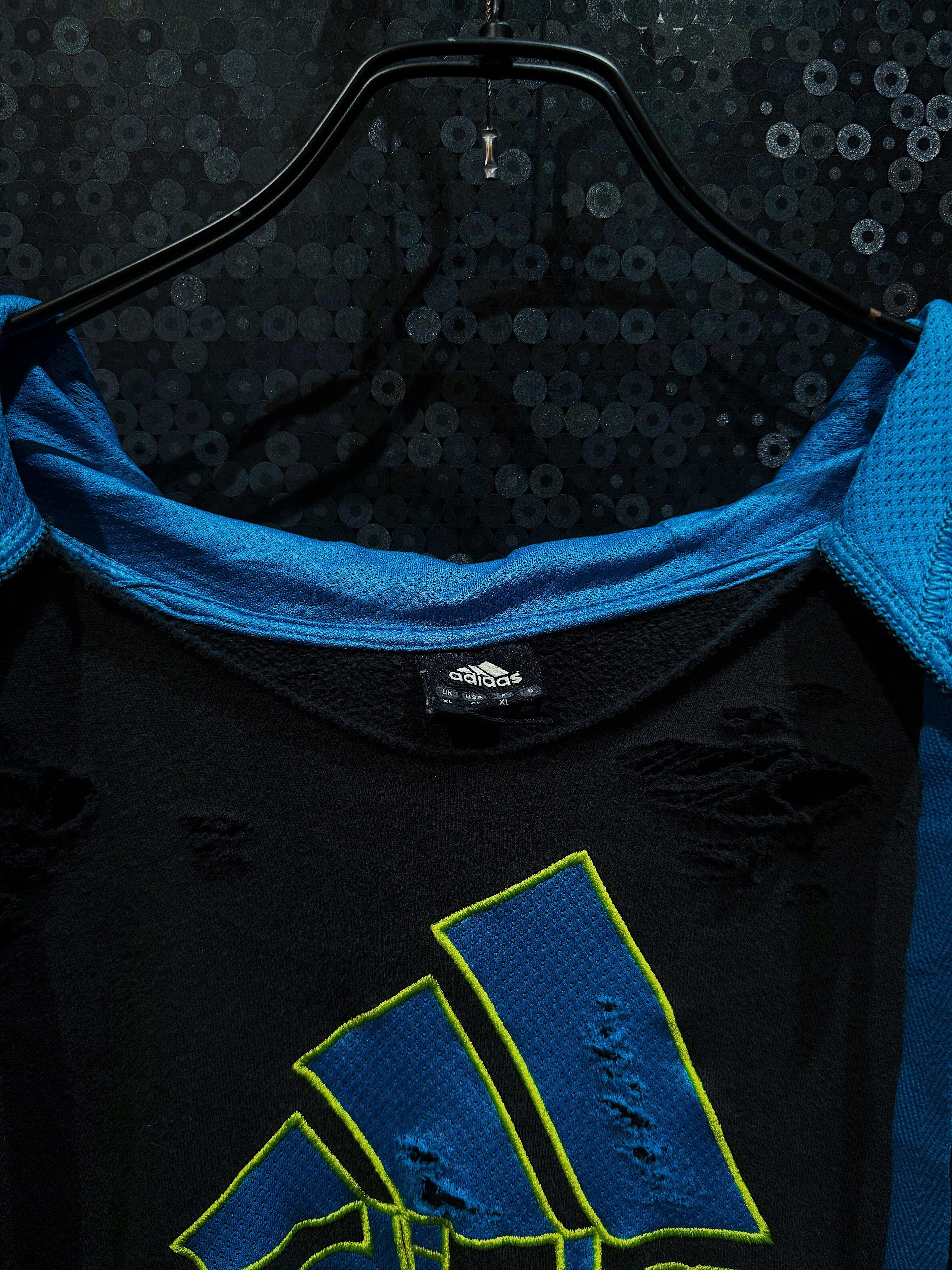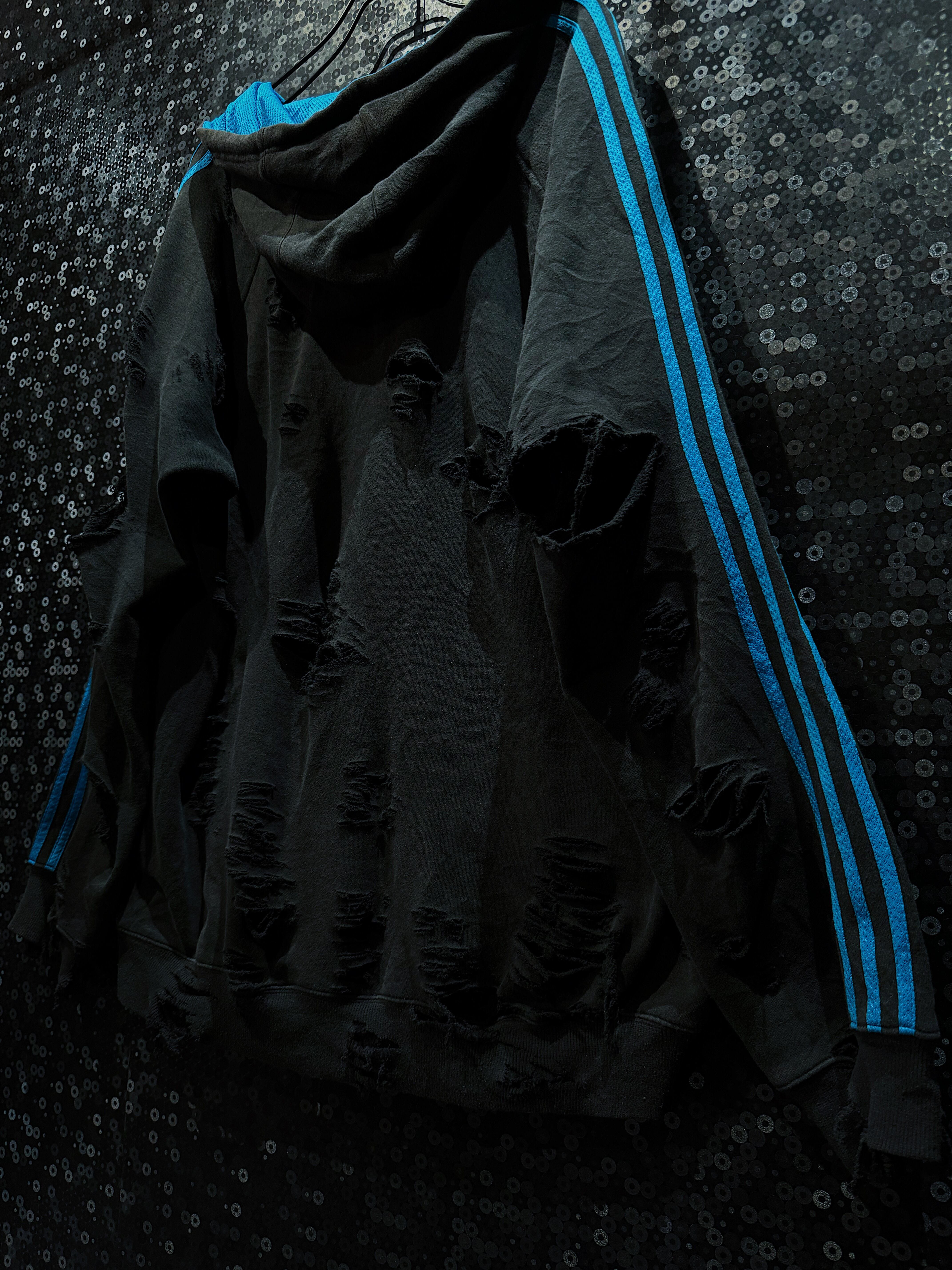 adidasの名作フーディーを、激しめのボロ加工によって“ただのスポーツウェア”から“着るアートピース”へと昇華させた逸品。ブラックのボディに鮮烈なネオングリーンとブルーのブランドロゴが刺さる存在感。