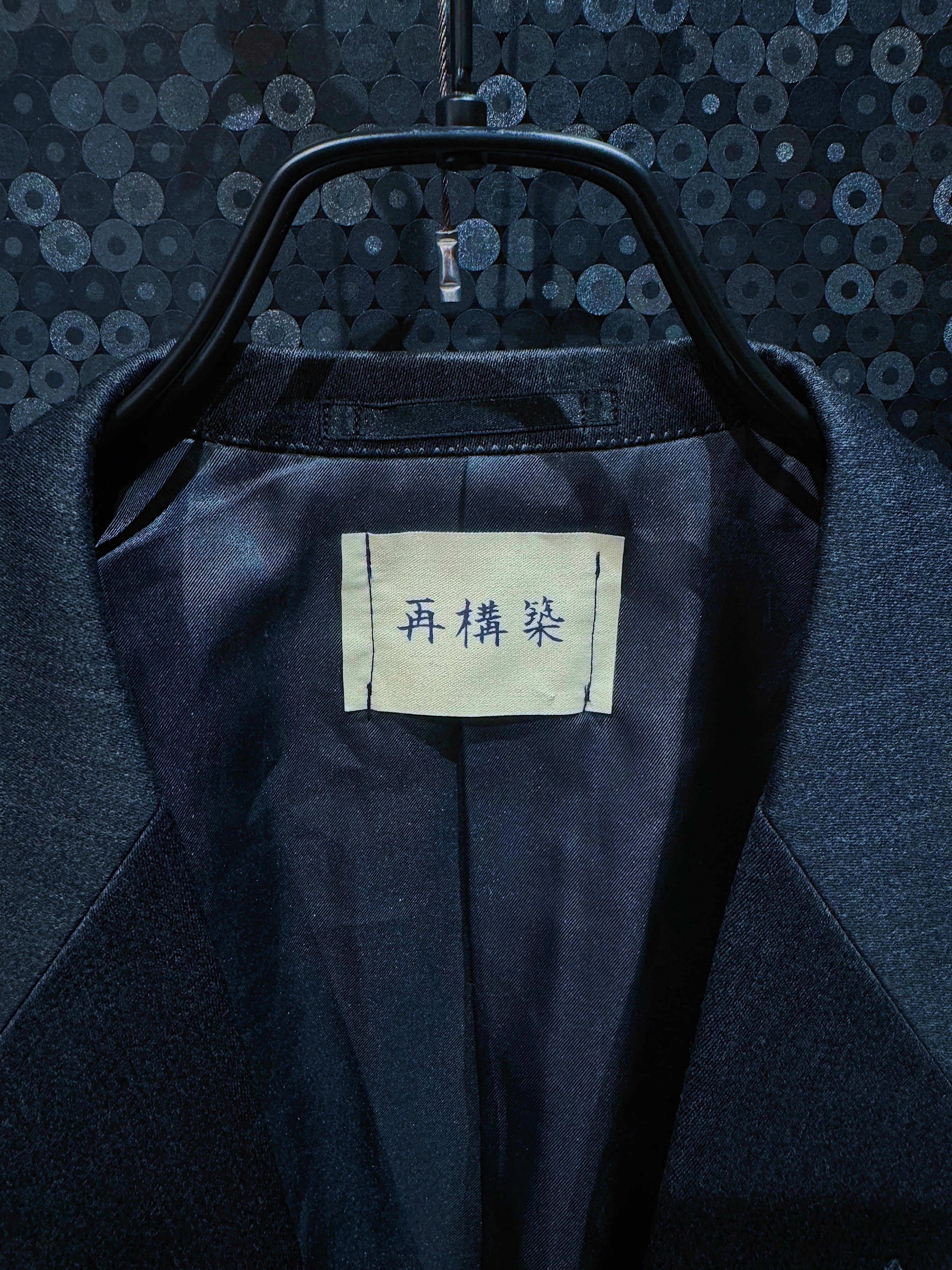 再倖築による本作は、黒に近い深いネイビートーンのテーラードジャケットに、ハンドステッチのような太めの白糸がフロントと袖ラインに大胆に縫い込まれた一着。