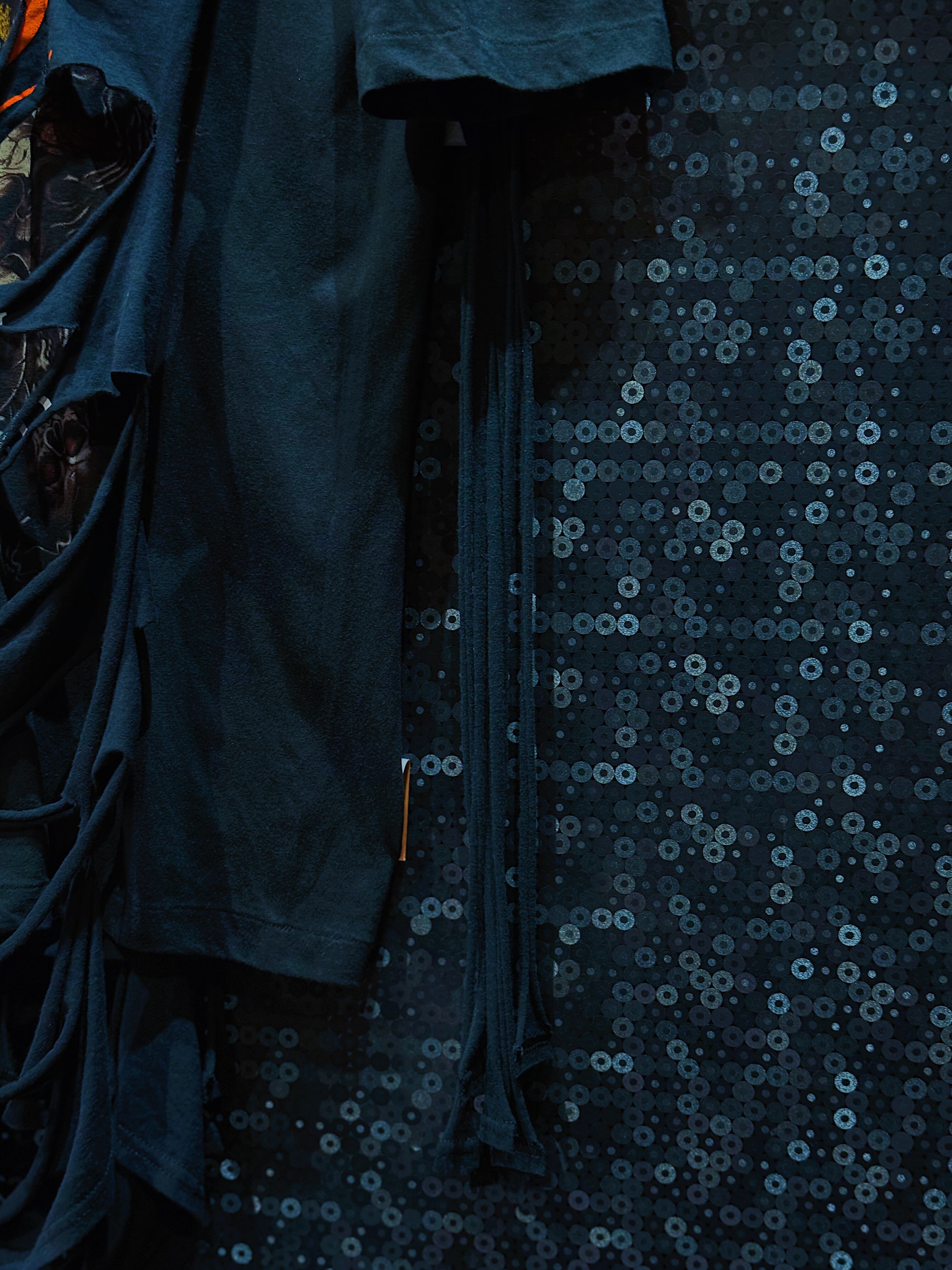 フロントは無数のホールカットと解体によって、もはや「着る彫刻」とも言える造形へと昇華。バックスタイルも圧巻で、細かく裂いたフリンジ状の生地が垂れ下がり、揺れ動くたびに異なる表情を見せる。